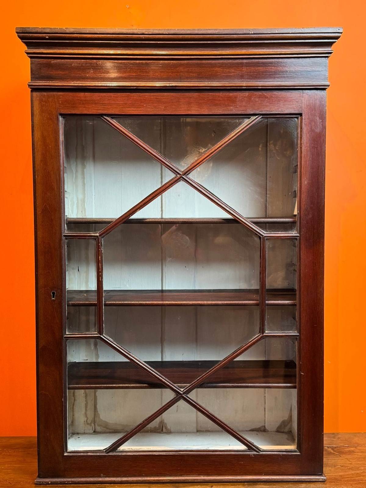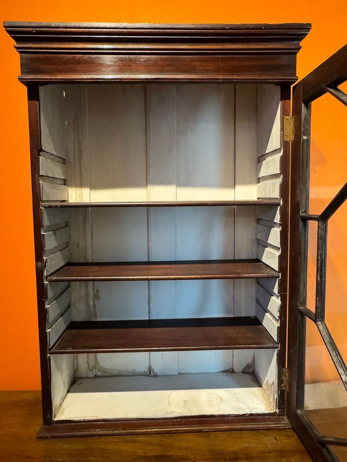 A 19th Century mahogany wall cabinet, 19th Century, with single astragal glazed door, the painted interior with three adjustable mahogany shelves. The painted interior is stained but can easily be re-painted in a colour.