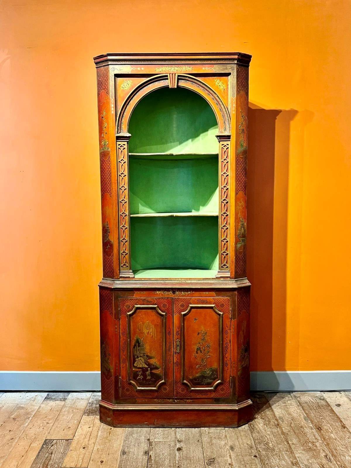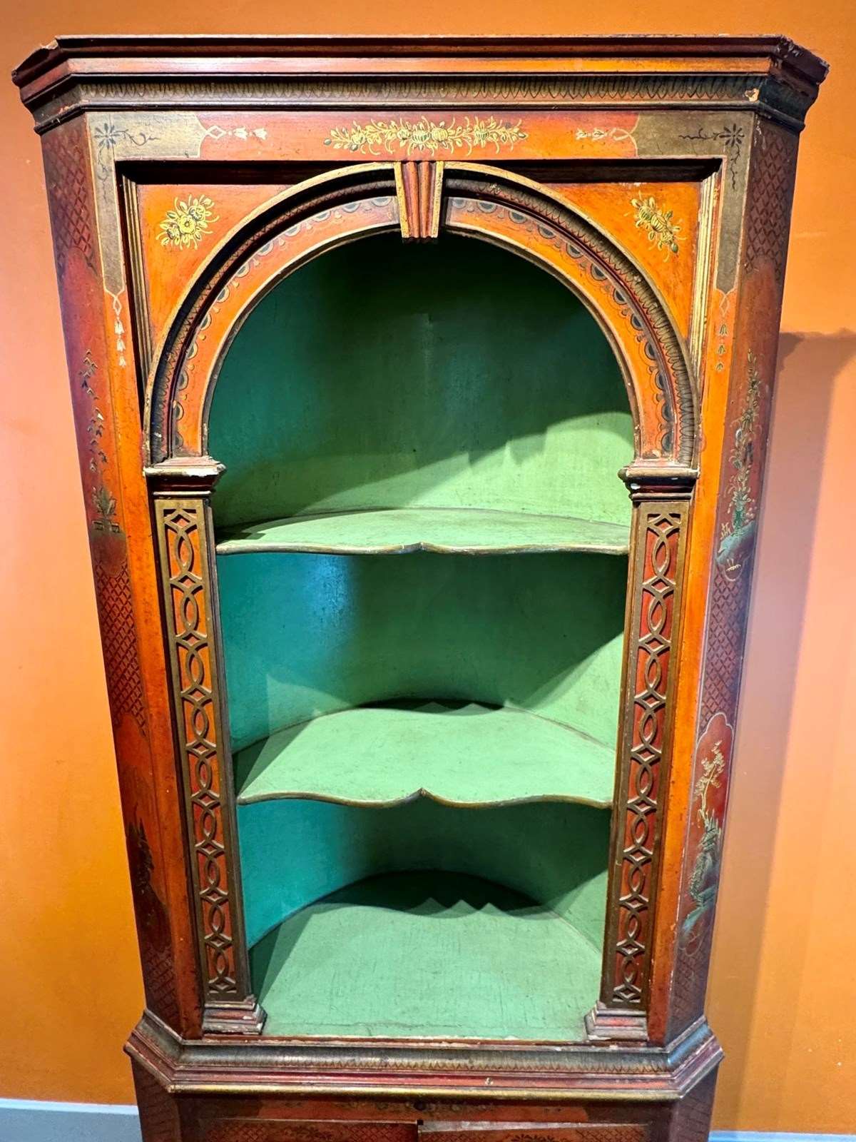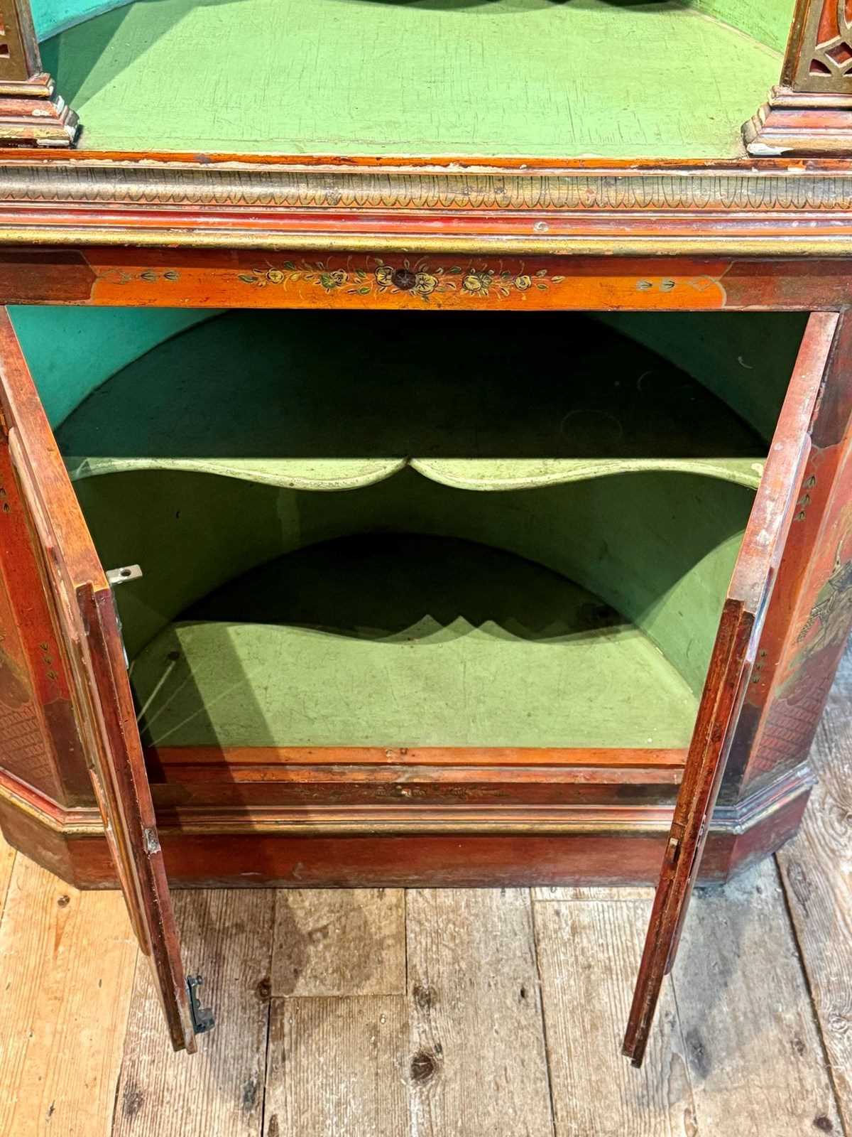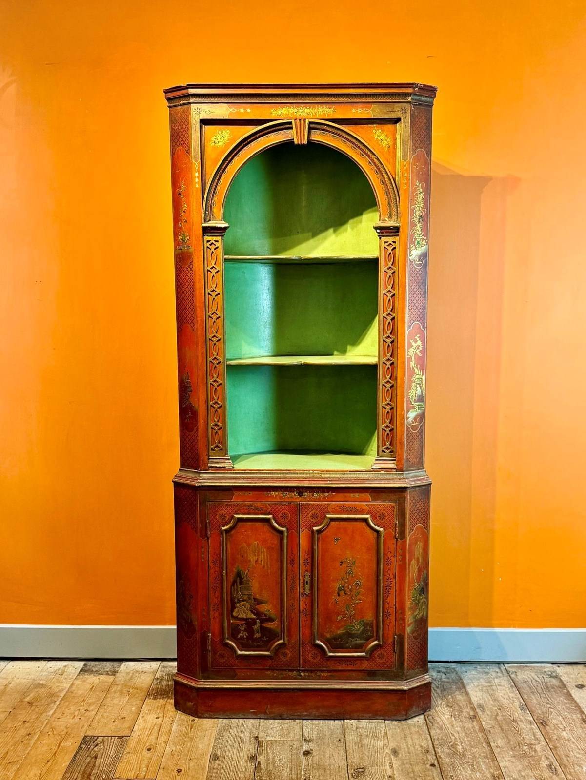 An antique gilt-decorated red chinoiserie corner cupboard, circa 1910-20, the top with shaped open shelves flanked by blind-fred columns, the base with a pair of panel doors, with original green painted interior.