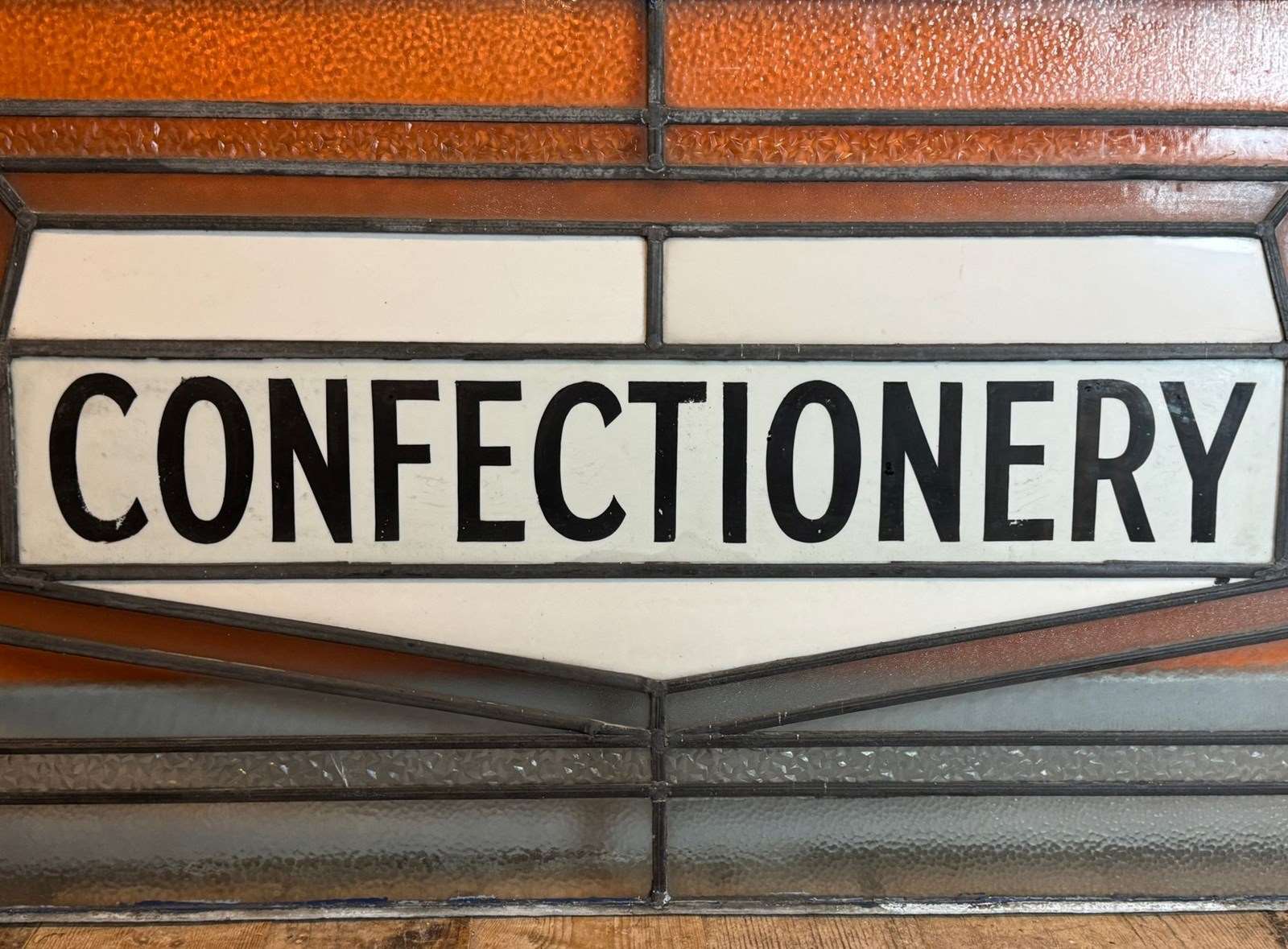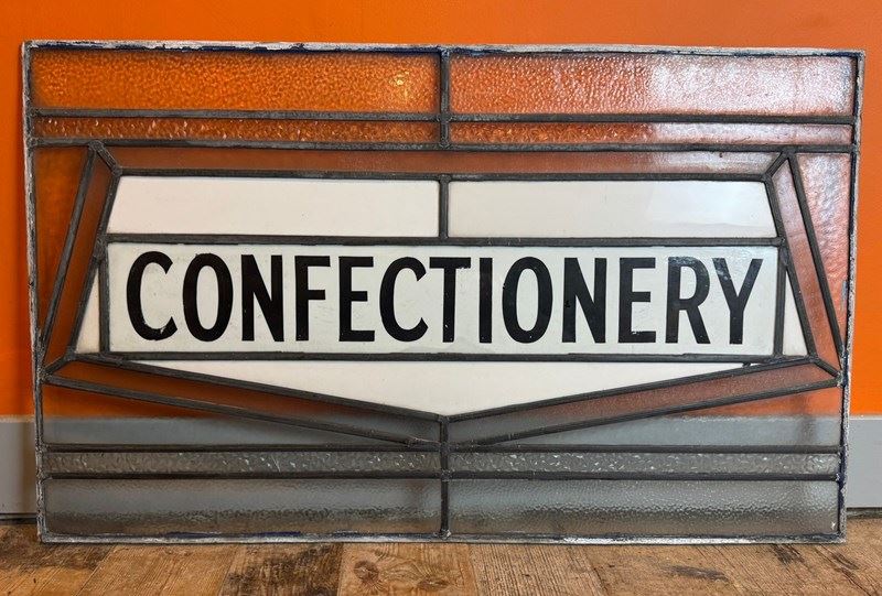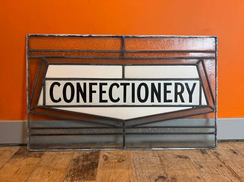 A reverse cut glass and painted shop window panel, circa 1920, the central cut glass panel titled CONFECTIONERY in black paint on an opaque white glass ground and within clear and textured leaded glass borders.