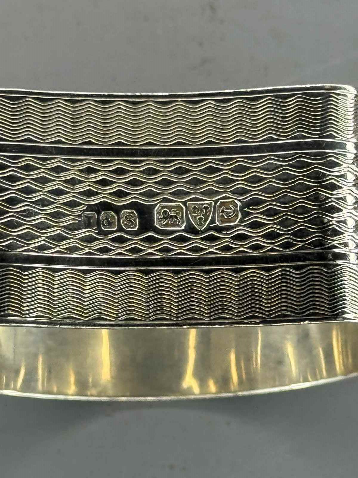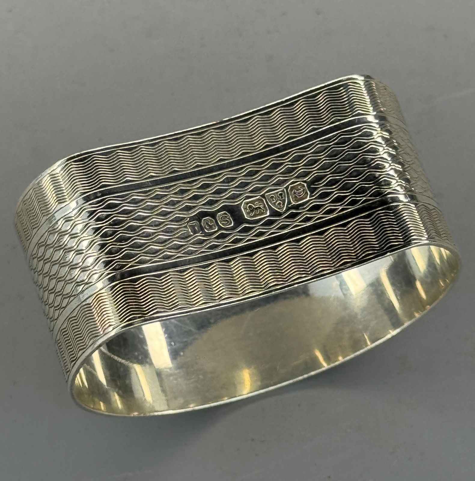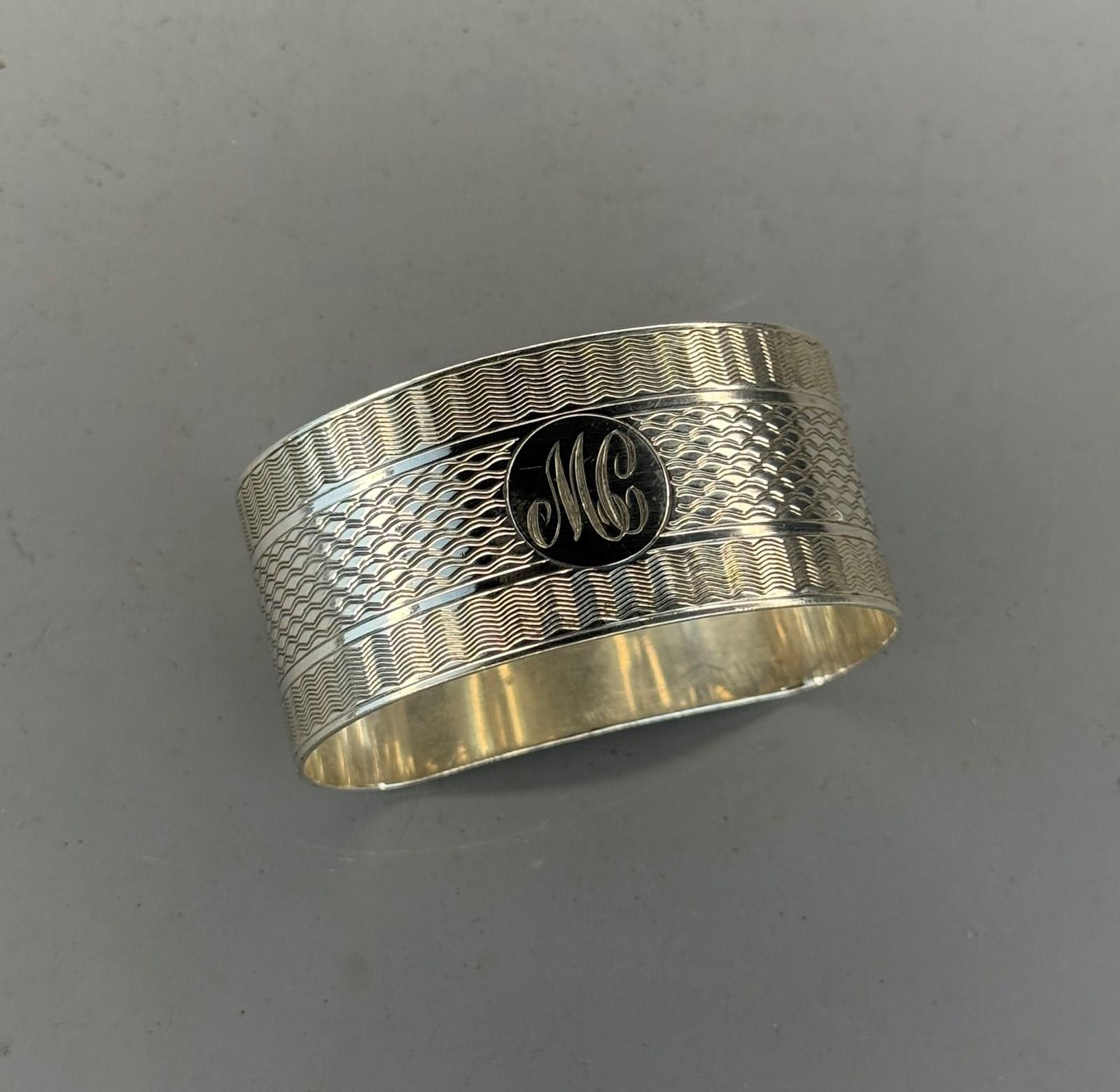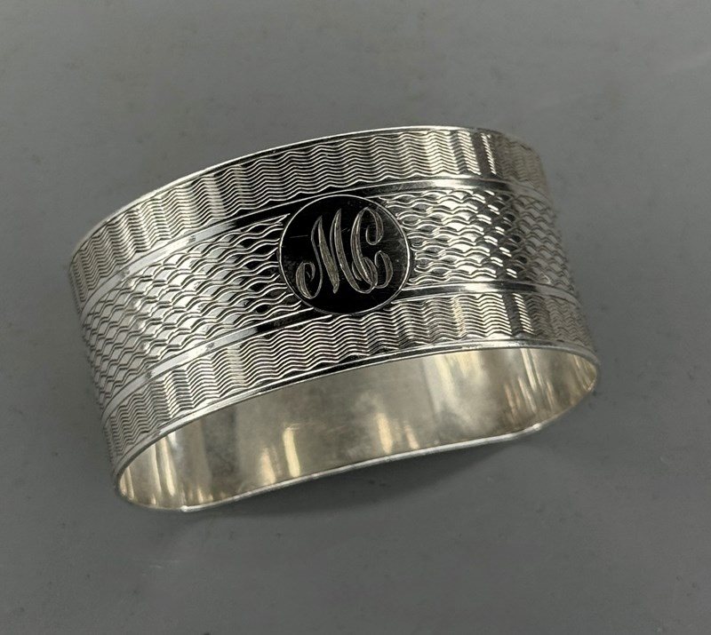 A silver napkin ring, Chester 1928?, makers mark T&S, of D-shape with engine turned decoration, the central reserve with the engraved initials 'MC'.