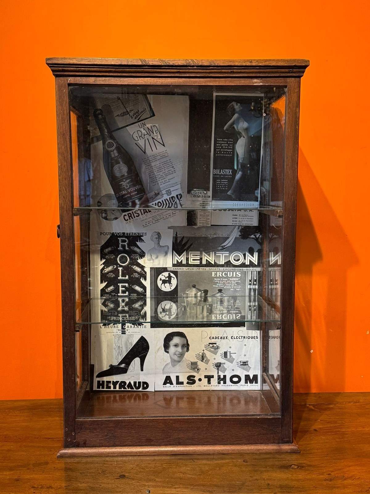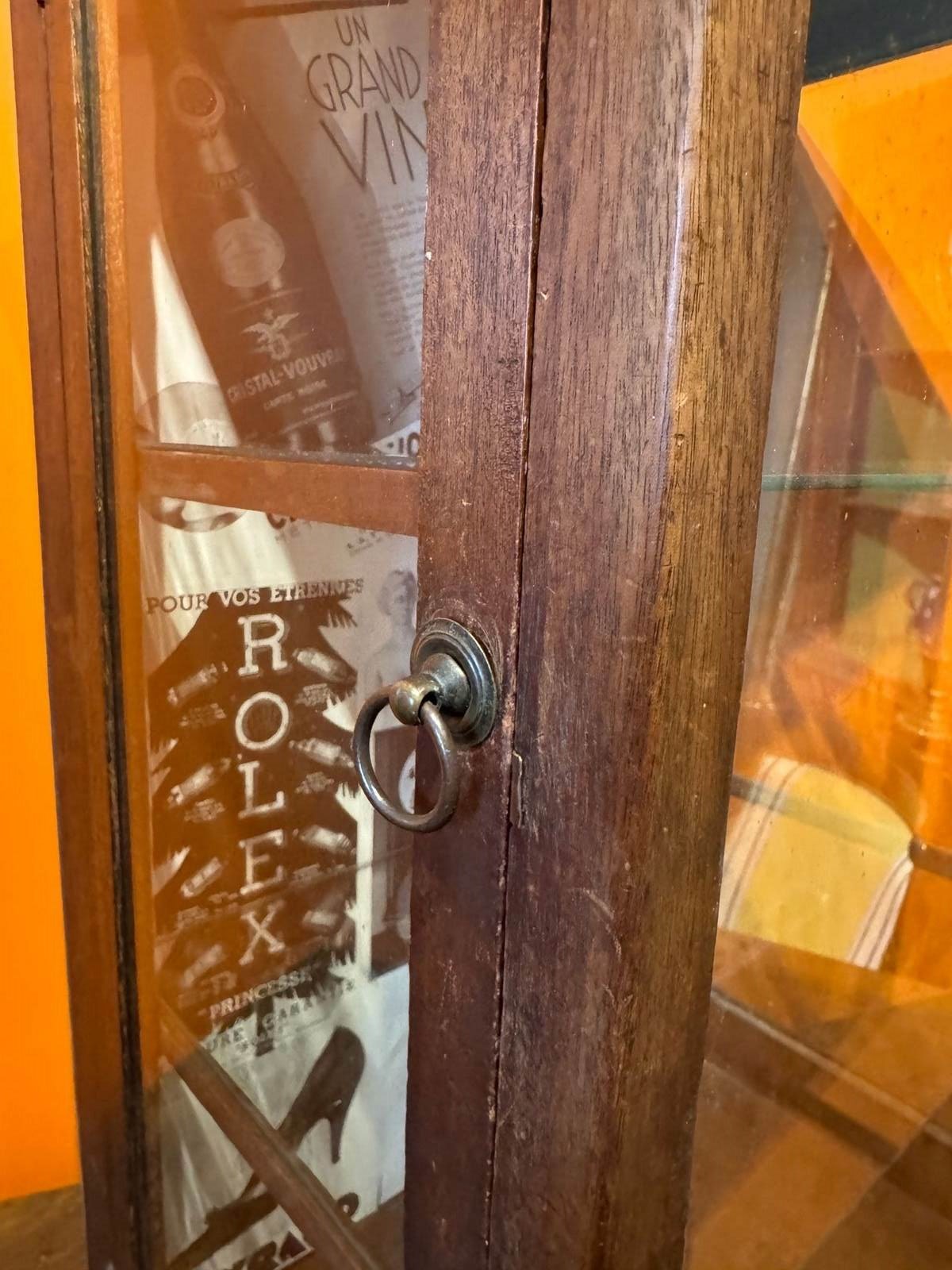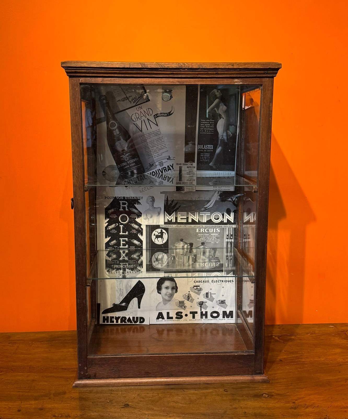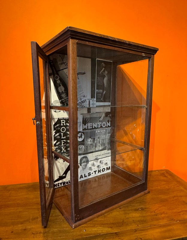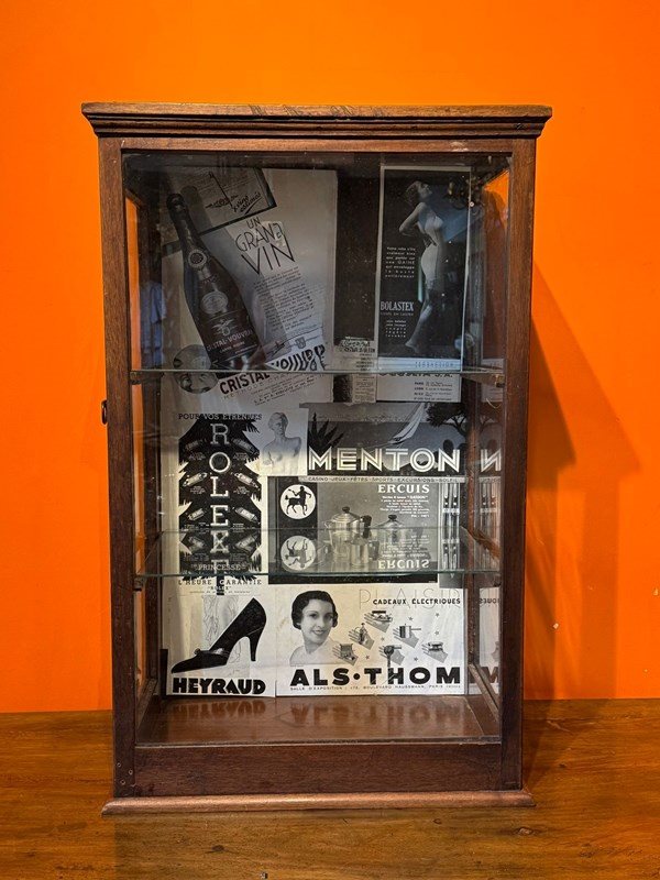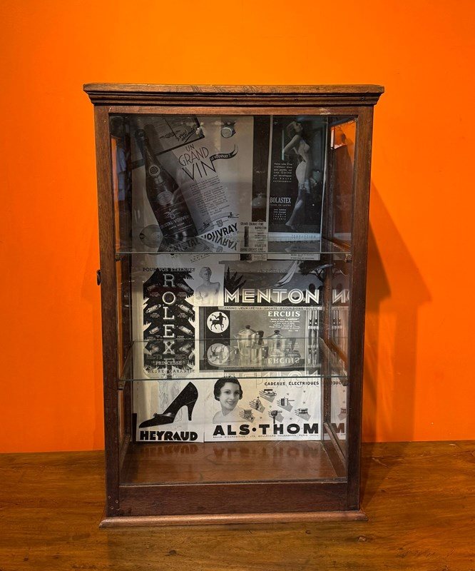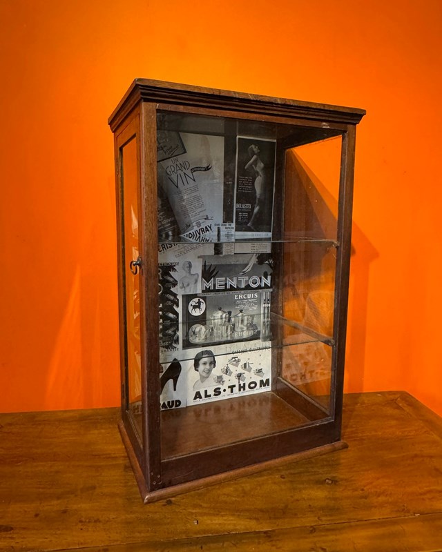 An antique table-top side-opening shop display cabinet, with glazed front and sides, and fitted with two glass shelves, the inside back of the cabinet is plasted with advertising pages from a French magazine.