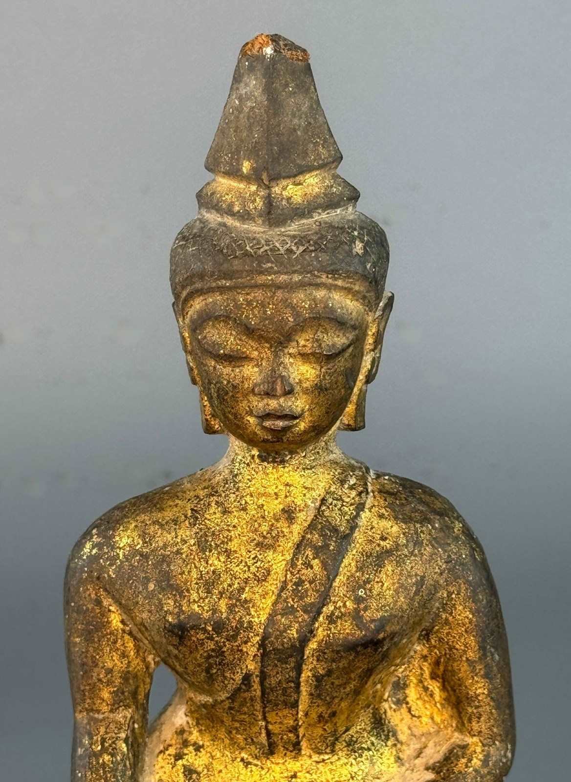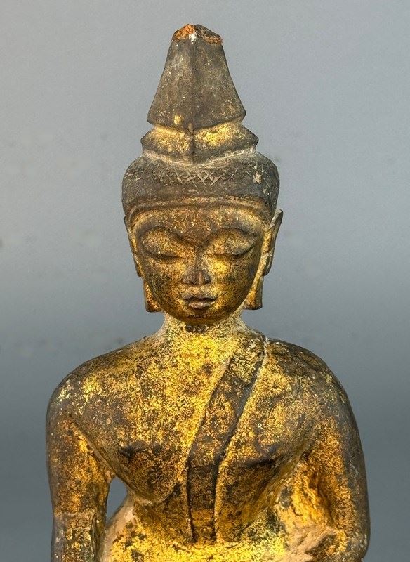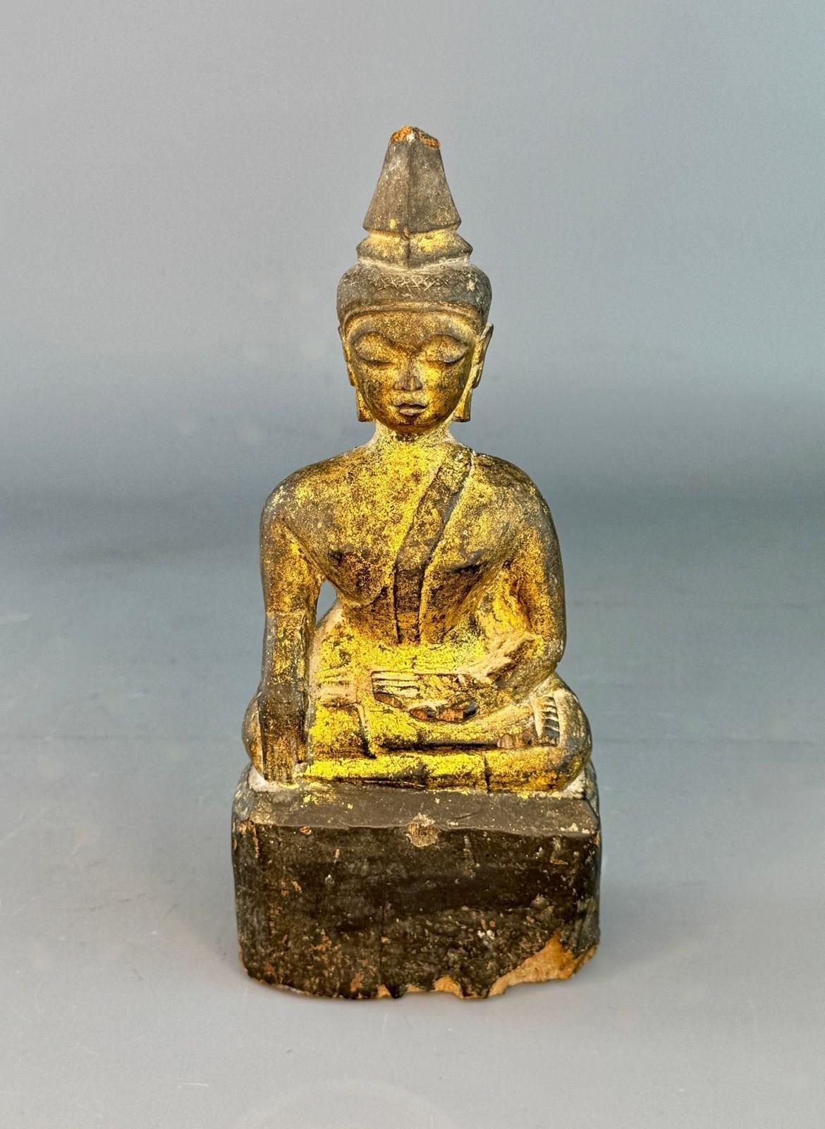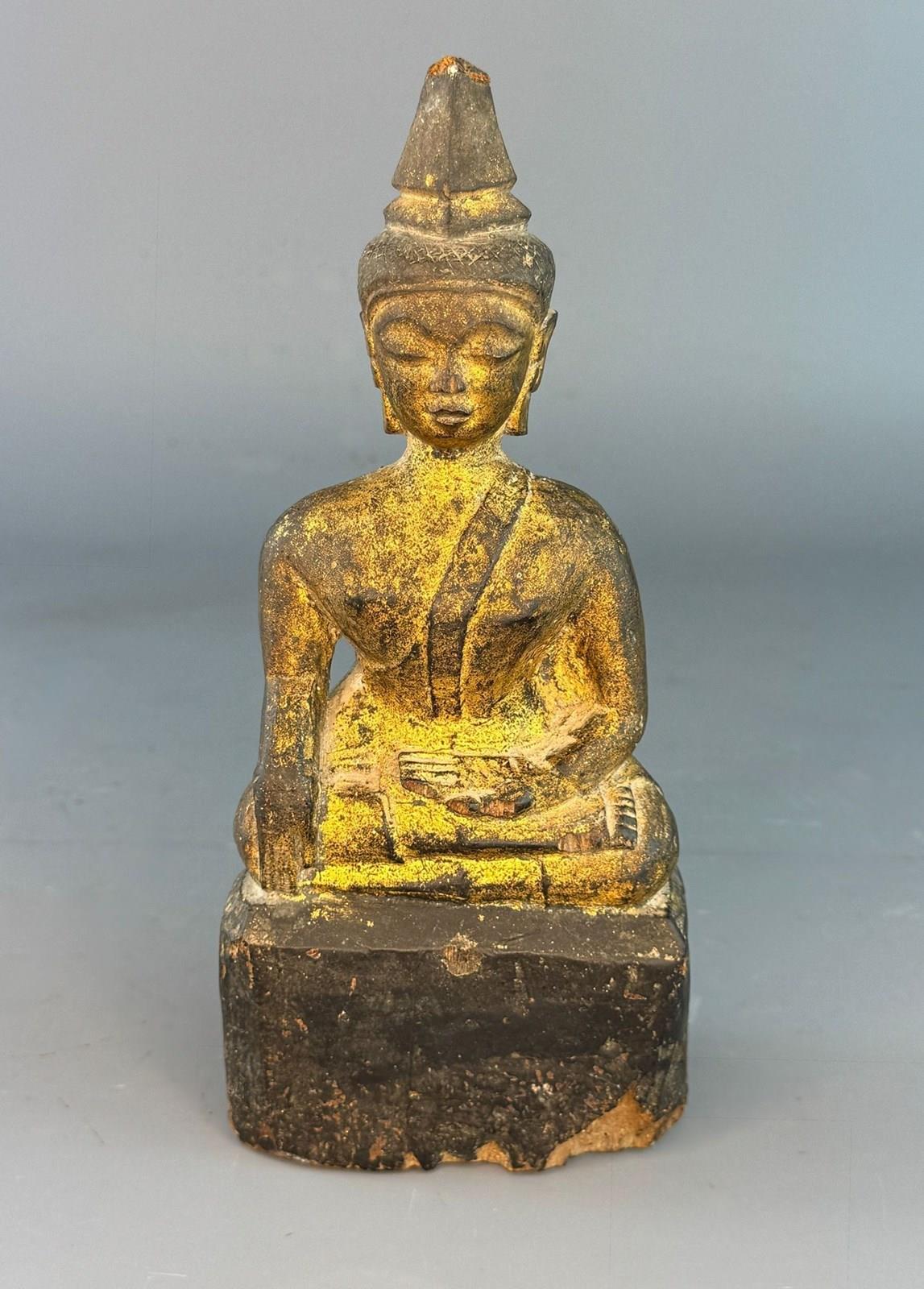 An Antique Thai carved and gilded wooden Buddha, 19th Century, seated in Padmasana with hands in Bhumisparsha mudra.