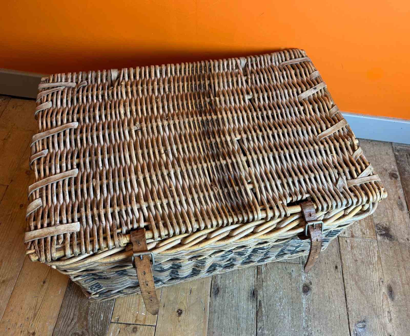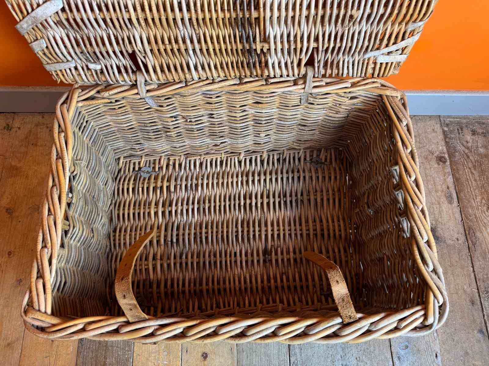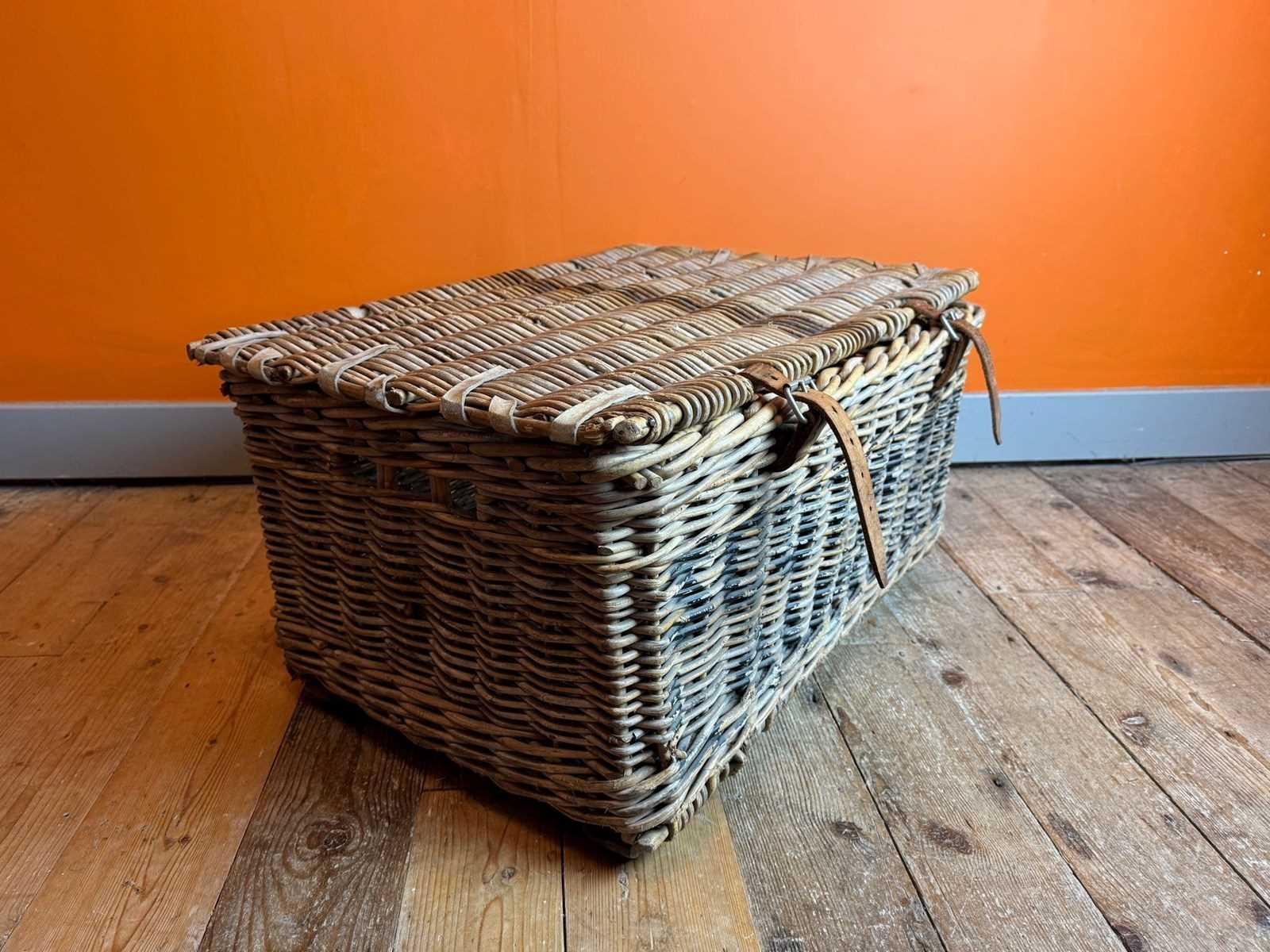 An Antique wicker commercial laundry basket, with original leather straps and wooden runners. In sturdy condition with clean interior.