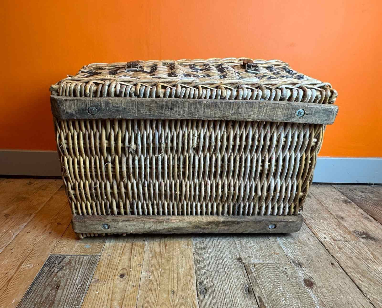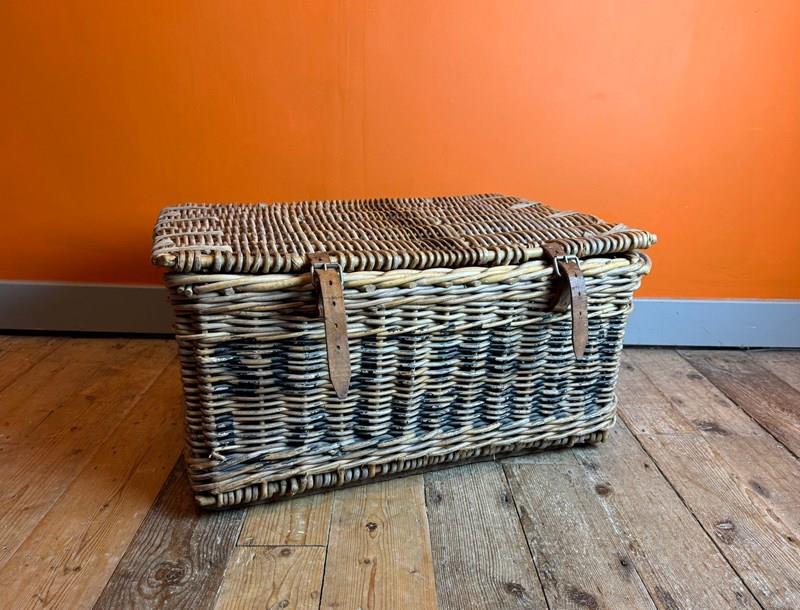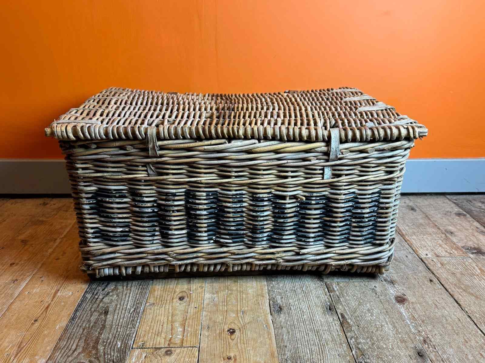 An Antique wicker commercial laundry basket, with original leather straps and wooden runners. In sturdy condition with clean interior.