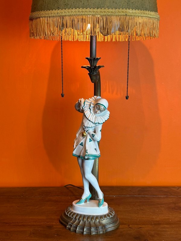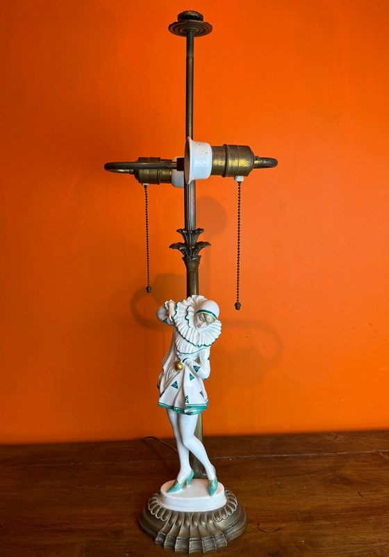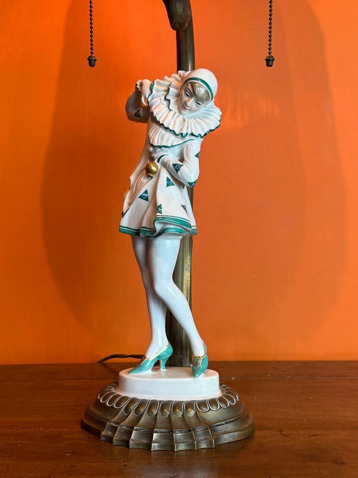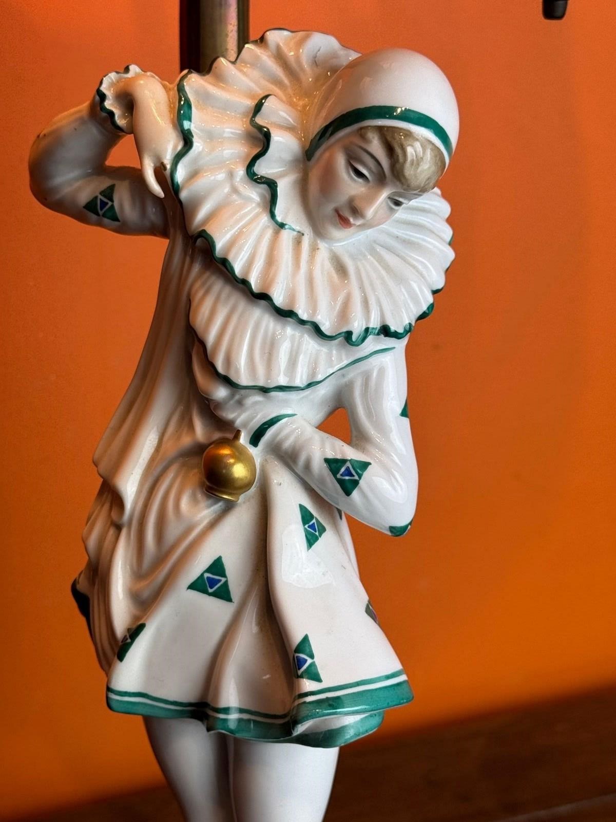 An Art Deco Rosenthal porcelain figural lamp of a Pierrette, circa 1920, designed by Constantin Holzer-Defanti (Austrian 1881-1951) modelled after the German dancer Anita Berber wearing a Pierrette costume with a white and green zigzag pattern, mounted on its original brass base and lamp support with a pair of bulb holders with brass ball chains to operate the lamp.