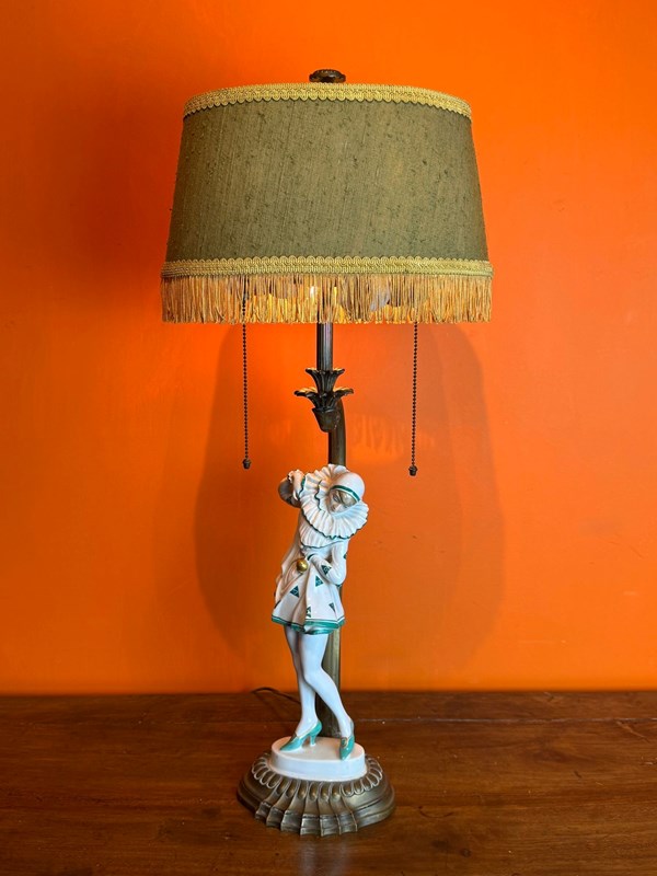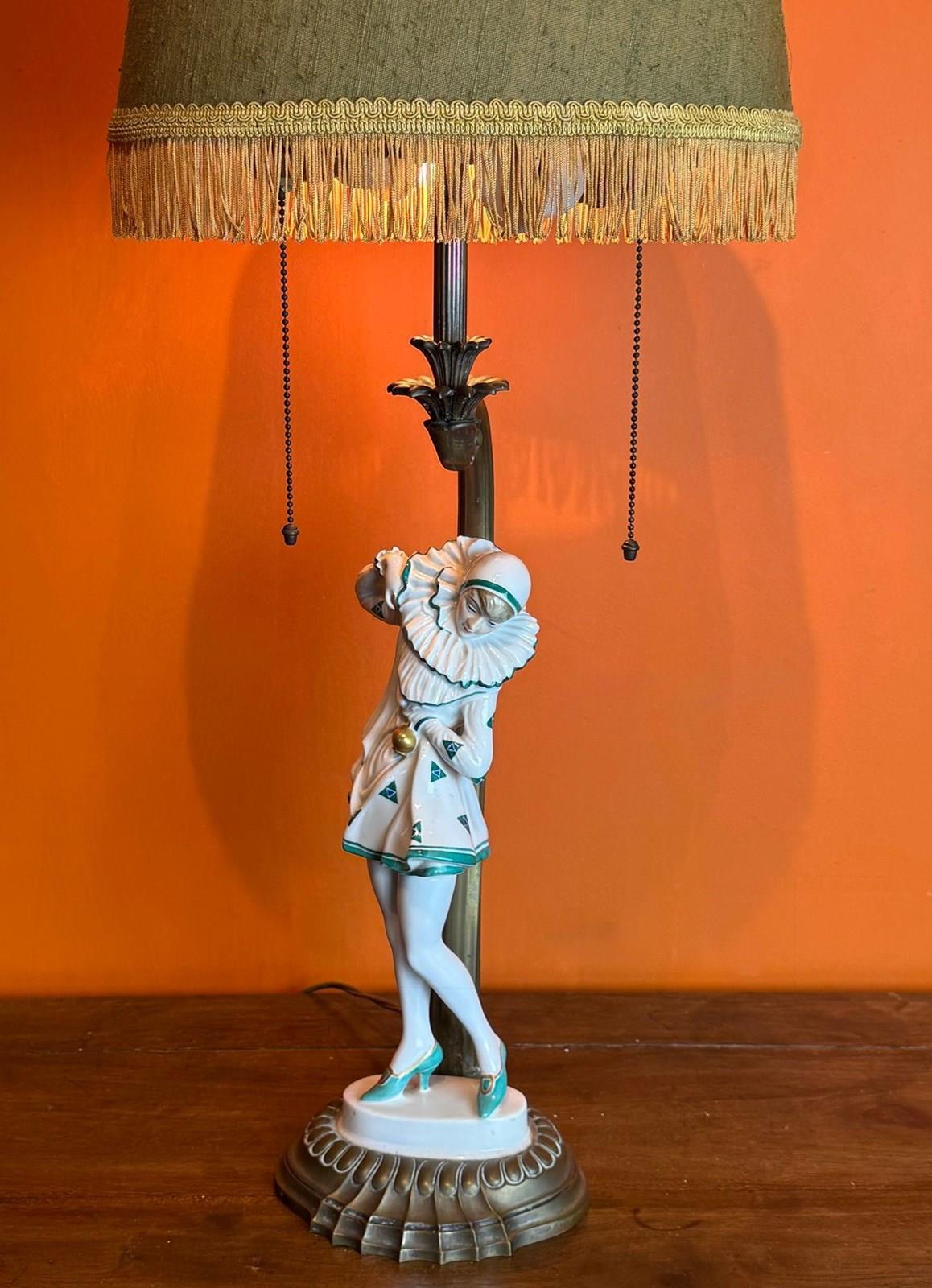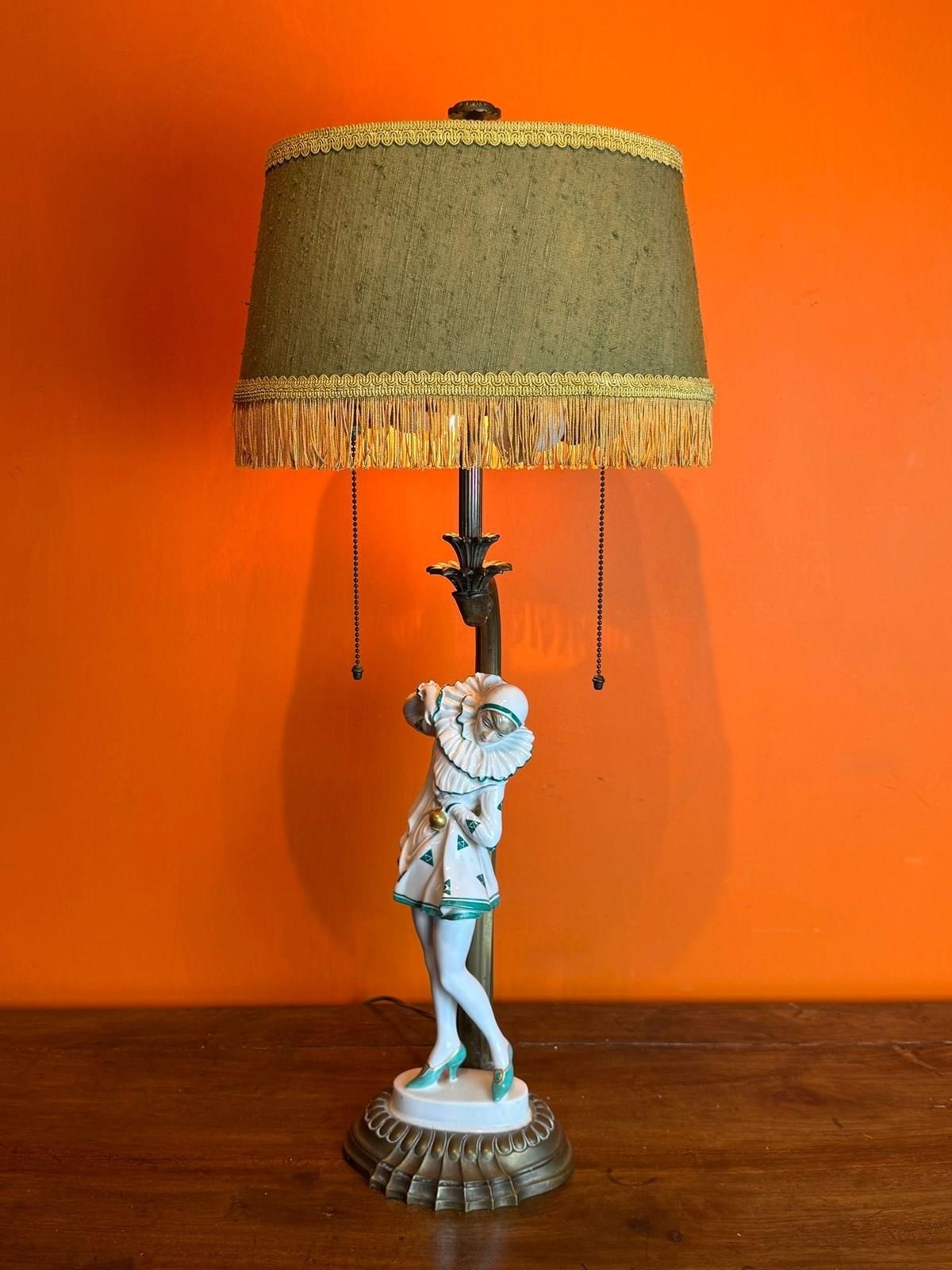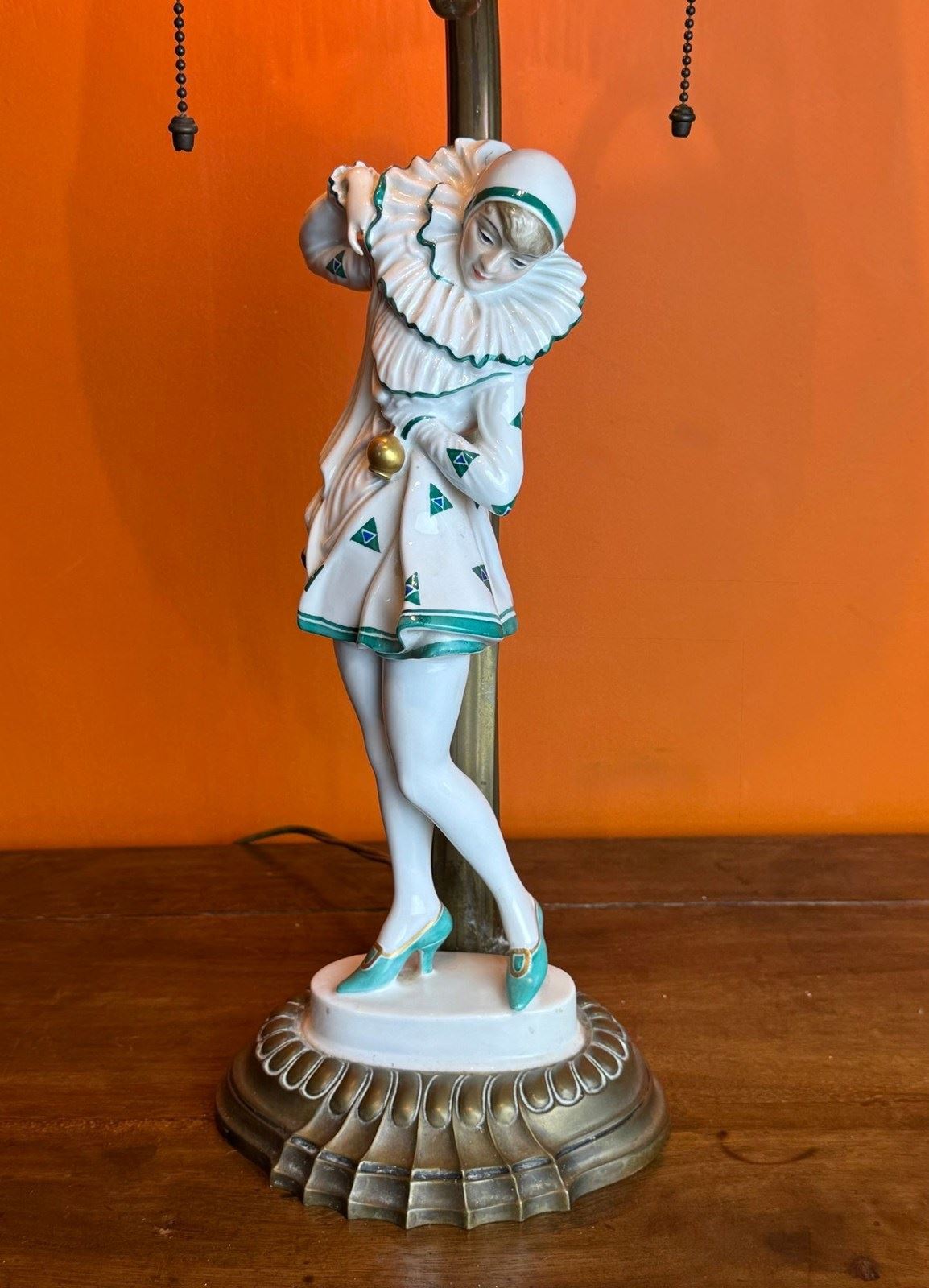 An Art Deco Rosenthal porcelain figural lamp of a Pierrette, circa 1920, designed by Constantin Holzer-Defanti (Austrian 1881-1951) modelled after the German dancer Anita Berber wearing a Pierrette costume with a white and green zigzag pattern, mounted on its original brass base and lamp support with a pair of bulb holders with brass ball chains to operate the lamp.