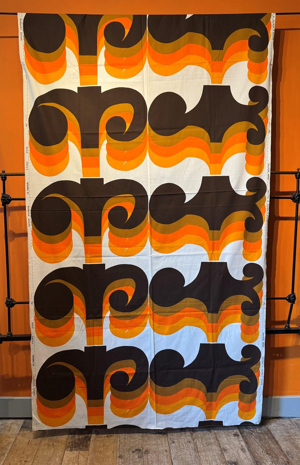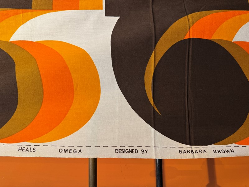 Barbara Brown 'Omega' designed in 1965 for Heals, 4.84 metres of unused furnishing fabric printed with large volutes in browns, orange and white.