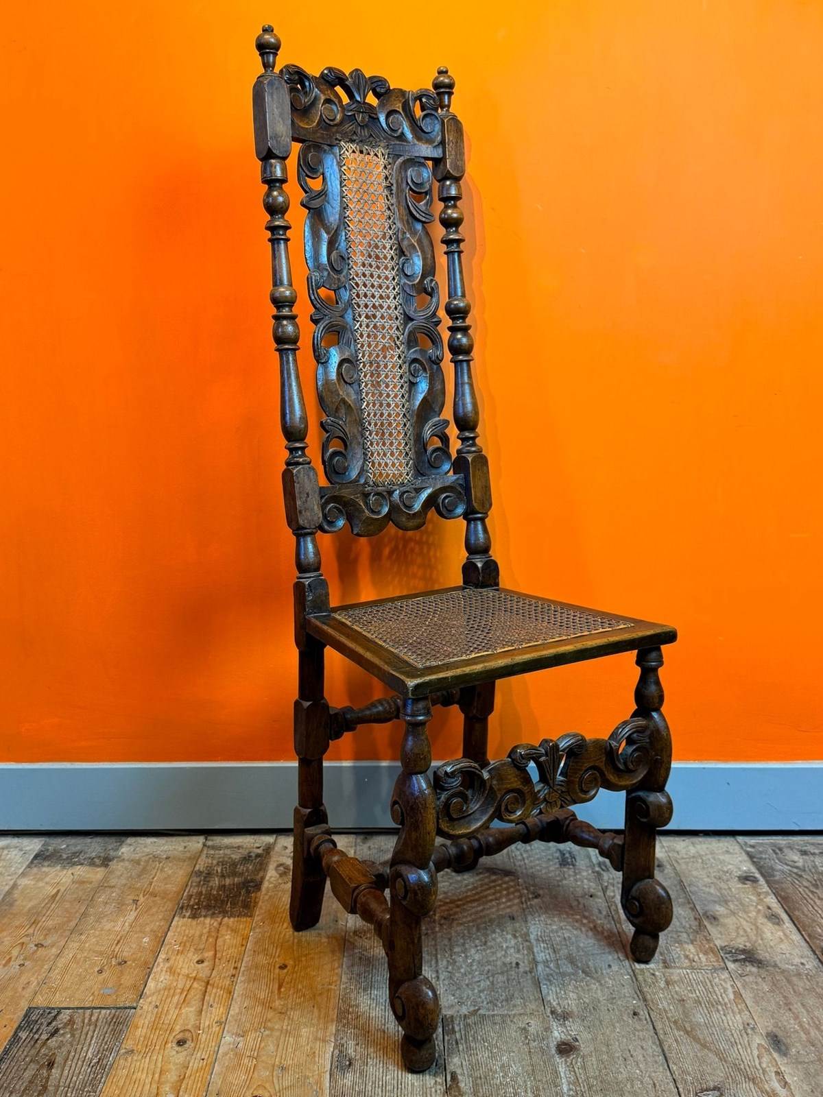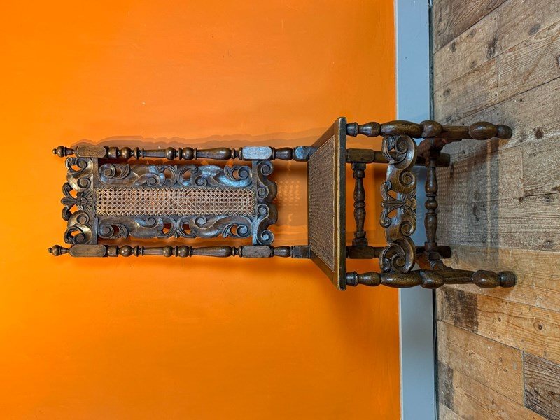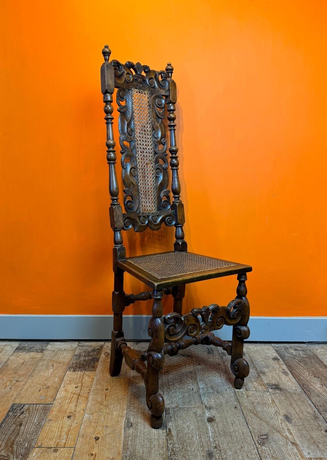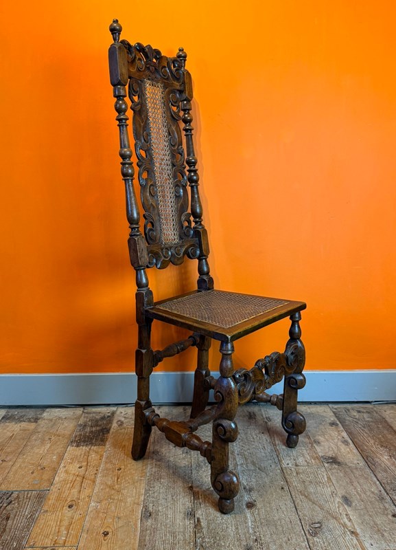 A Charles II carved walnut highback chair, the carved toprail over a caned panel flanked by scroll carving and bobbin turned supports, the cane seat upon bobbin turned supports joined by a scroll carved front stretcher over an H-shaped and back stretcher.