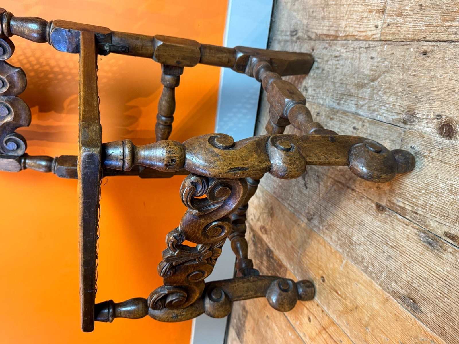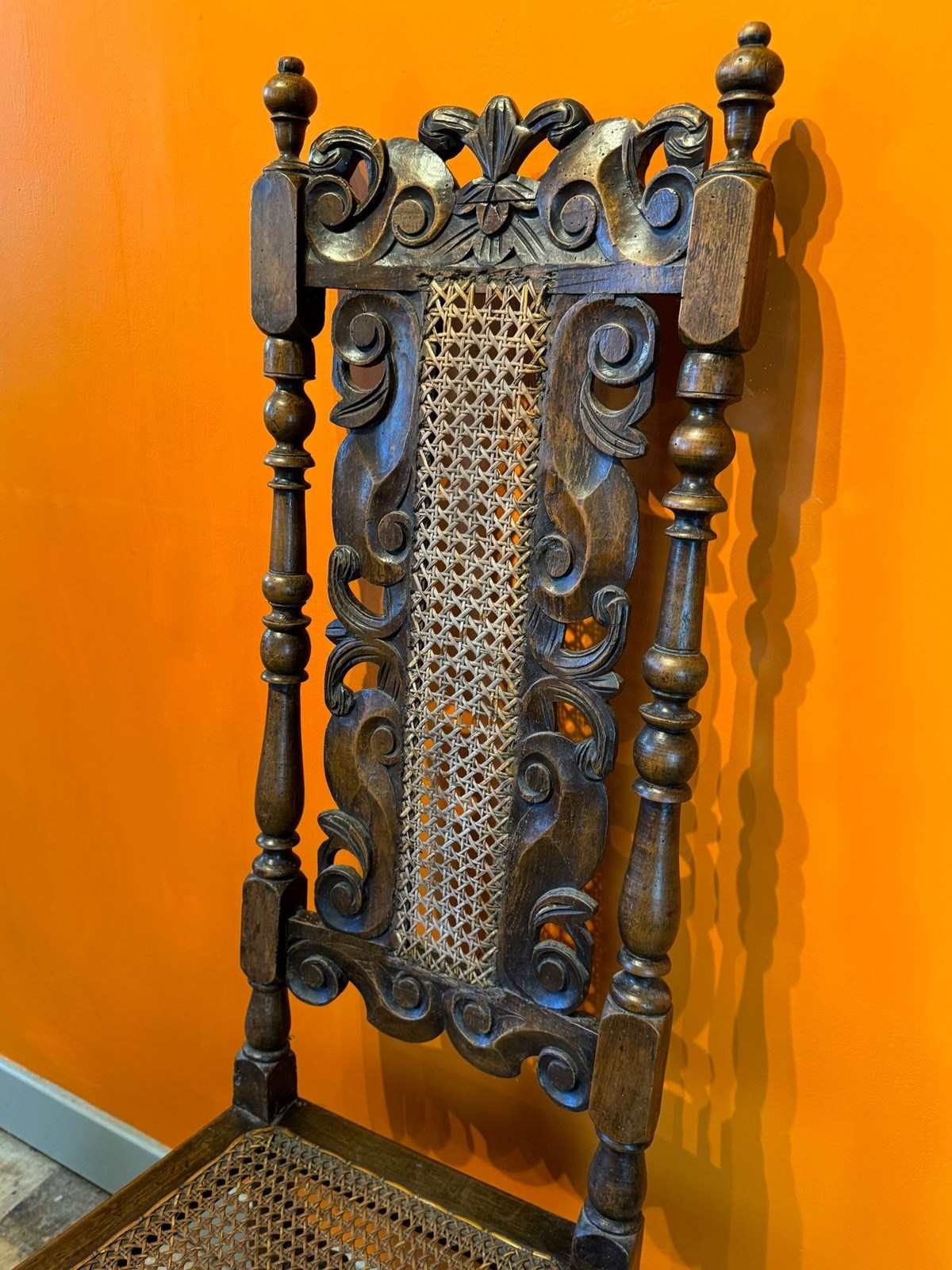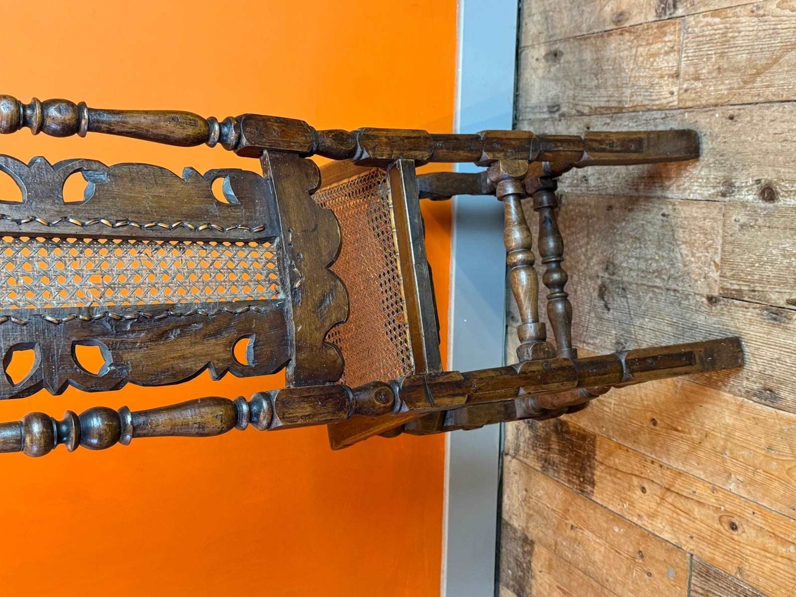 A Charles II carved walnut highback chair, the carved toprail over a caned panel flanked by scroll carving and bobbin turned supports, the cane seat upon bobbin turned supports joined by a scroll carved front stretcher over an H-shaped and back stretcher.