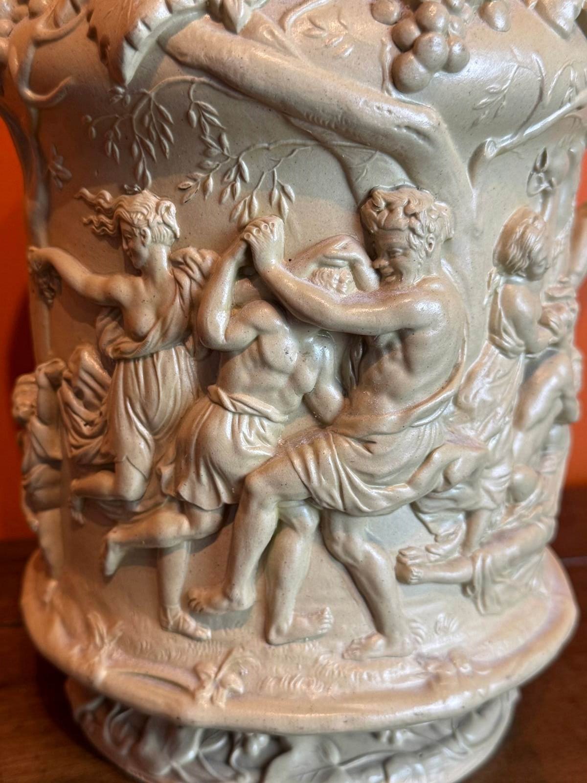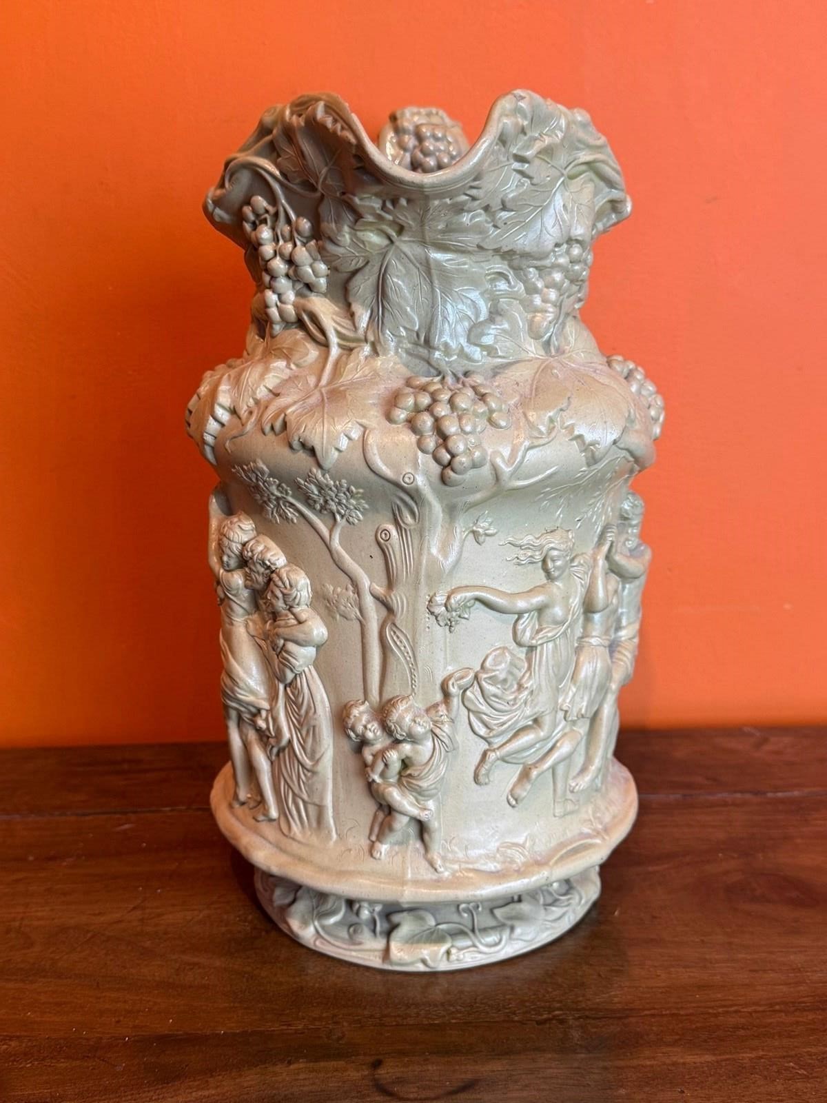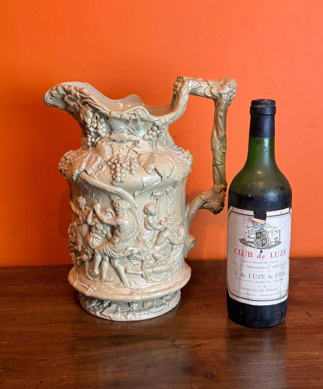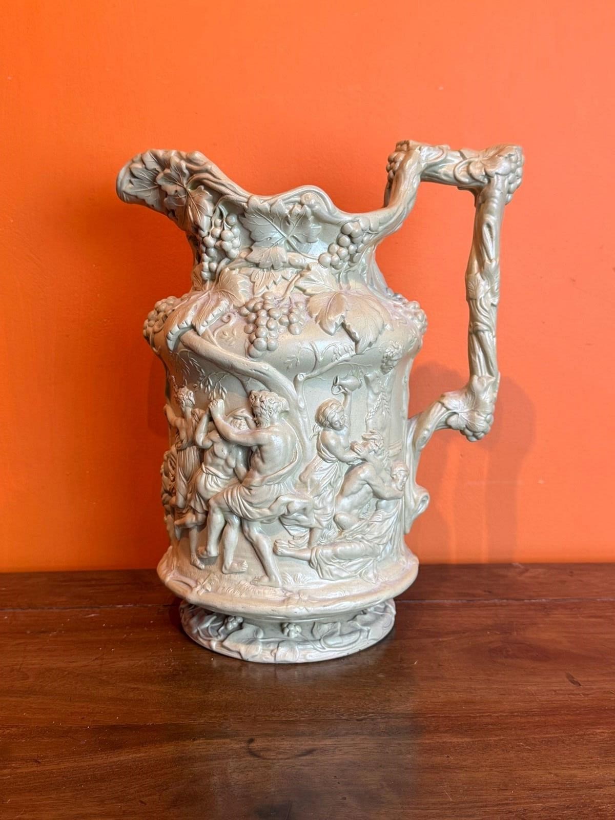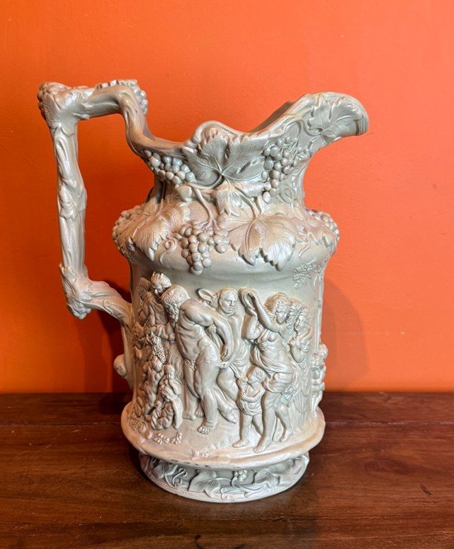 A large Charles Meigh buff-coloured stoneware jug, circa 1840, moulded in high relief with the 'Bacchanalian Dance' pattern inspired by the paintings of Pouisin and Reubens.