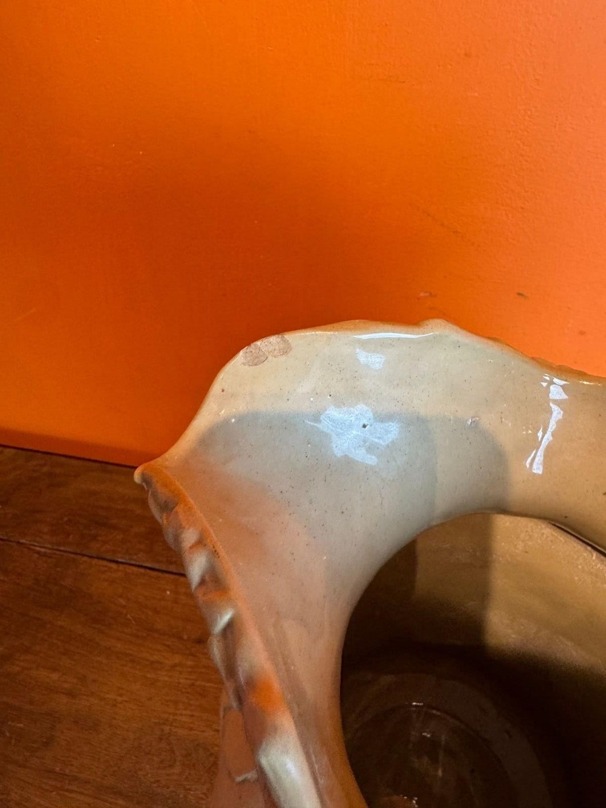 Condition: Clean overall with no staining, small chip to the inner rim of the spout, hairlaine crack to the underside of edge of the base on one side, hairline crack around one side of the handle where it meets the body of the jug.