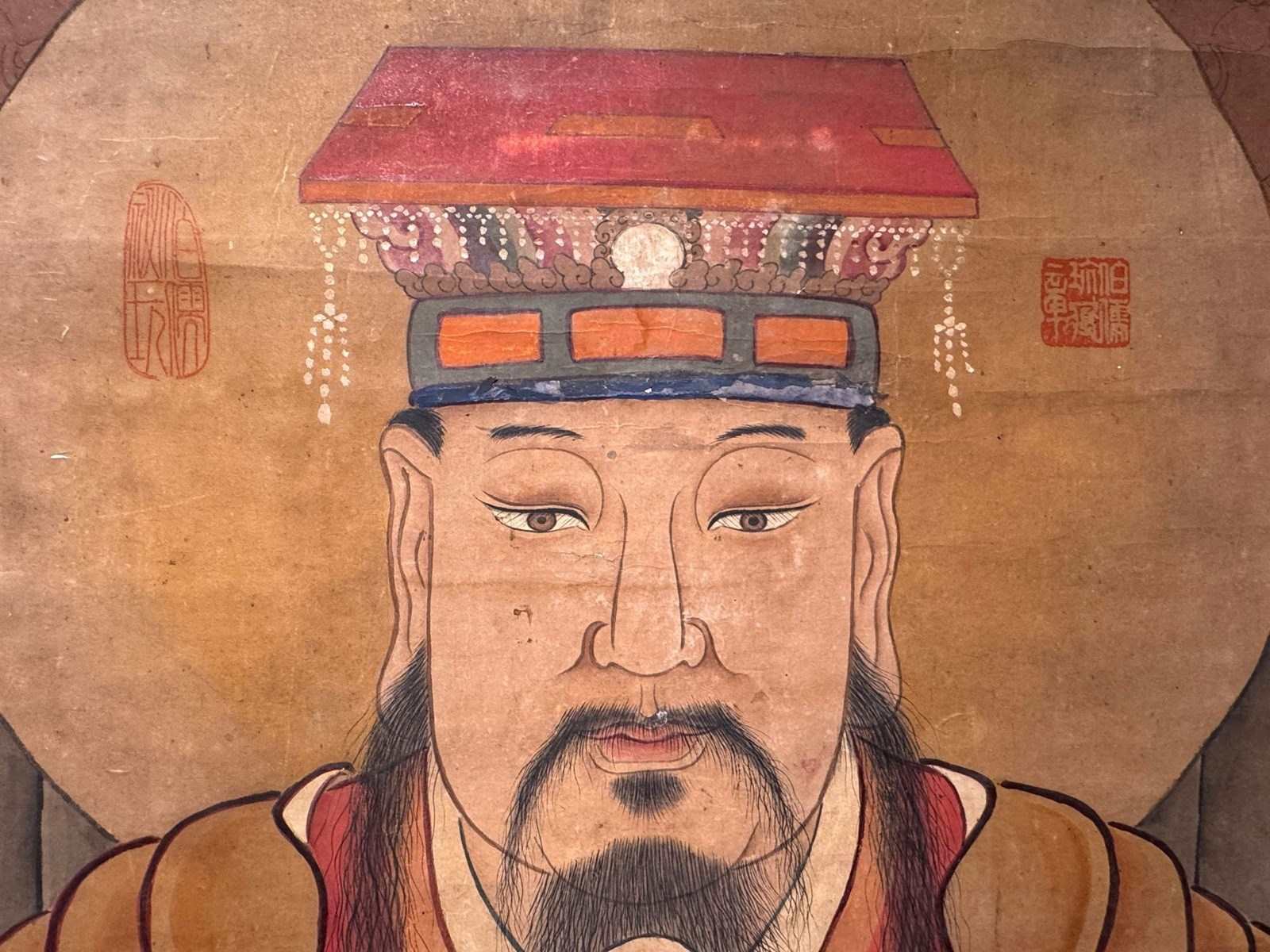 A 19th Century Chinese Qing Dynasty scroll painting of the Daoist immortal 'Jade Emperor', the highest deity in the Daoist pantheon, in his official robe holding a piece of white jade and seated on a throne, ink and colour on paper mouted on silk.
