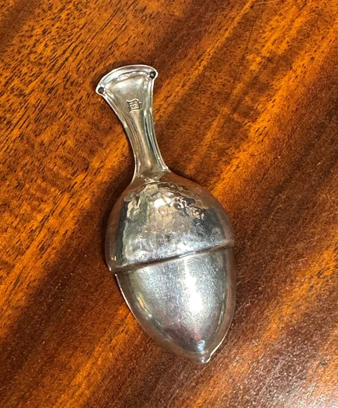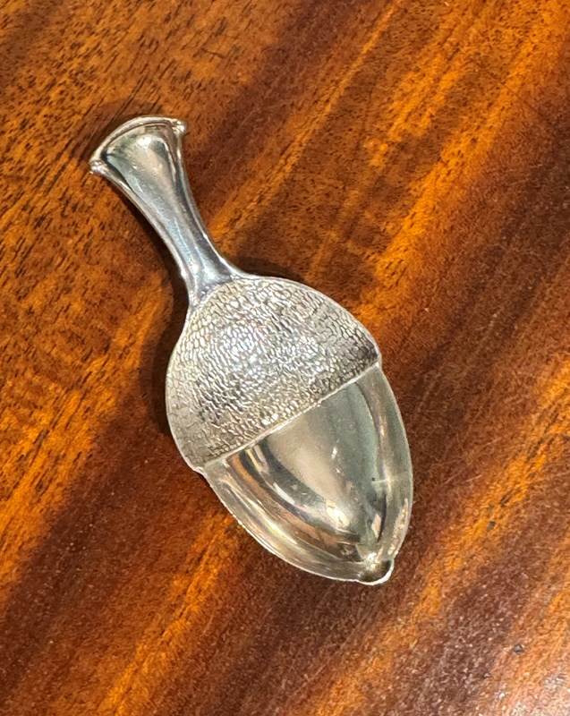 An Edwardian silver caddy spoon by Thos. Bradbury & Sons circa 1910, in the form of an acorn.