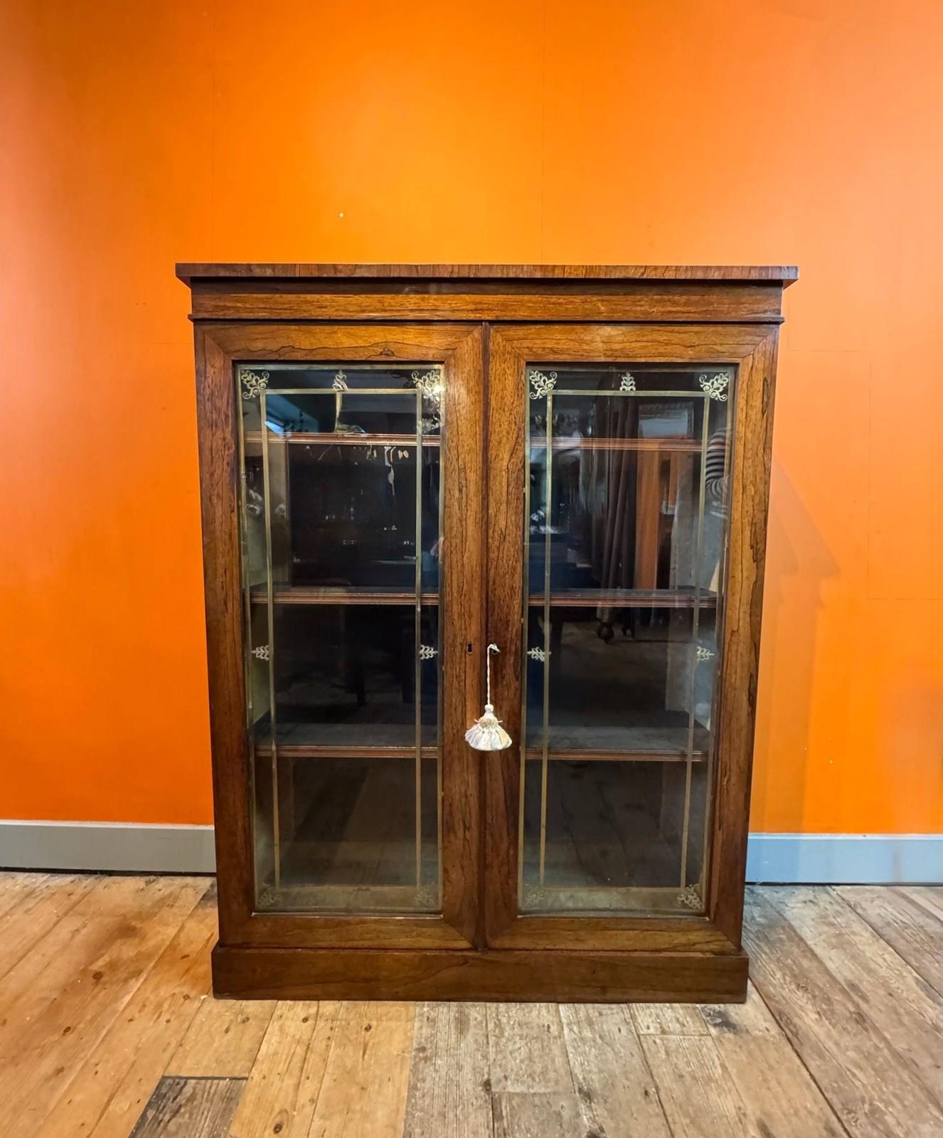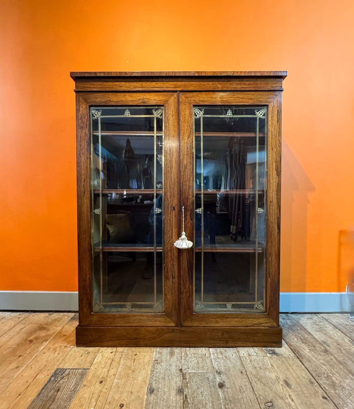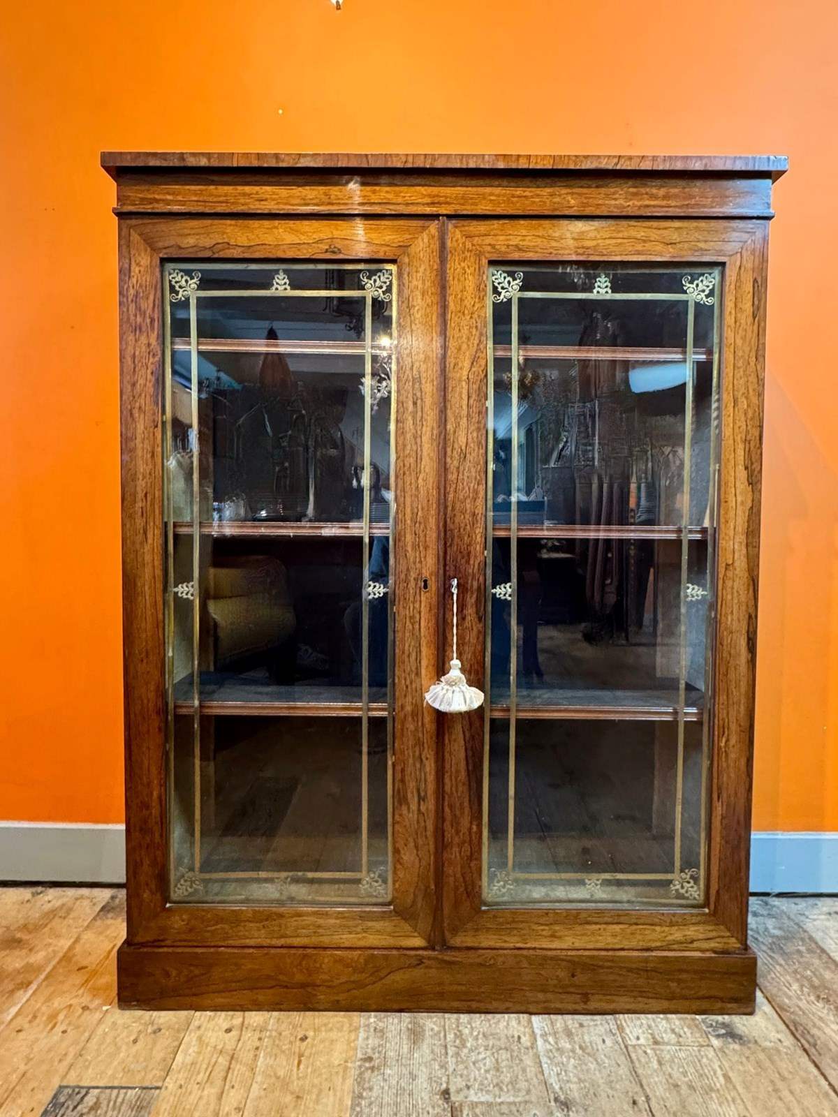A fine quality Victorian rosewood bookcase / cabinet, circa 1860-70, the pair of glazed doors with gilt-brass decoration to the interior and three shelves. The reverse with retailers label for 'Winter & Sons, Upholsterers & House Furnishers, Taunton'.