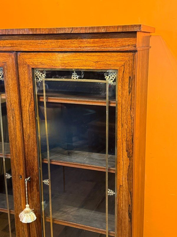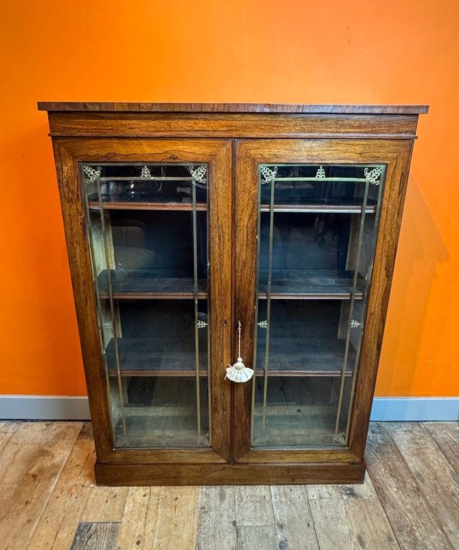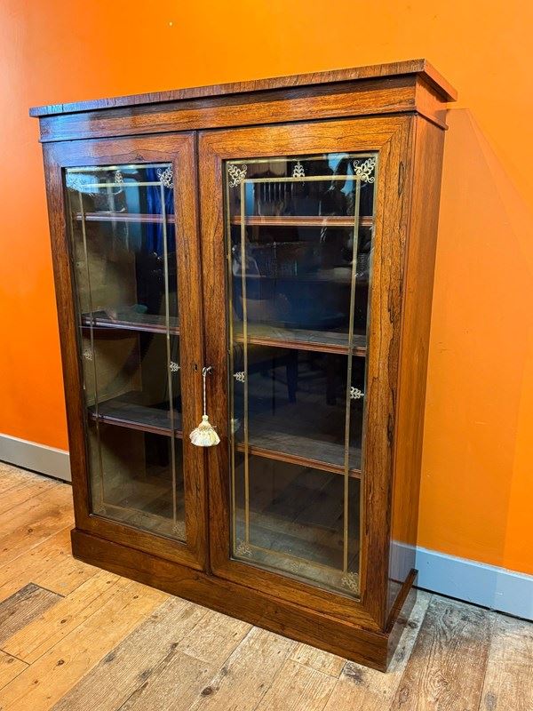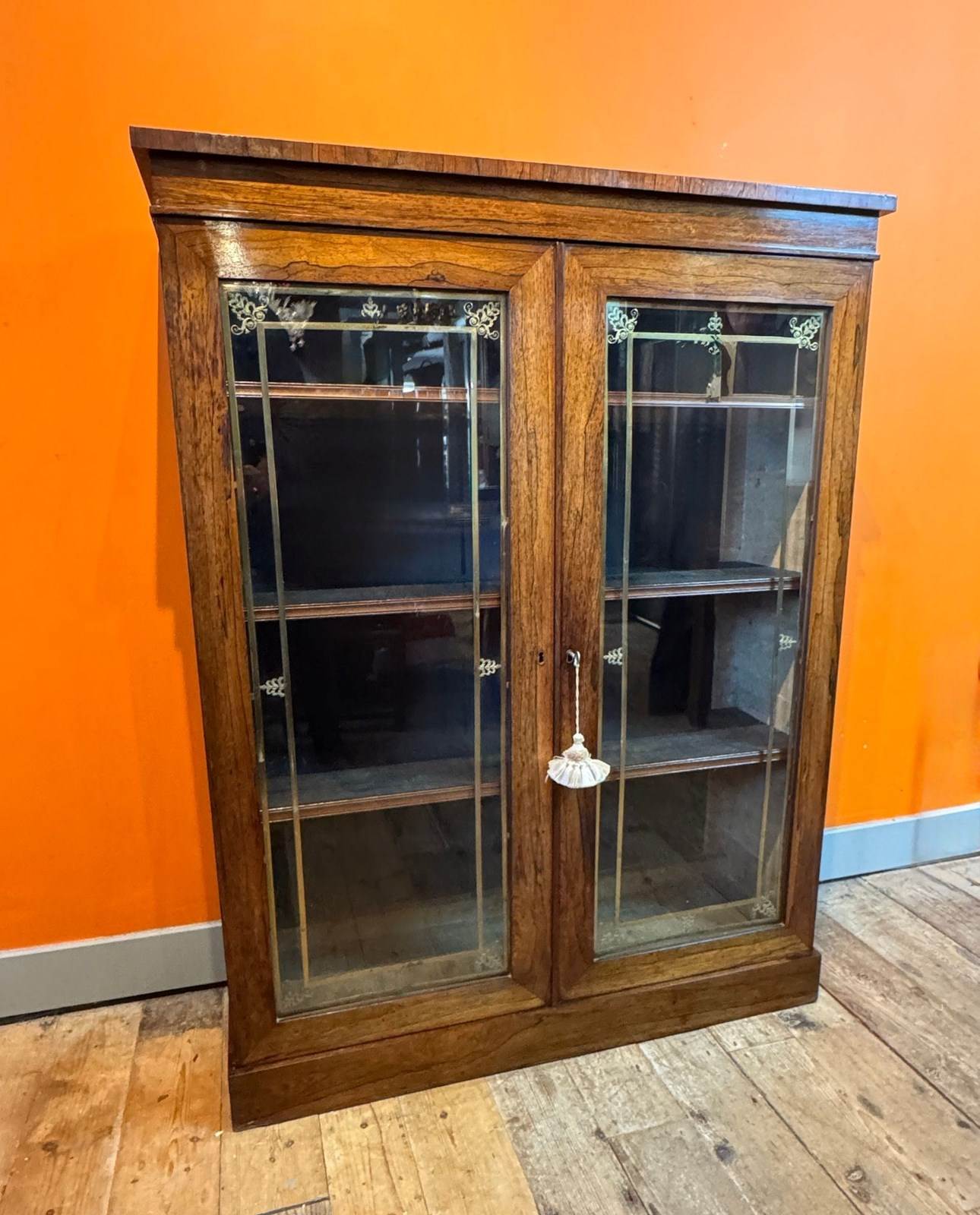 A fine quality Victorian rosewood bookcase / cabinet, circa 1860-70, the pair of glazed doors with gilt-brass decoration to the interior and three shelves. The reverse with retailers label for 'Winter & Sons, Upholsterers & House Furnishers, Taunton'.