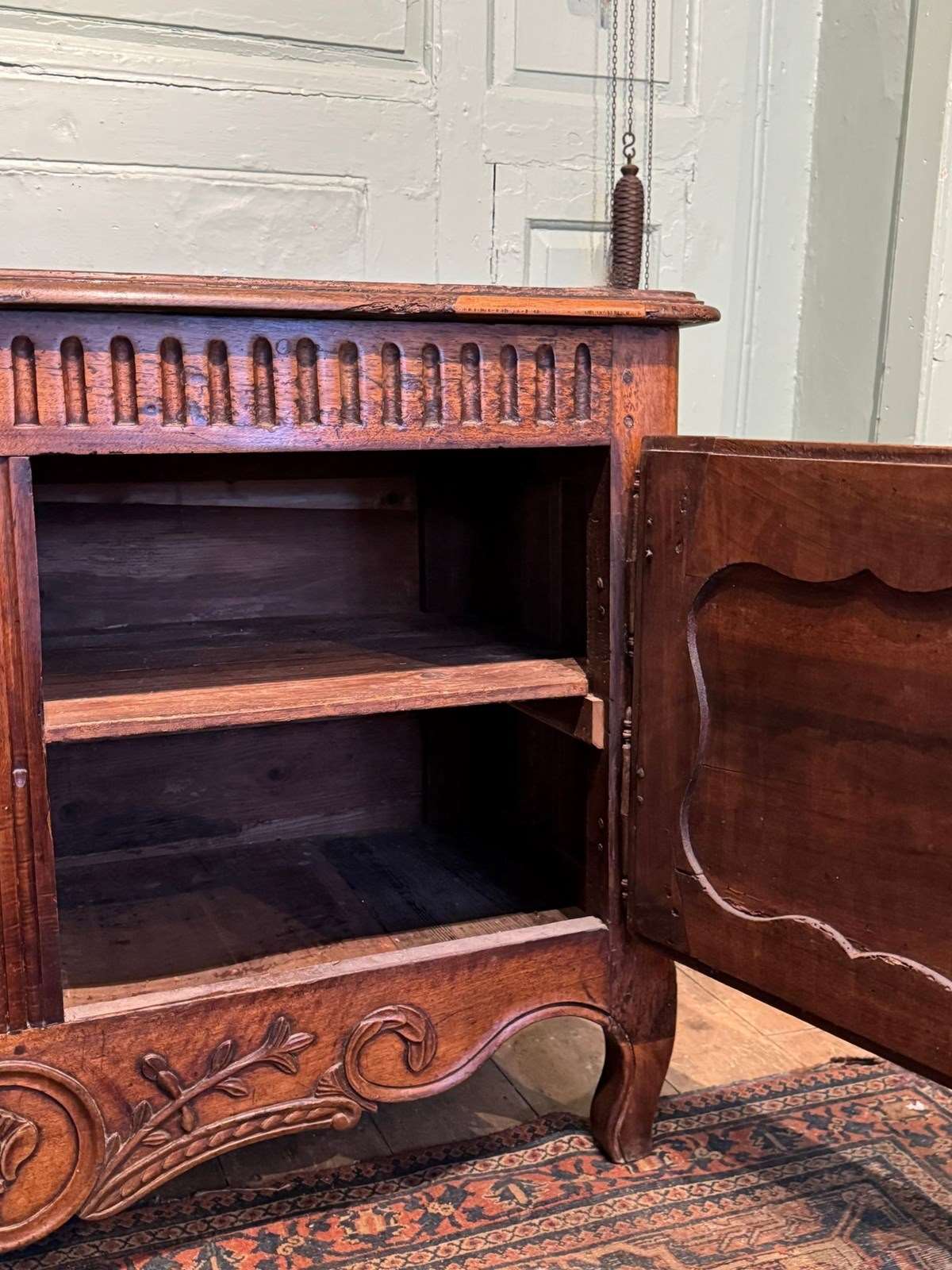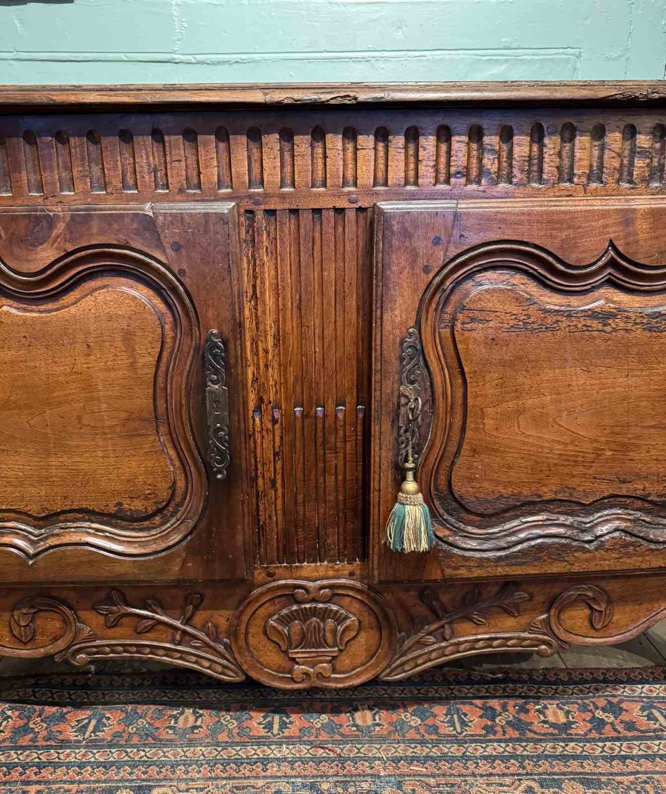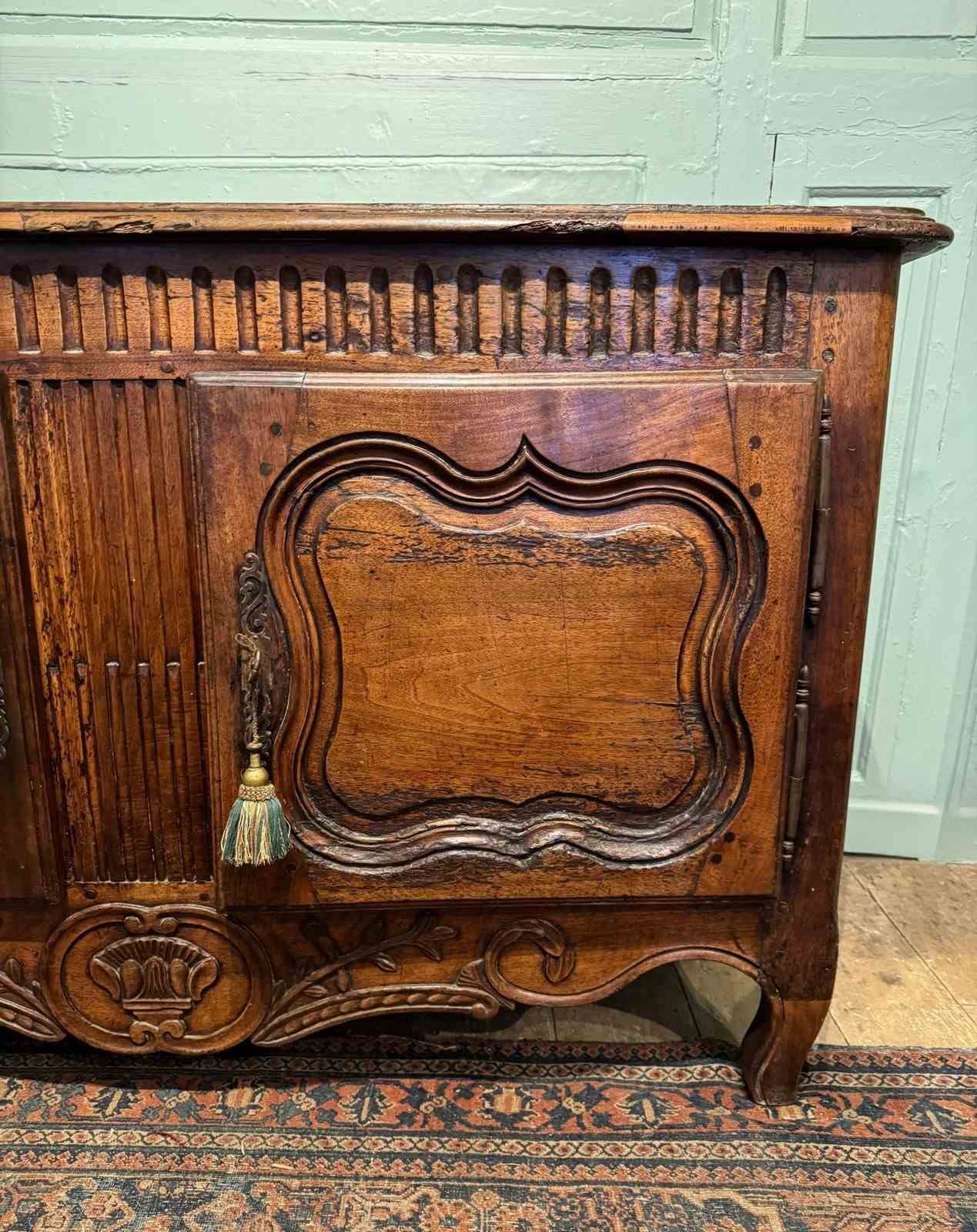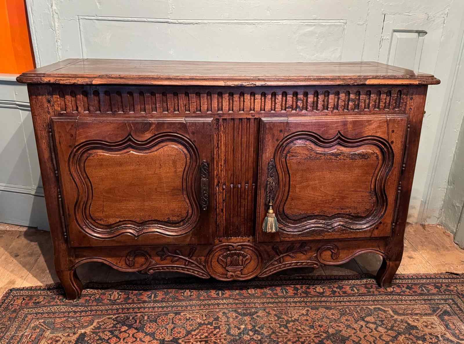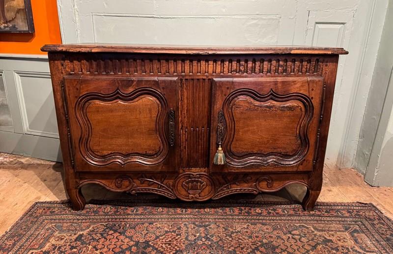 A provincial French 18th Century walnut buffet, the top with cleated ends and a moulded edge, the carved frieze over a pair of shaped fielded panel doors and foliate carved apron, raised on shaped feet. The interior with single shelf and with key.