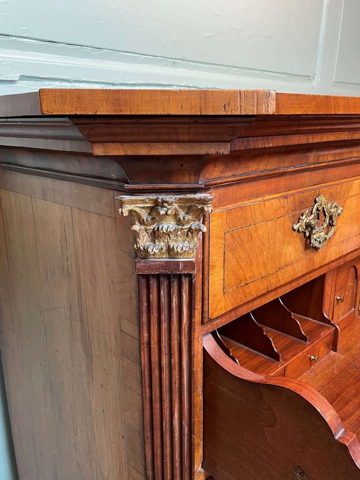 A good quality George II and later walnut secretaire chest, the top with projecting canted corners over two short drawers, secretaire drawer and two long drawers, the cross banded borders with feather line inlay, gilt brass rococo handles and flanked by channel moulded pilasters with gilt gesso Corinthian column capitals, raised on ogee bracket feet.