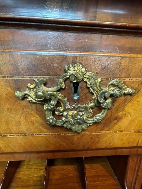 This appears to be the upper section of an early 18th century chest on chest, skillfully adapted in the late 19th century for use as a secretaire. The uppermost long drawer with a drop front released by two brass buttons at either end of the drawer and the interior fitted with compartments and small drawers. The are oak lined and with original handles. The ogee bracket feet appear to be original, taken from the lower section of the chest on chest.