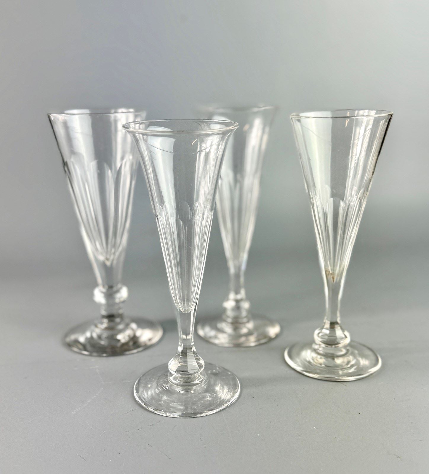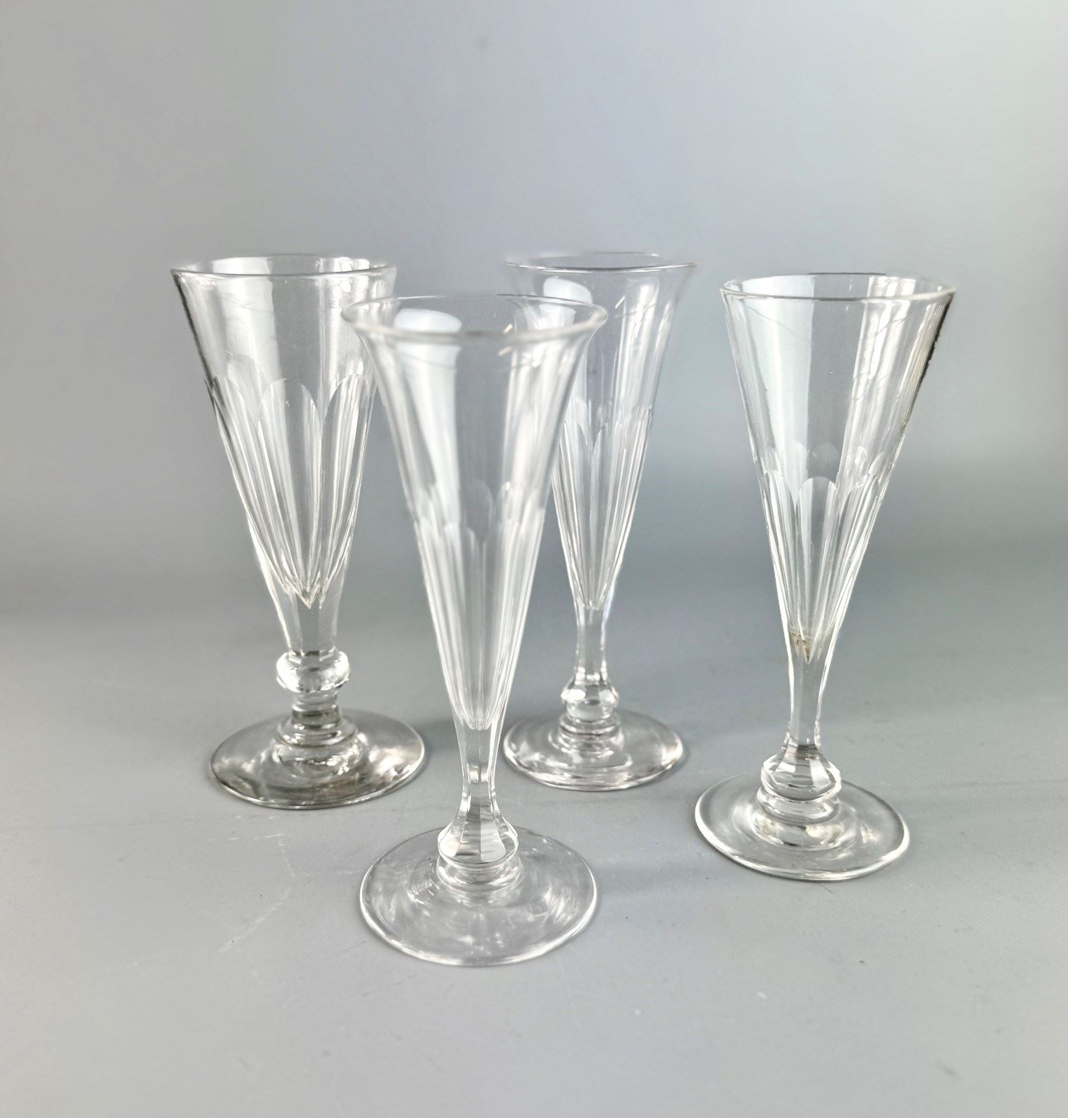 A matched set of our antique flute cut champagne flutes, 19th century, comprising one idential pair and two others similar. One with slight chip to foot otherwise in excellent condition.