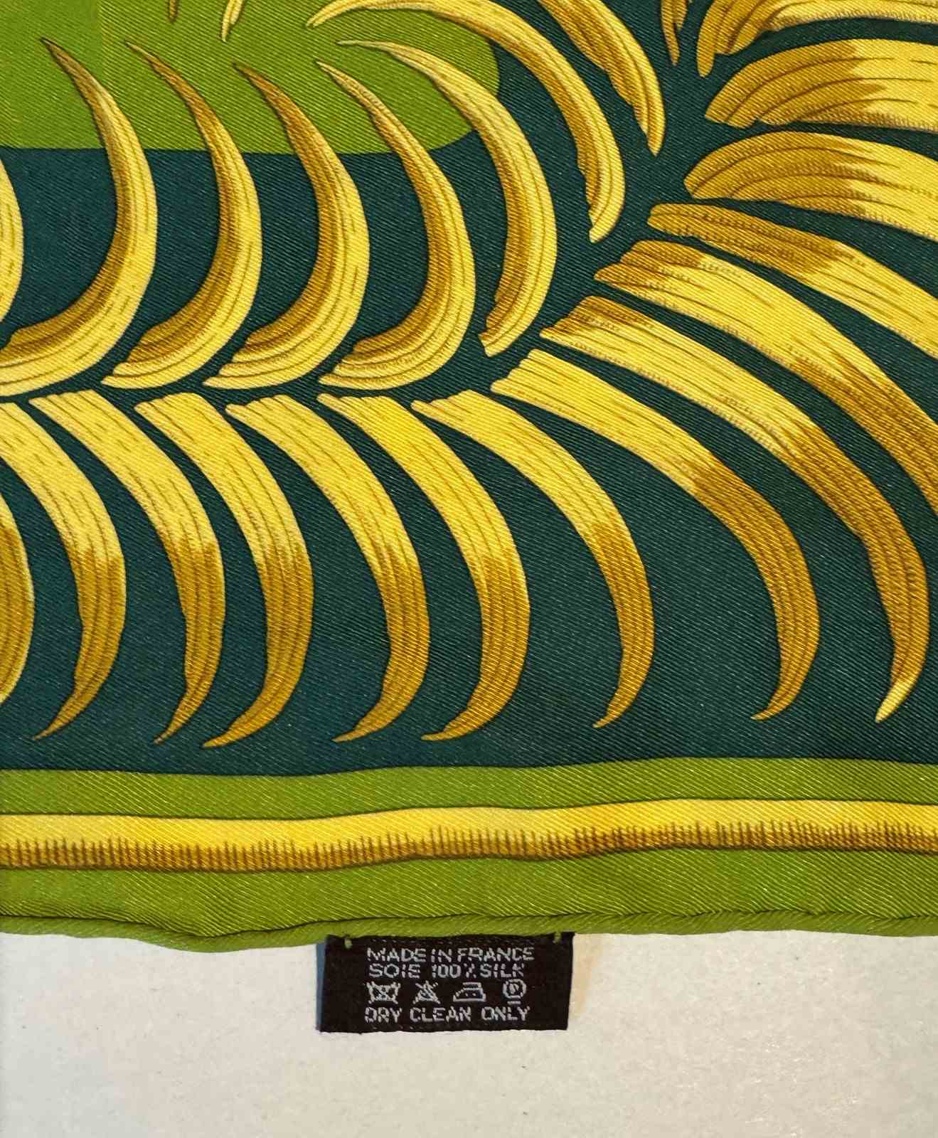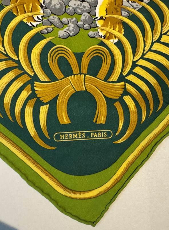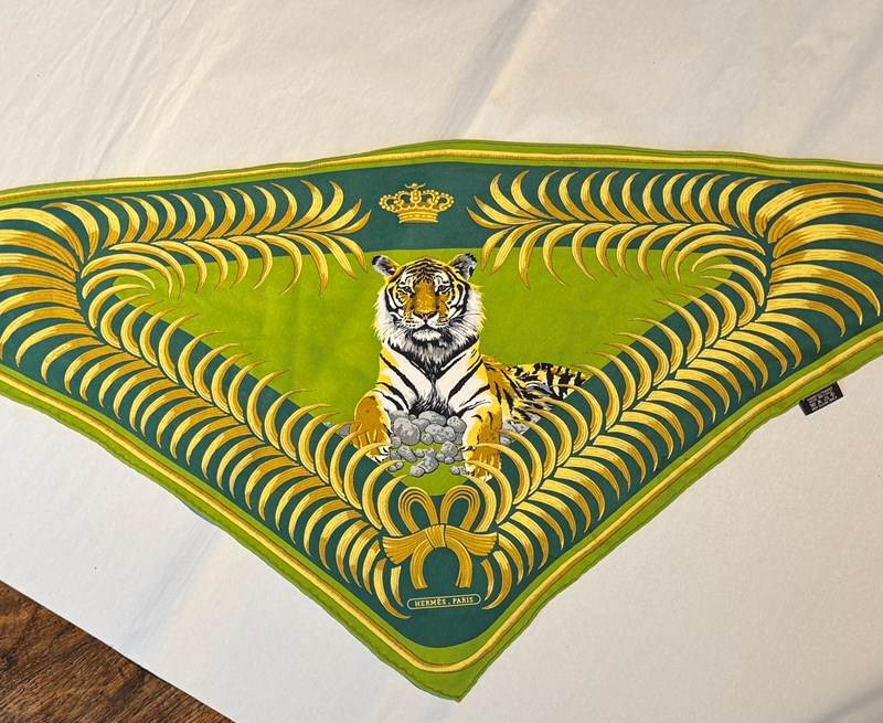 A Hermes 'Tigre Royal' triangular silk scarf, designed by Christiane Vauzelles in the green colourway with rolled edges,