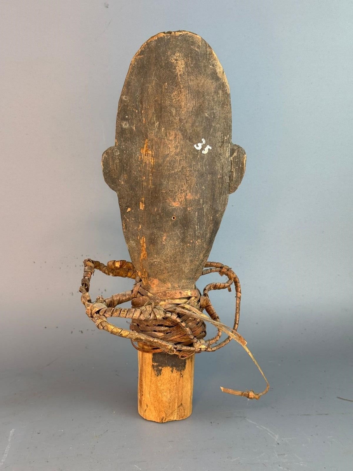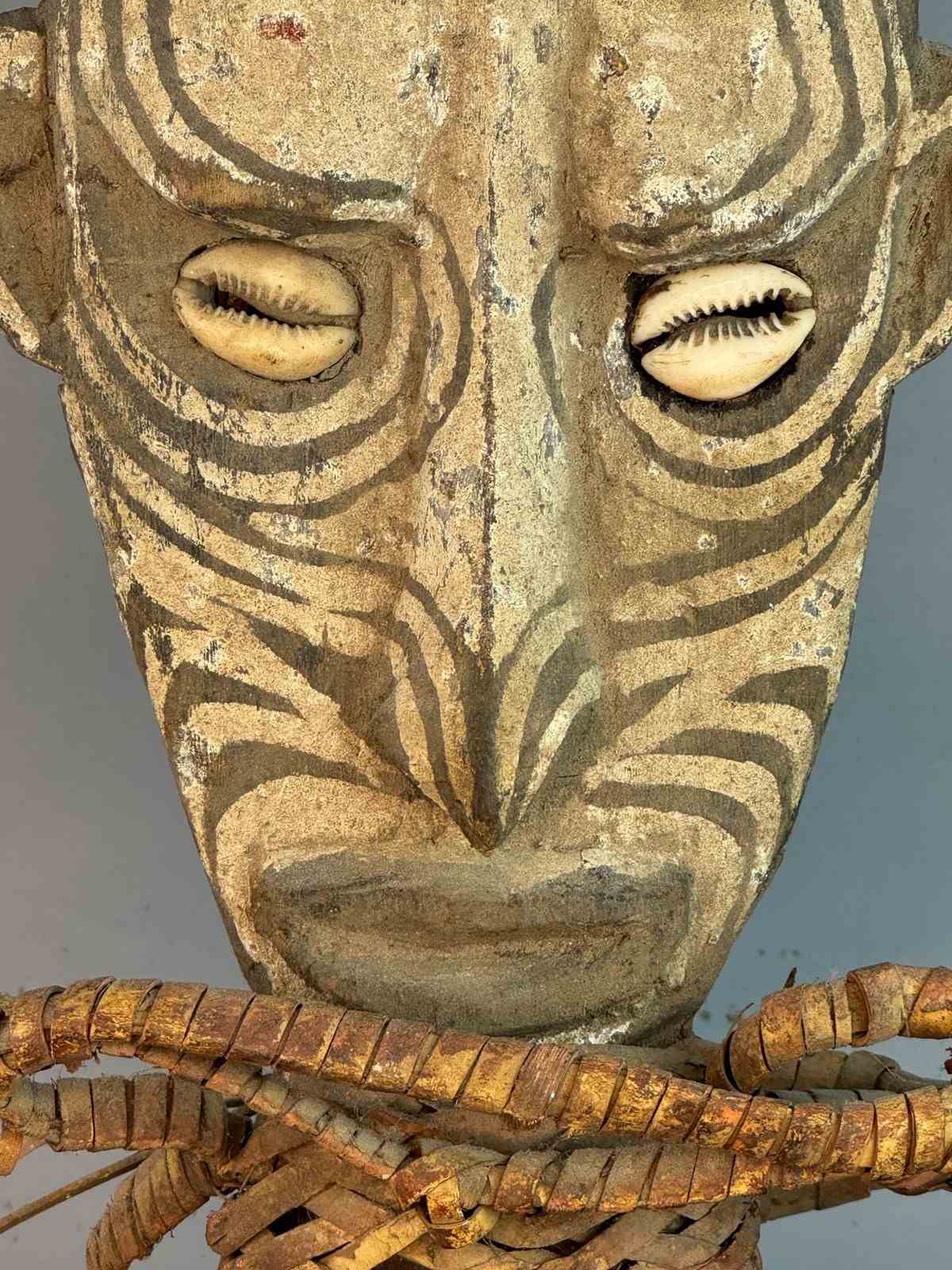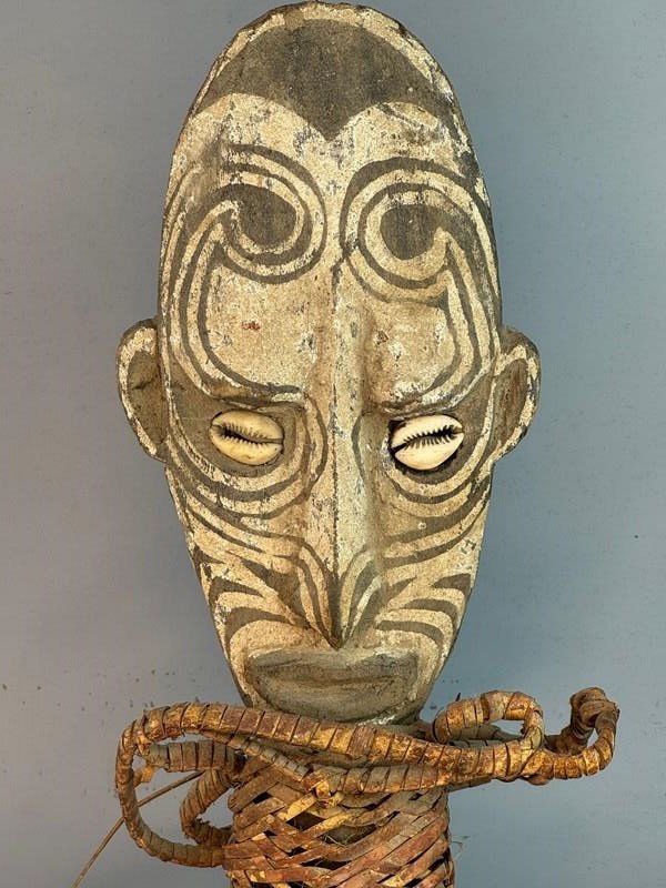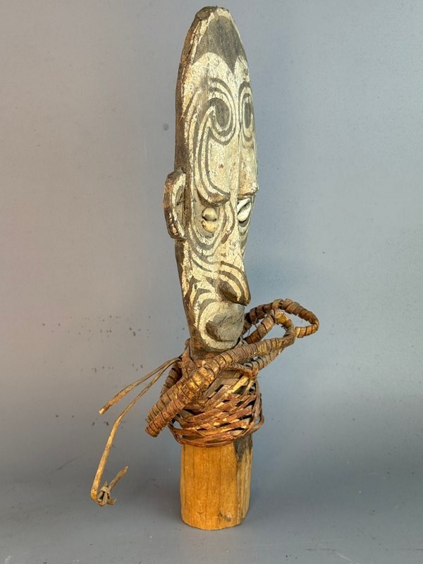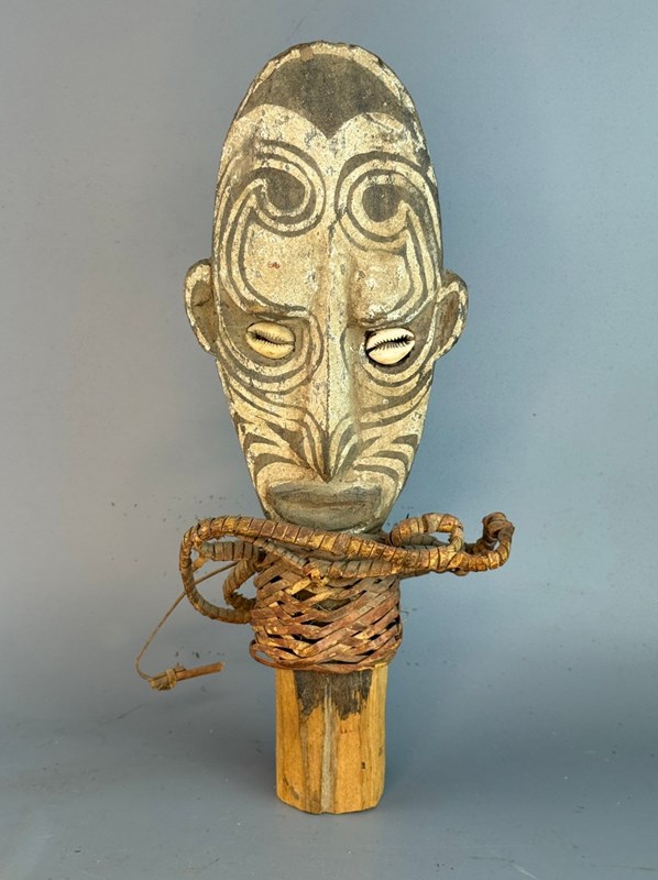 An Iatmul carved wooden anthropomorphic flute stopper, Middle Sepik River, Papua New Guinea, the painted face with cowrie inset eyes and vine bark collar. 33 cms high.