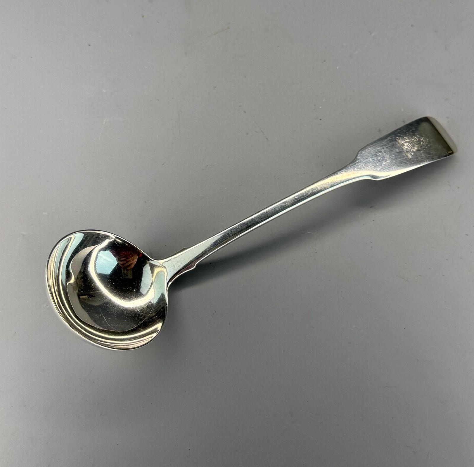 A Georgian silver sauce ladle, Dublin 1826 by Thomas Farnett, in Hanovarian pattern, engraved with an armorial.