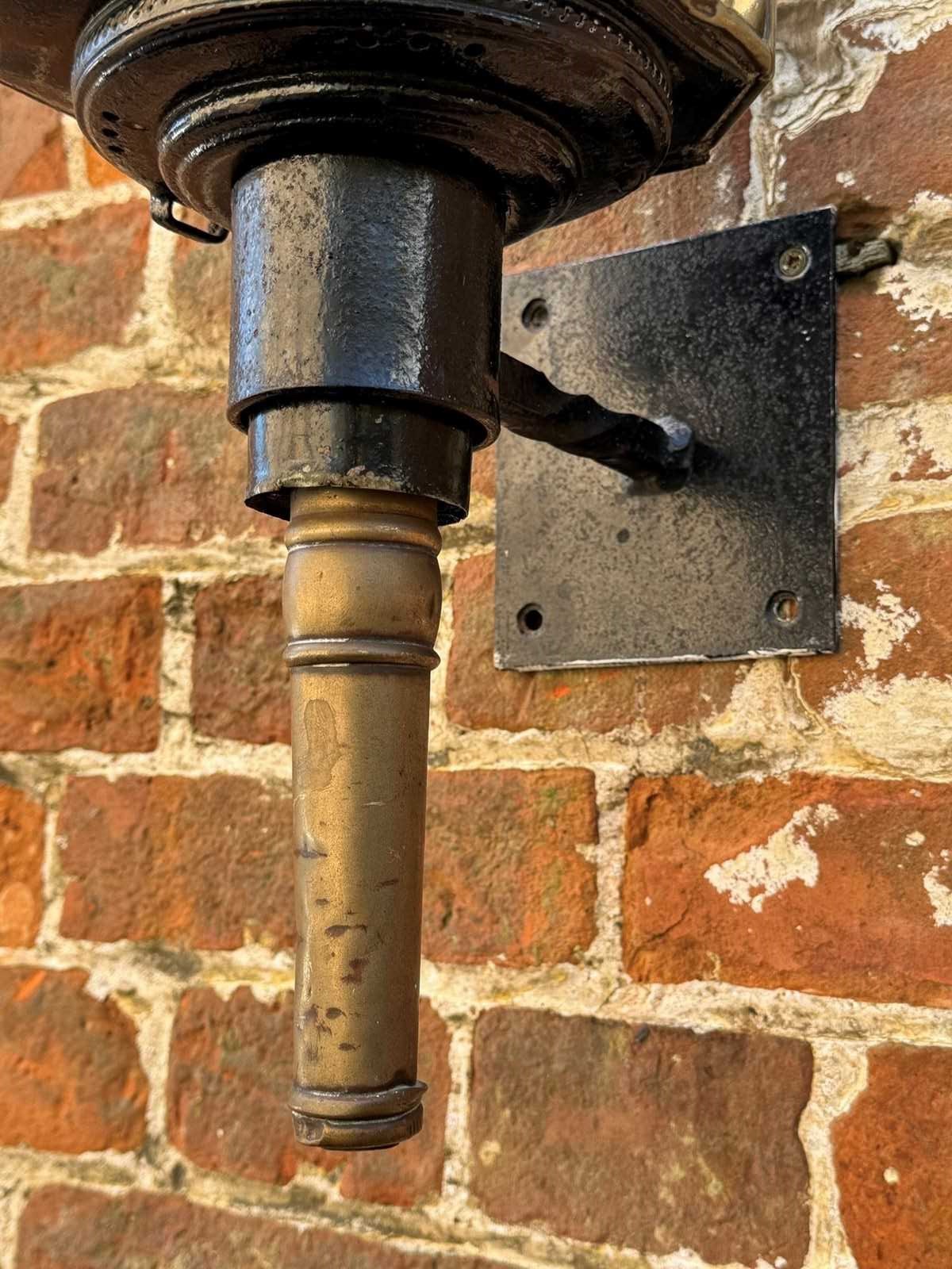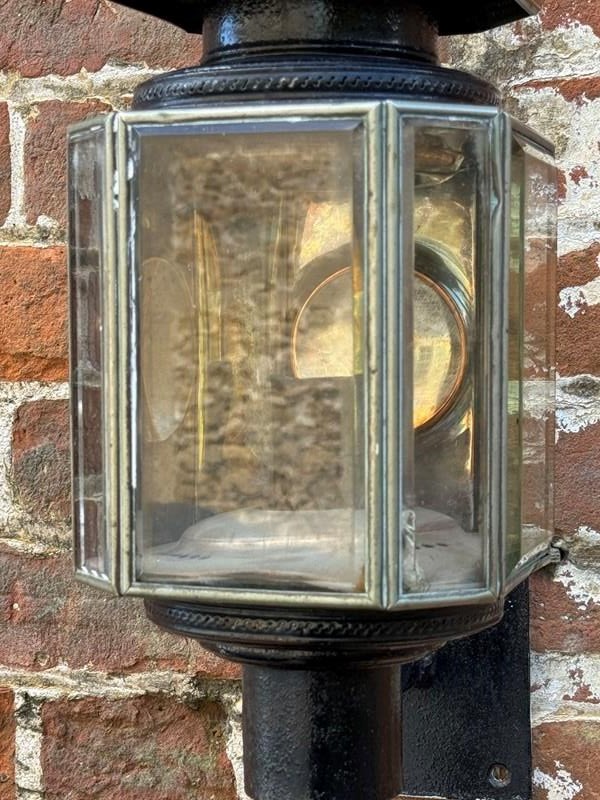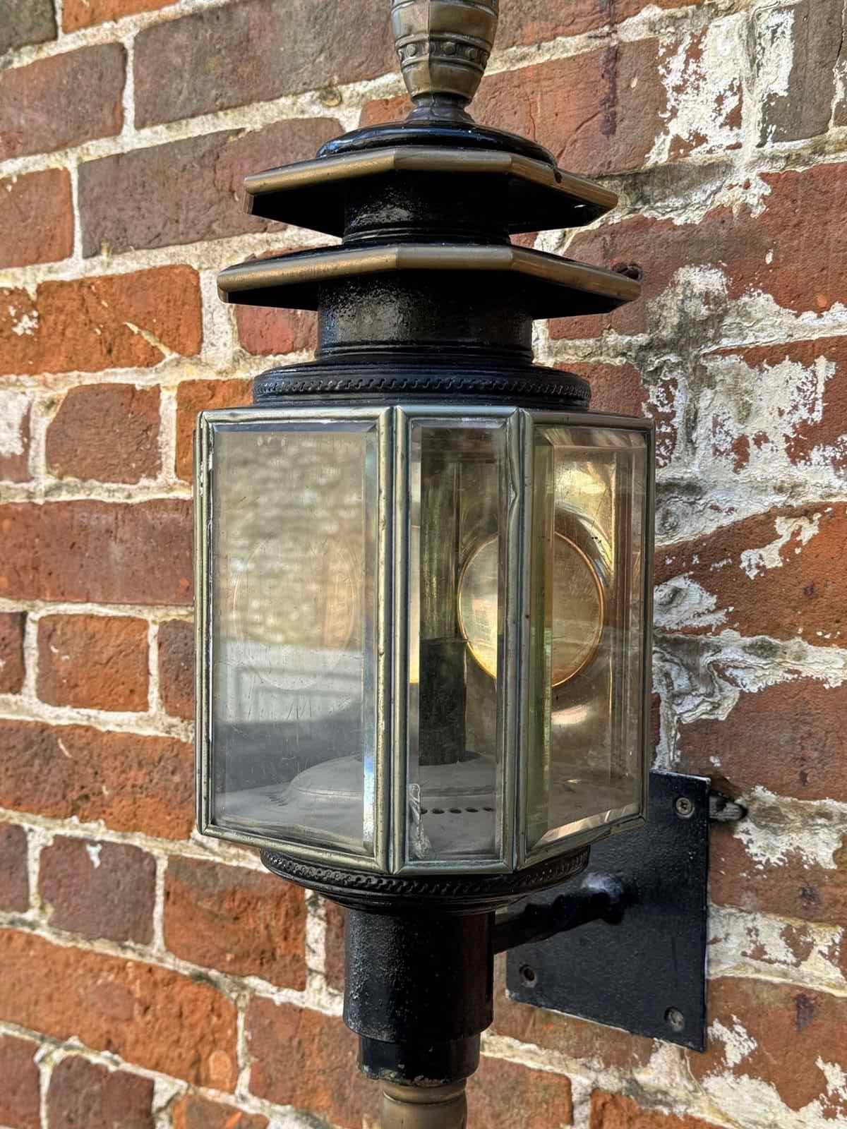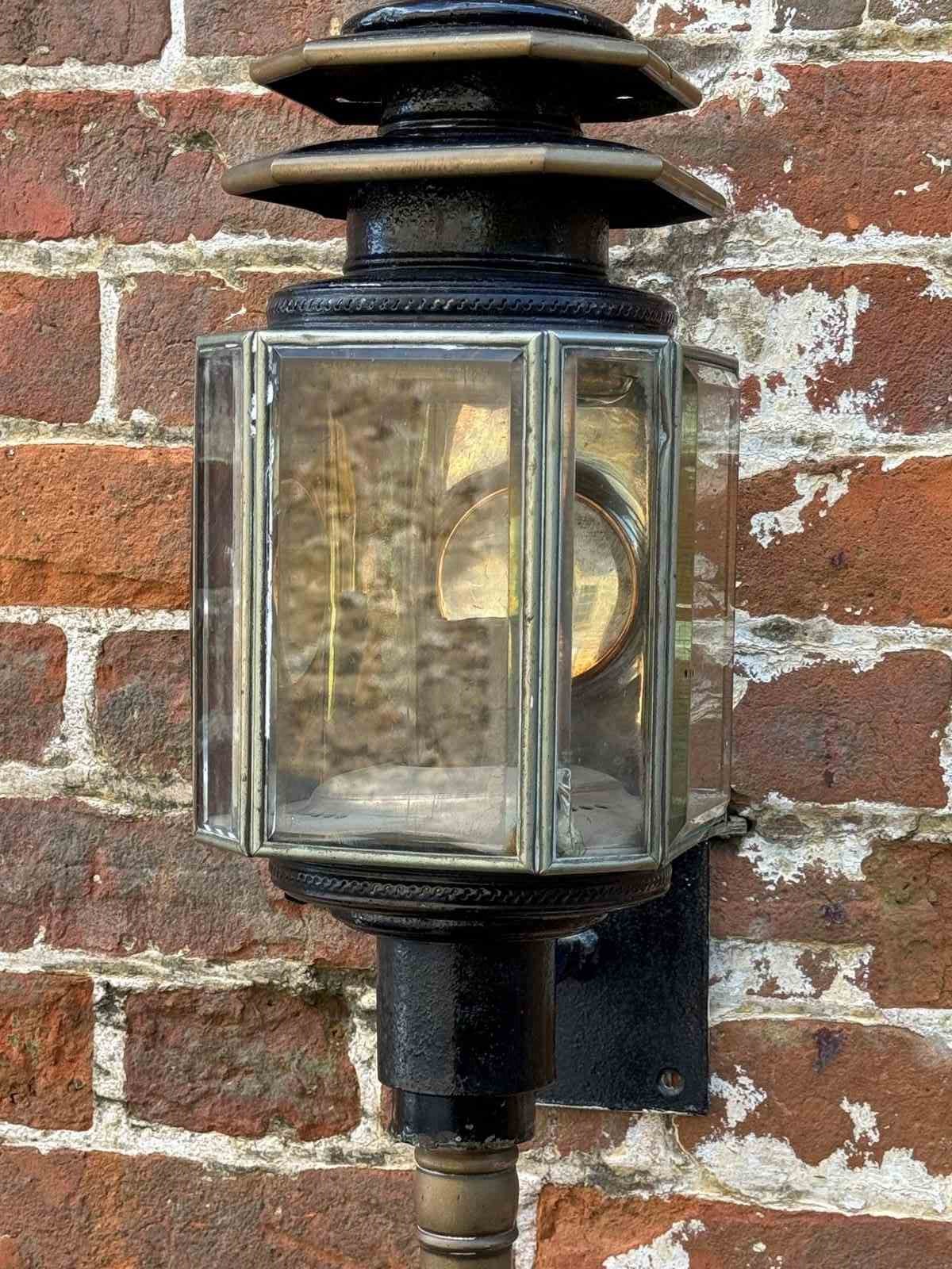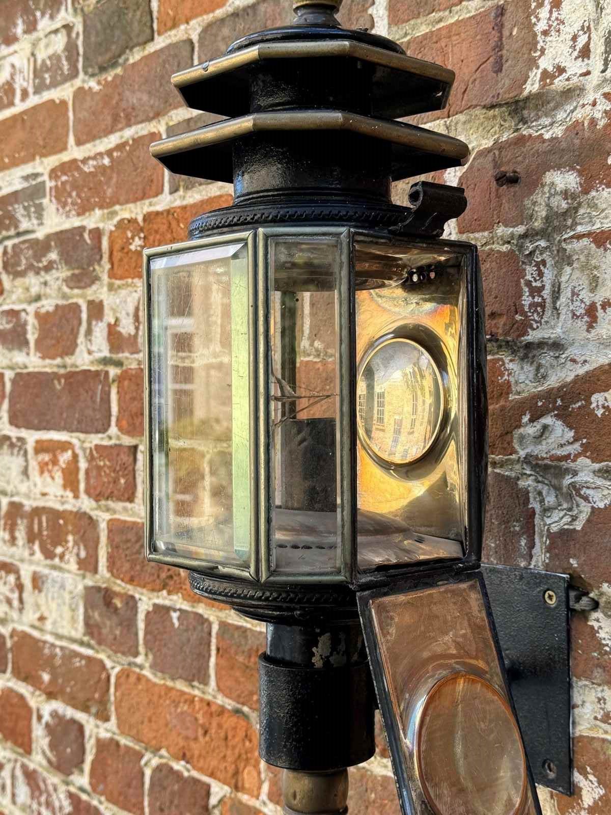 A large 19th century carriage lantern, of japanned metal and brass construction with bevelled glass and silver plated copper interior for maximum reflection, with a custom made iron wall bracket.