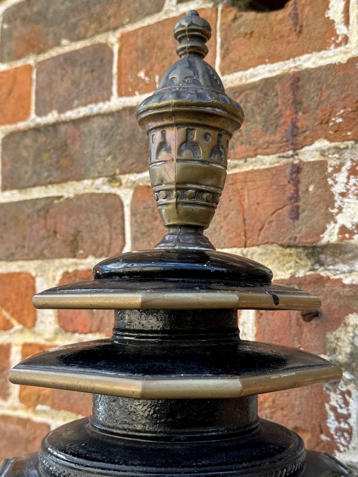 This could easily be electrified and would make an excellent porch lantern. The brass candleholder projecting from the bottom on the lantern appears to be a replacement.