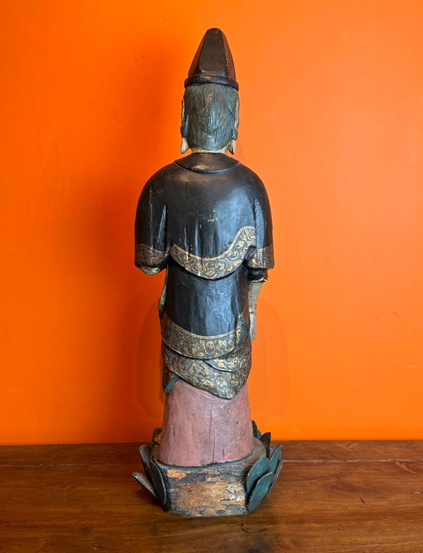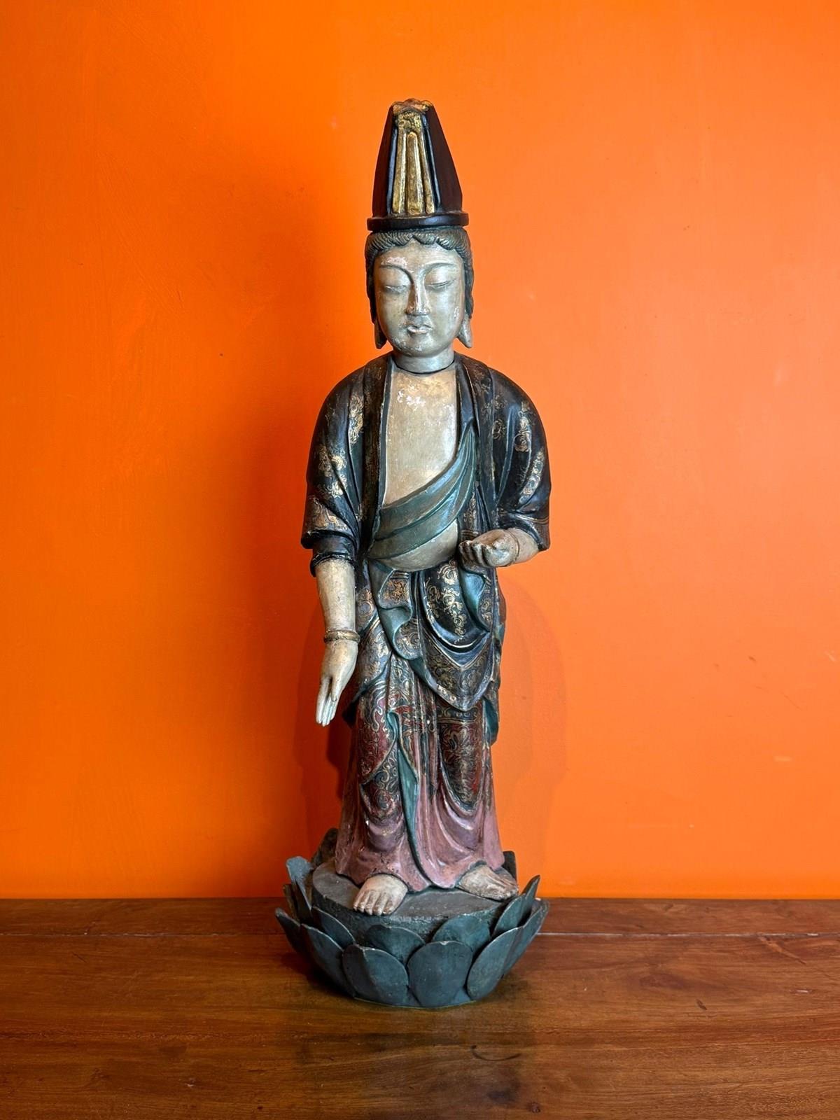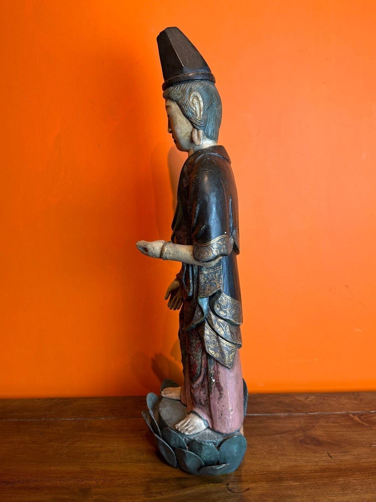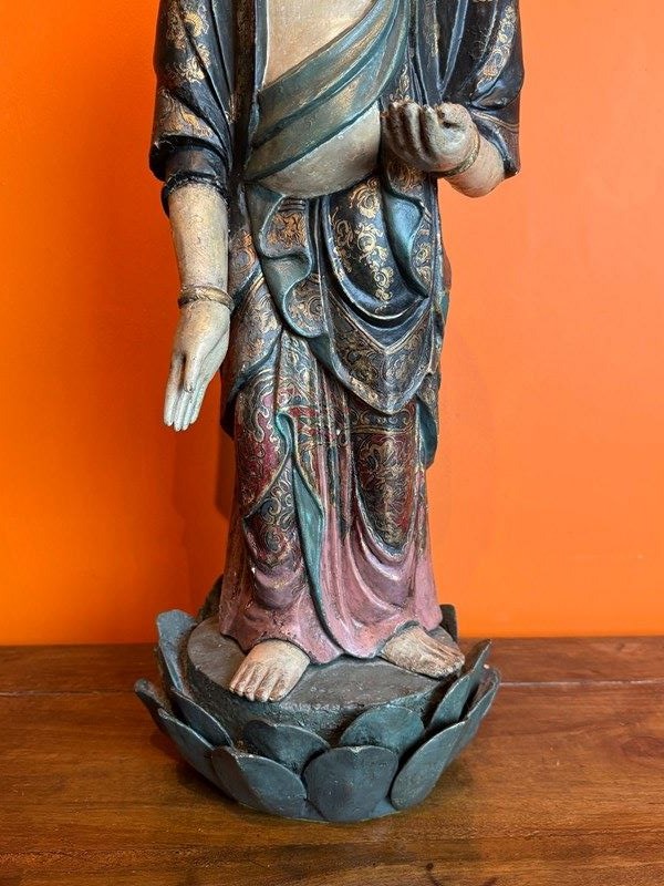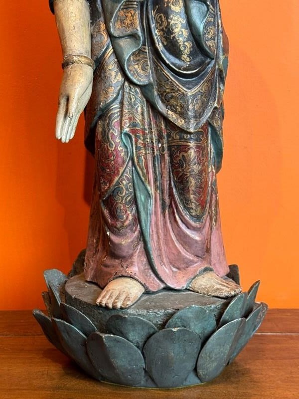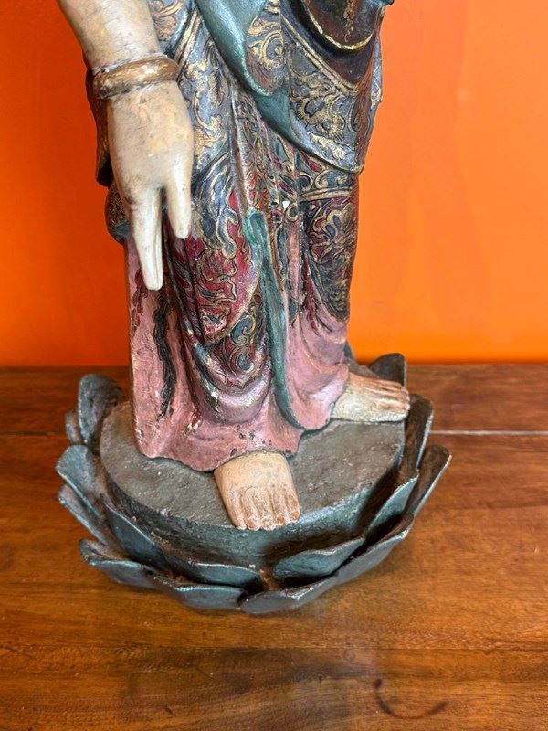 A large 19th Century Chinese polychrome painted carved-wood figure of Guanyin standing on a lotus base, her robes with gillt foliate decoration.