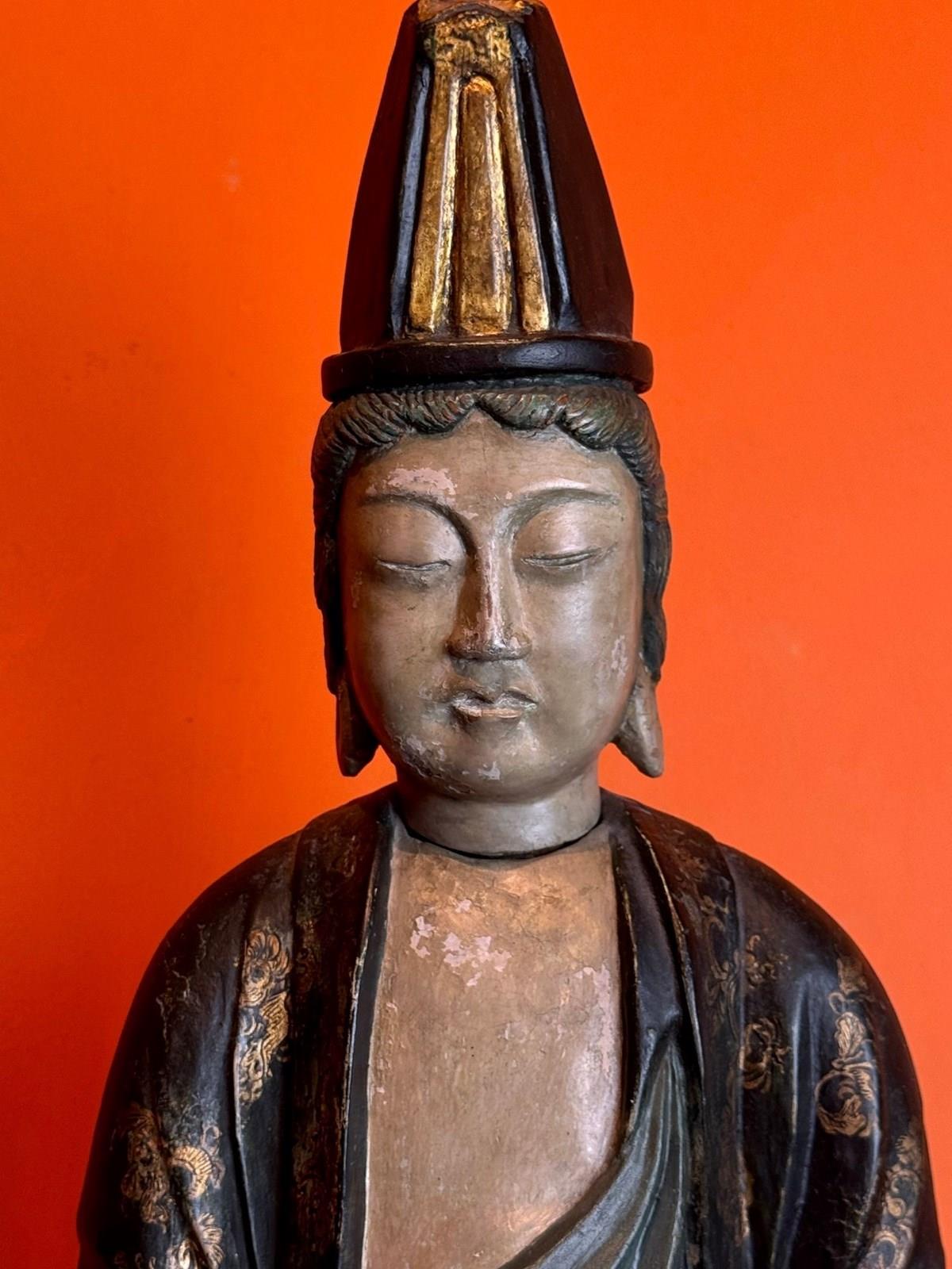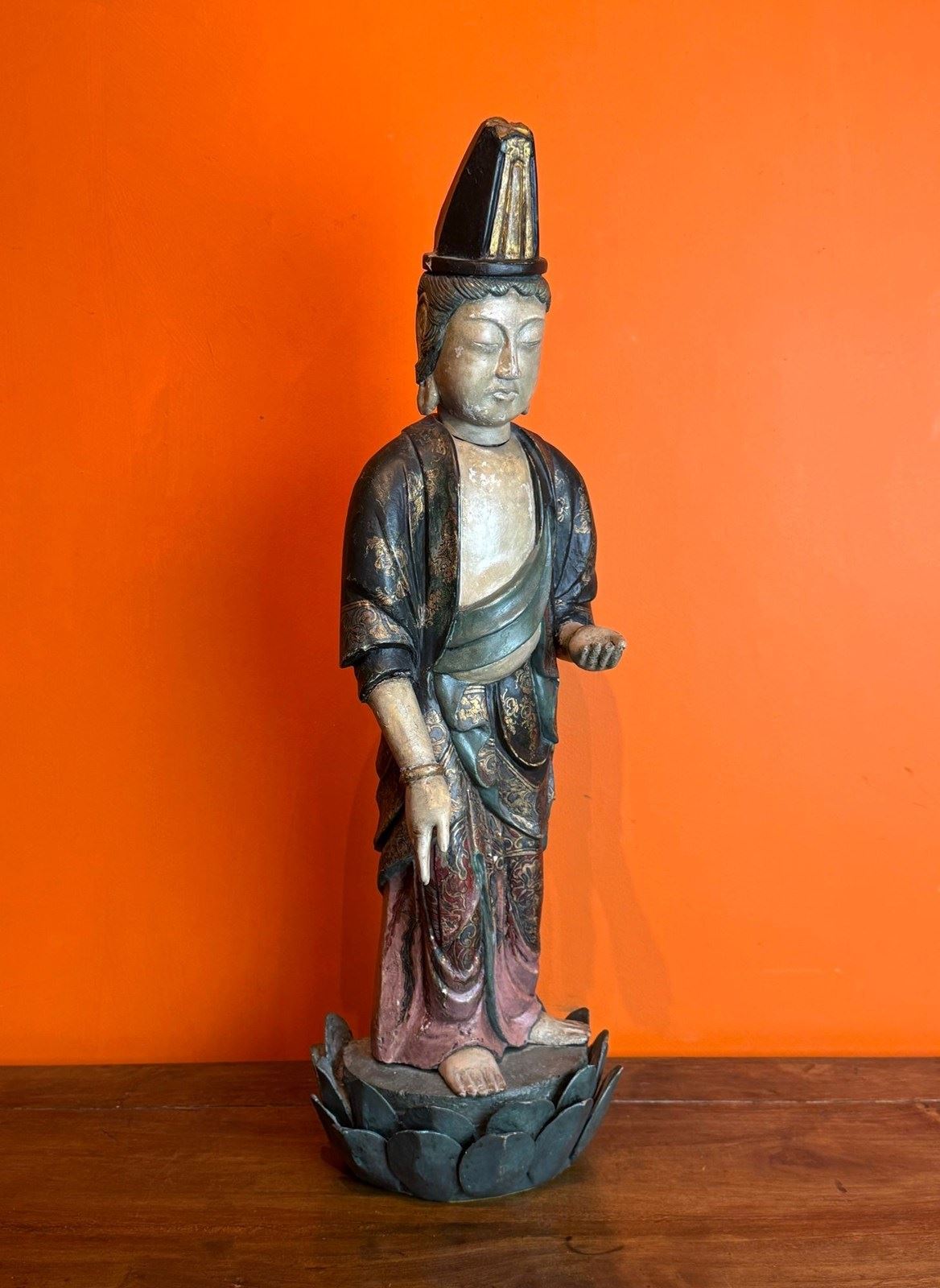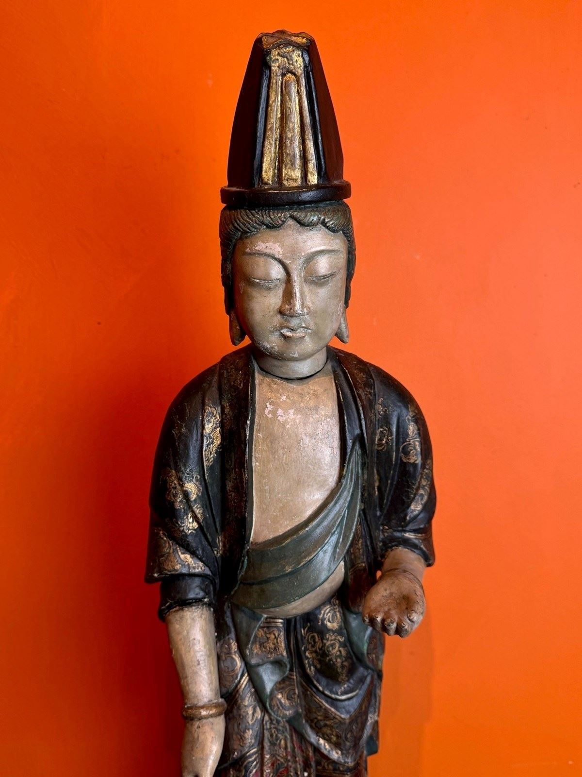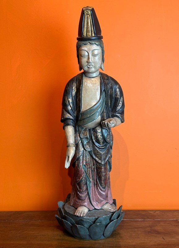 A large 19th Century Chinese polychrome painted carved-wood figure of Guanyin standing on a lotus base, her robes with gillt foliate decoration.