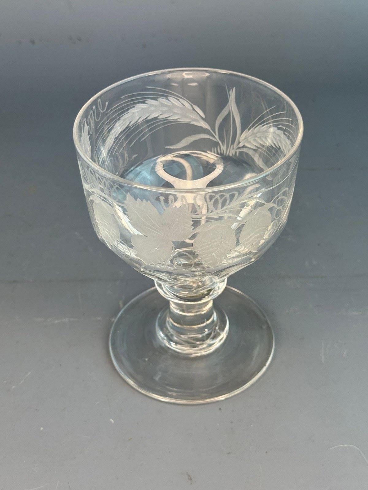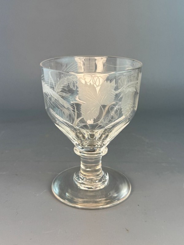 A large early Victorian blown glass rummer of good proportions, circa 1830-40, the bowl engraved with sheaves of wheat and grape vines and upon a stem with a bladed collar and broken pontil to the foot.