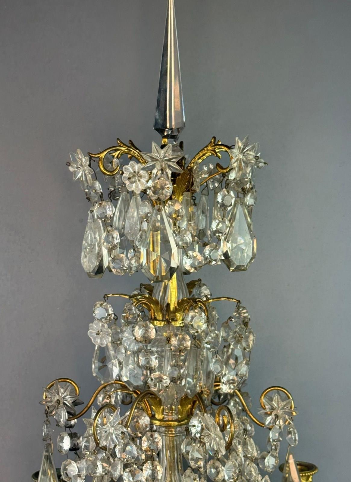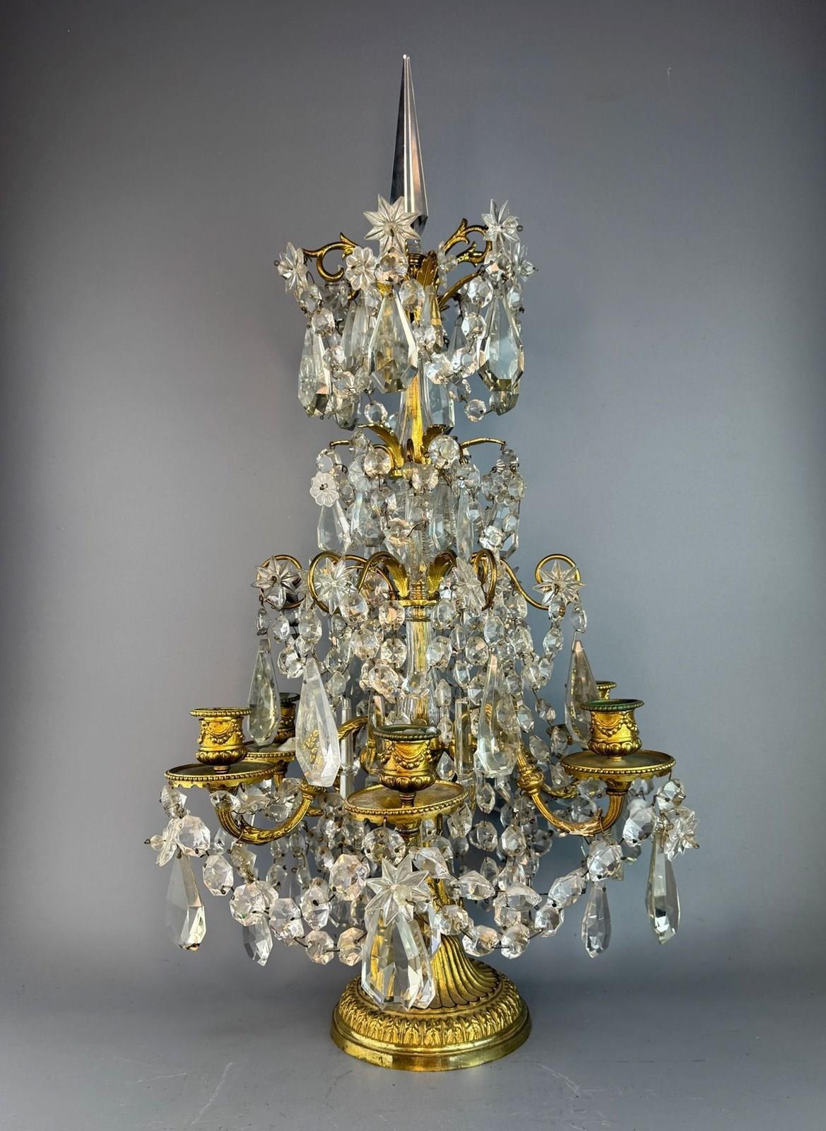 A lovely quality French gilt-brass table candleabra, early 20th Century, with six candlesconces and hung with tiers of cut glass drops, star shaped bosses and chains.