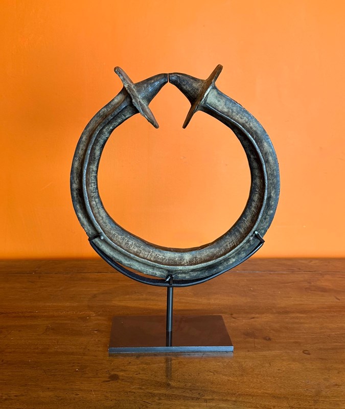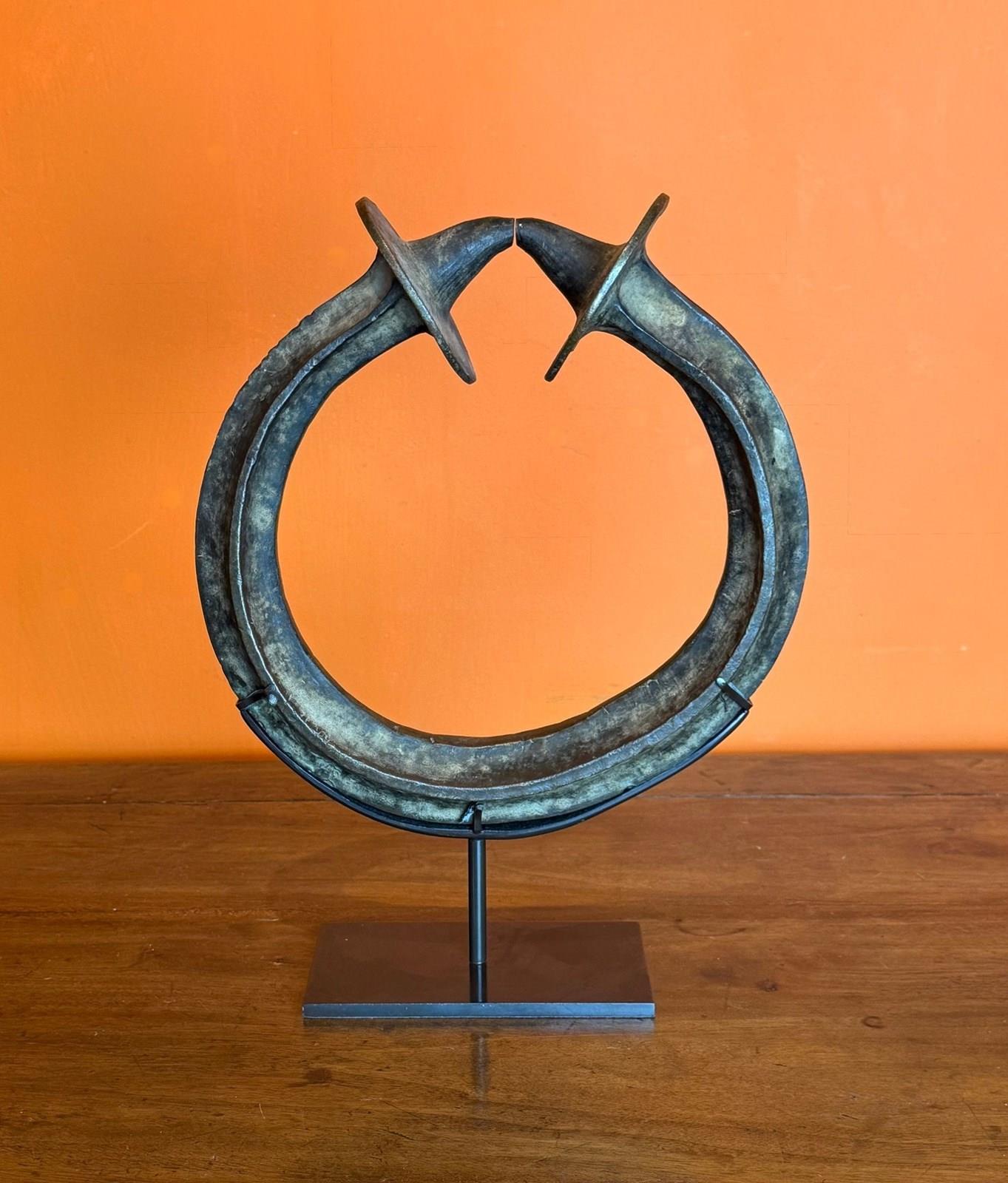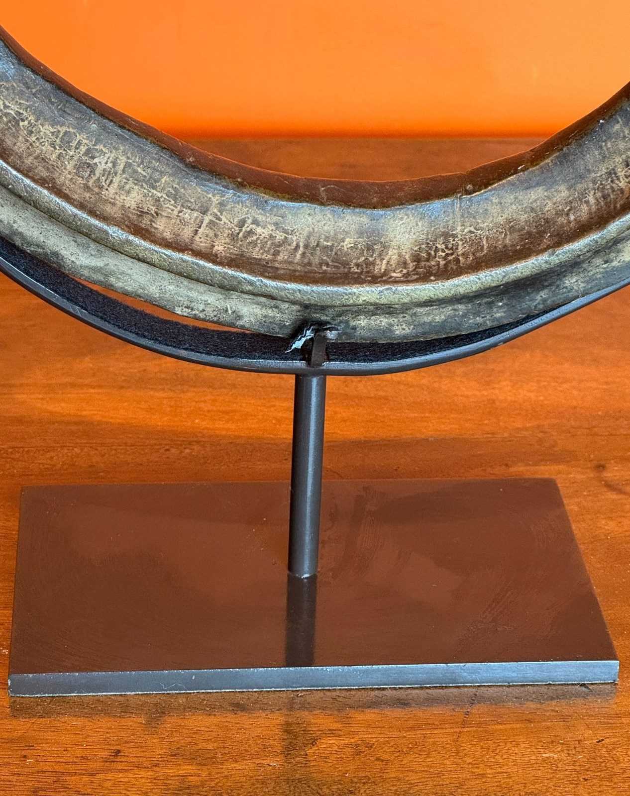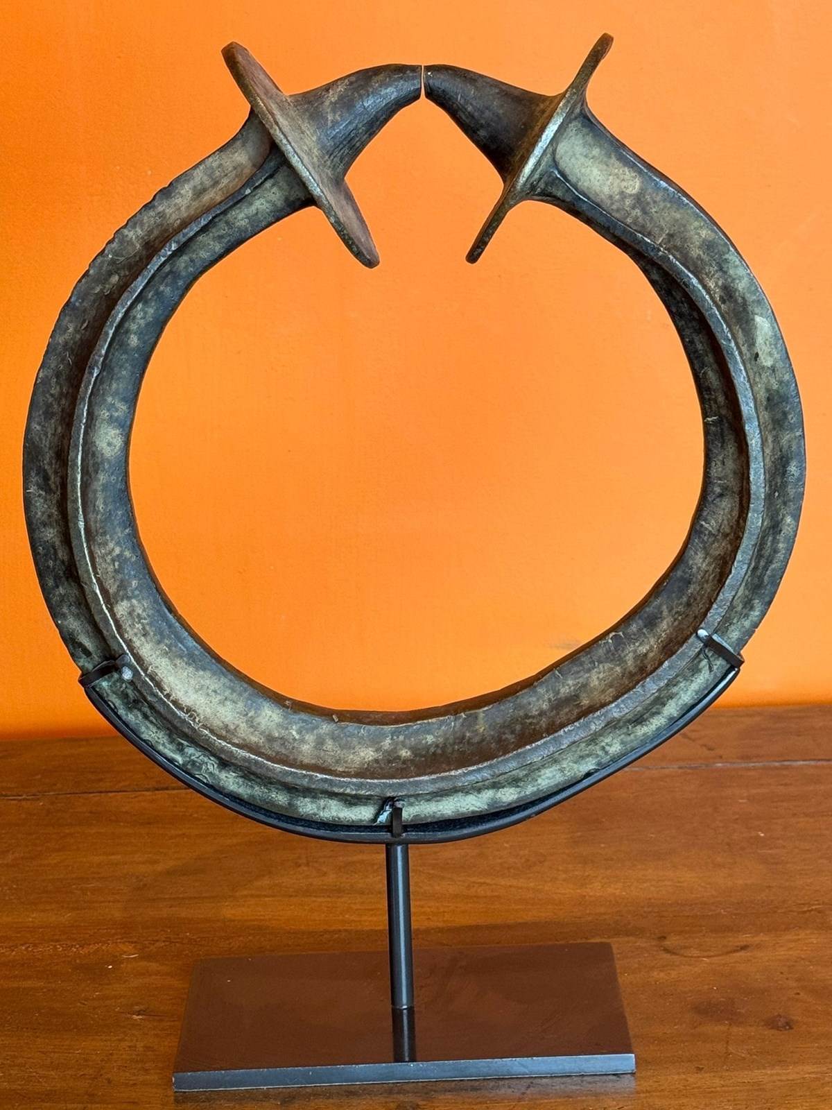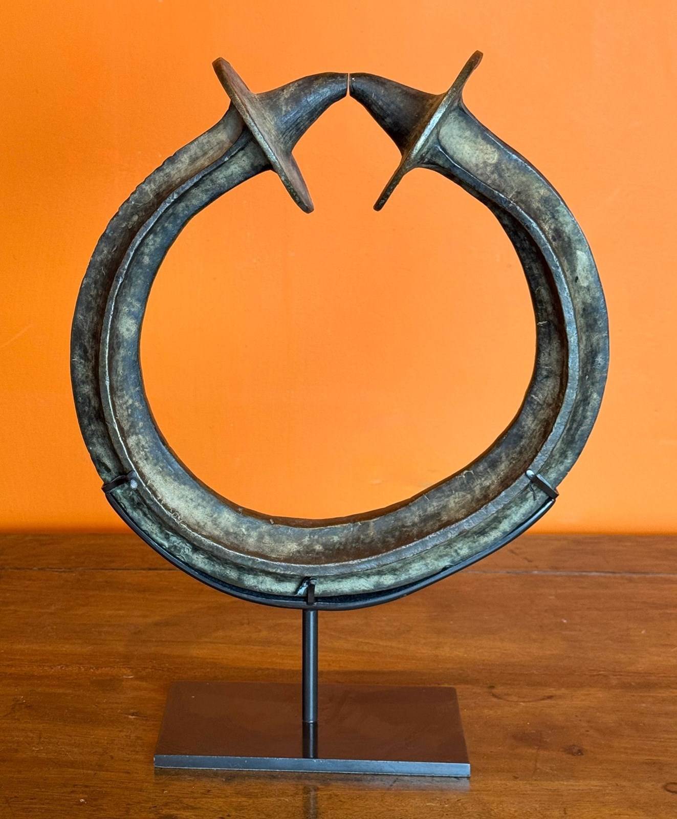 A good, heavy, large scale Nigerian Yoruba bronze torque, 18th / 19th century, on a metal museum stand.