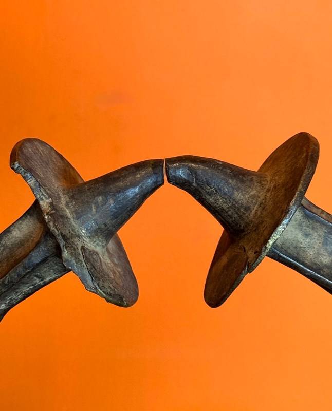 These neck rings were used as traditoinal high value, prestige currency and as wedding dowries. They were often made by melting down smaller value manilas and cast using the traditional lost wax technique. Spiral designs in Yoruba culture and cosmology signify continuity and the cyclical nature of life.