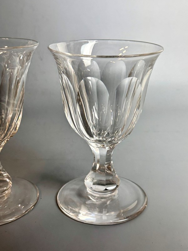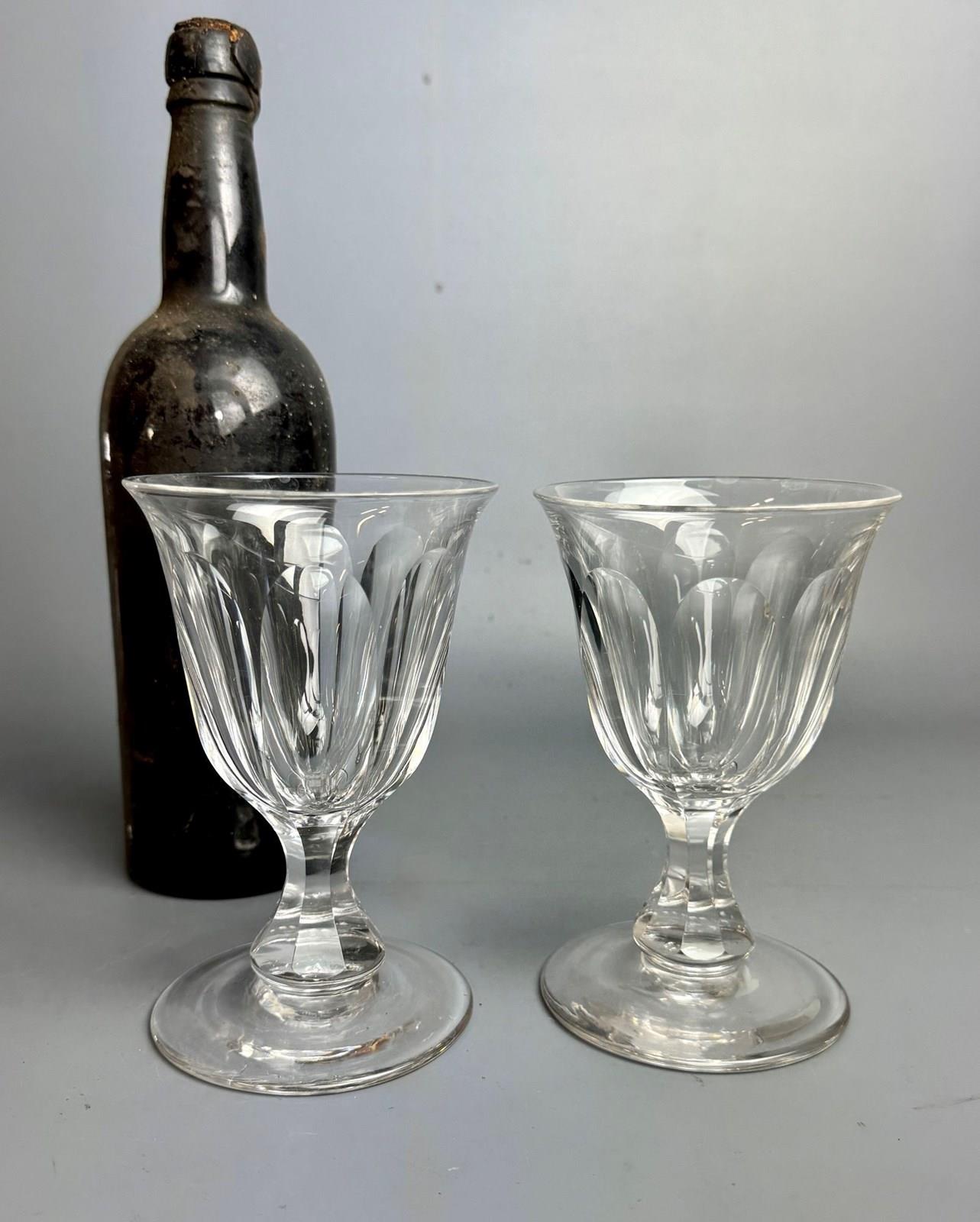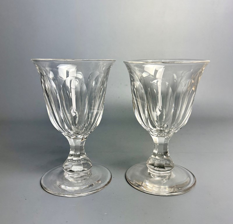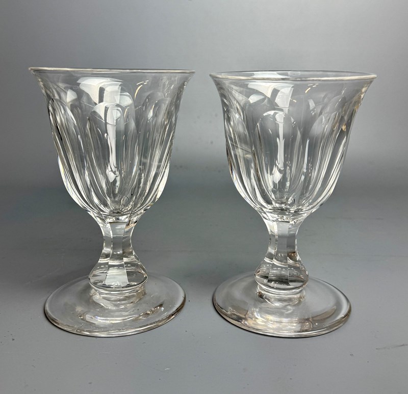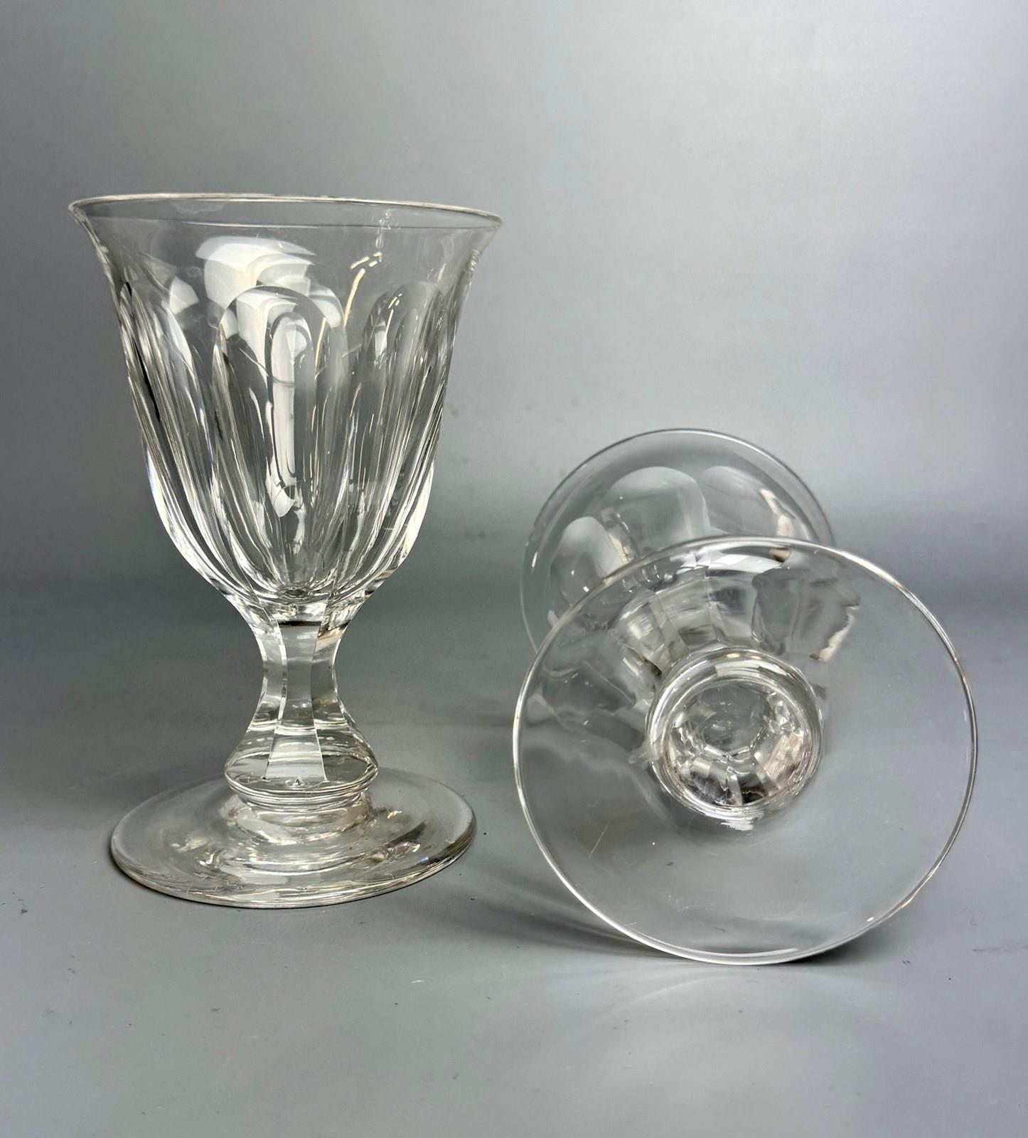 A large pair of Victorian cut glass rummers / wine glasses, the panel cut bowls with slightly flared rims, upon waisted panel cut and knopped stems terminating in a circular foot with polished pontil.