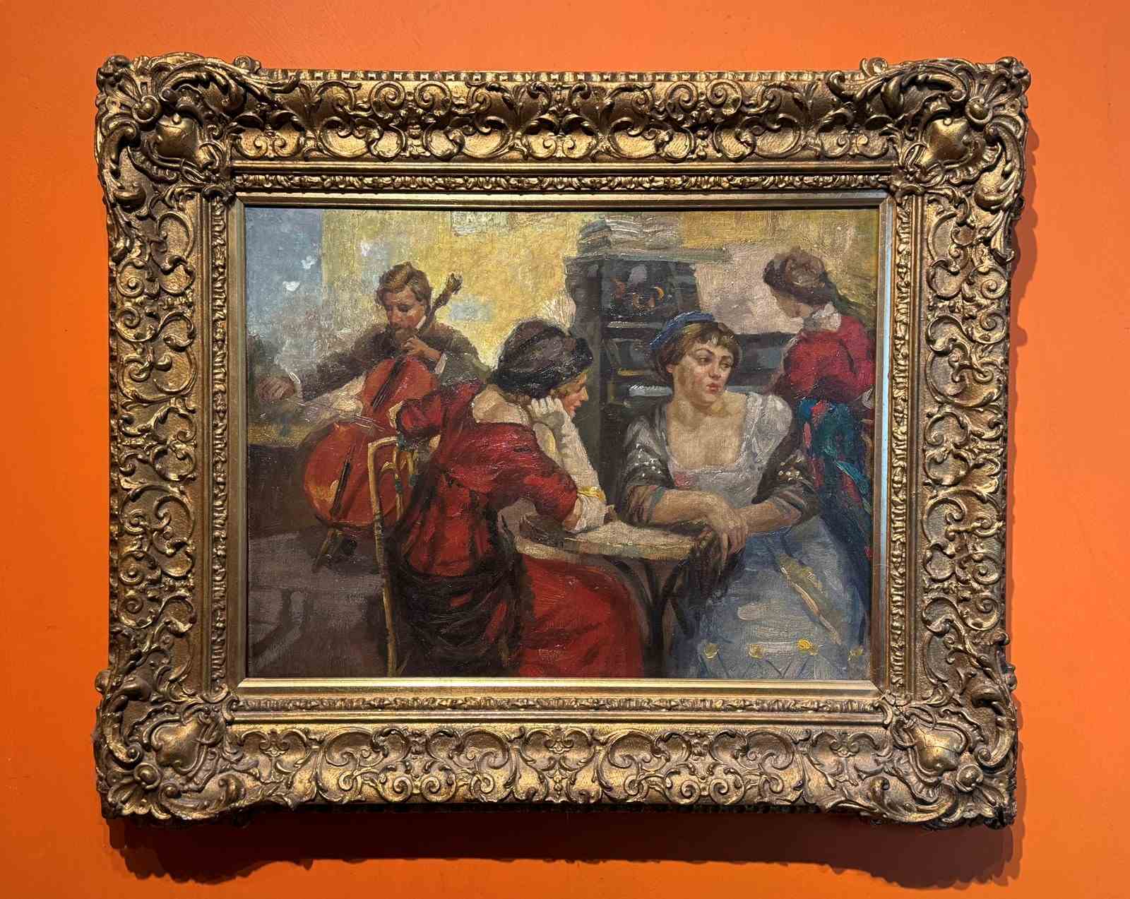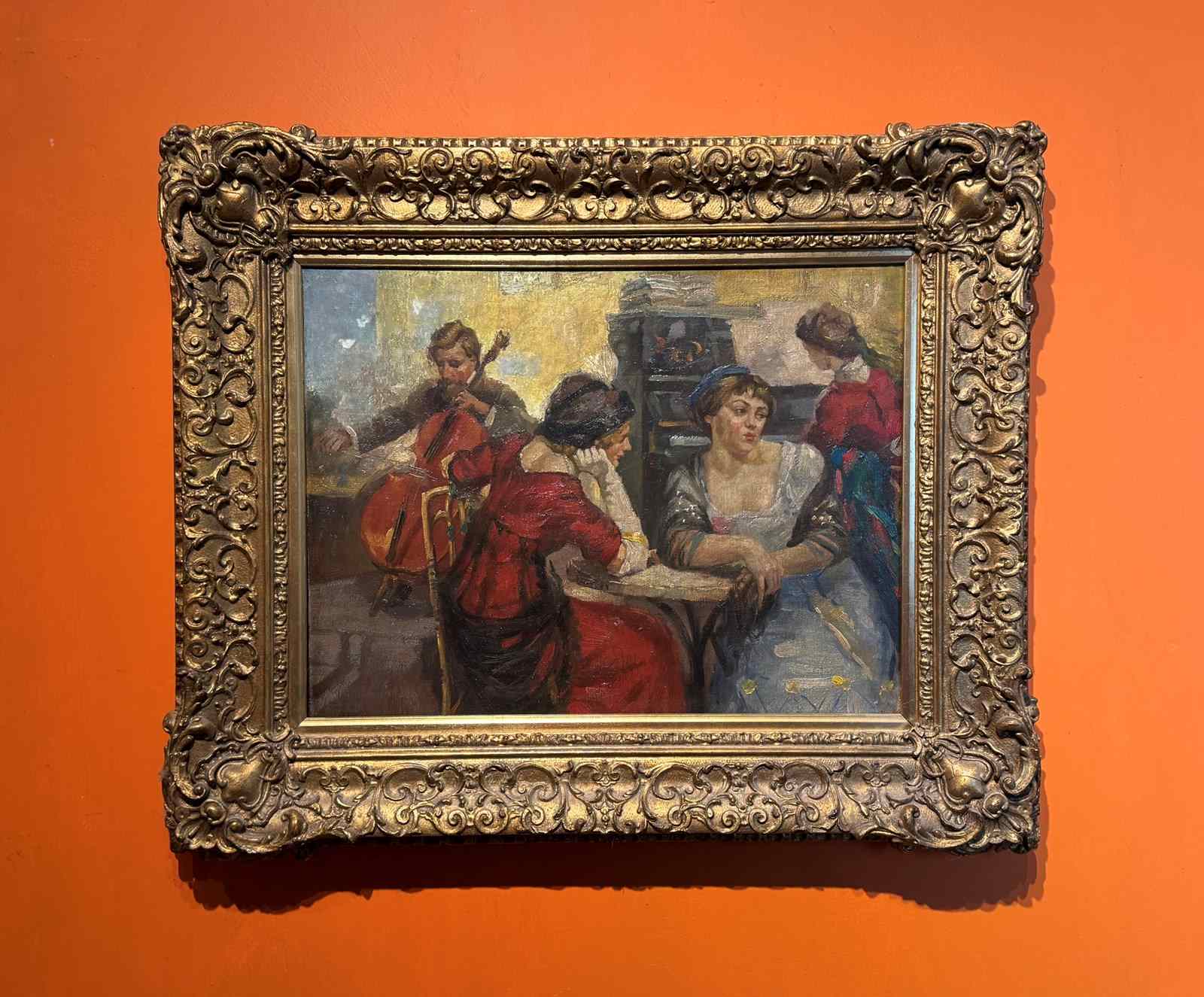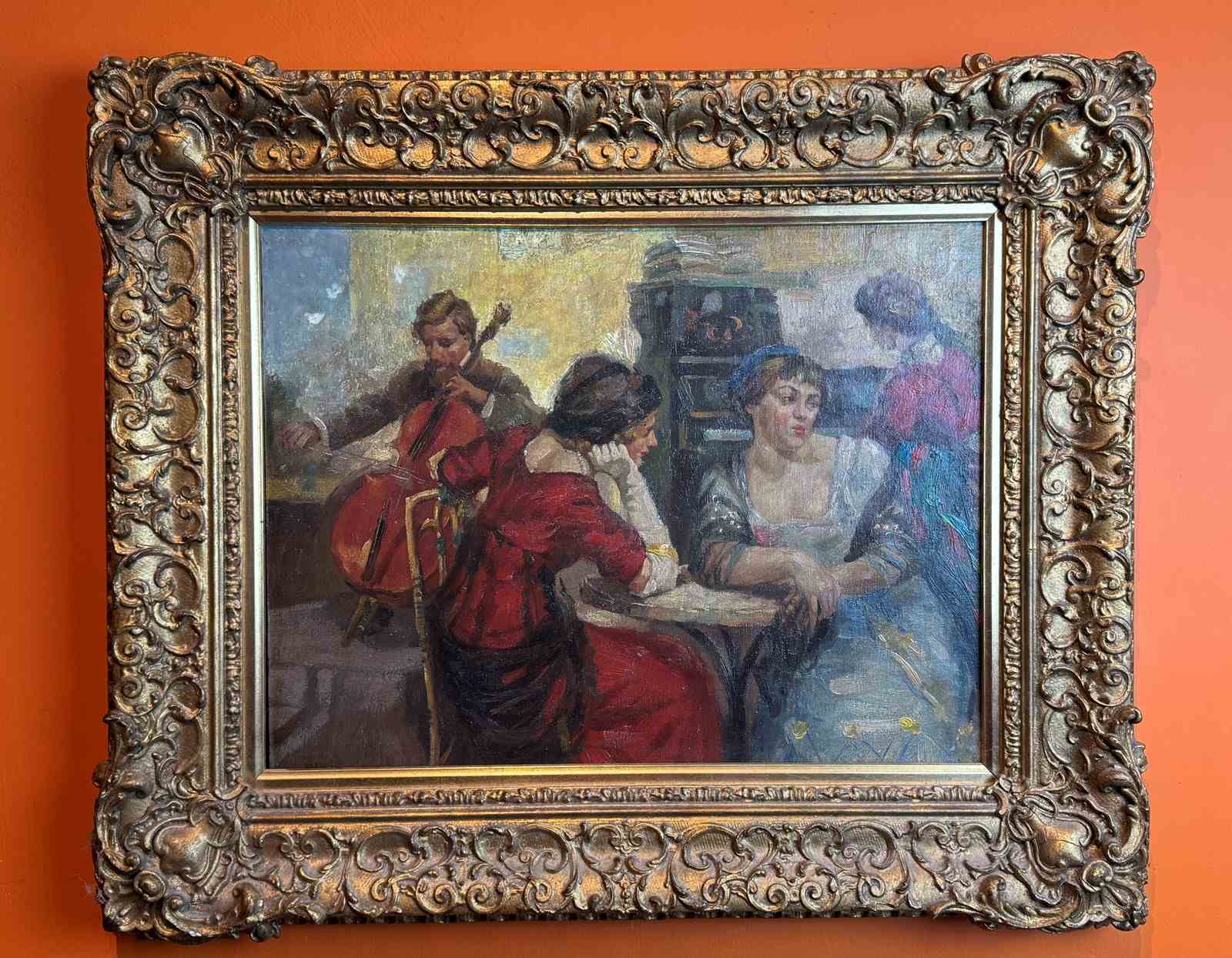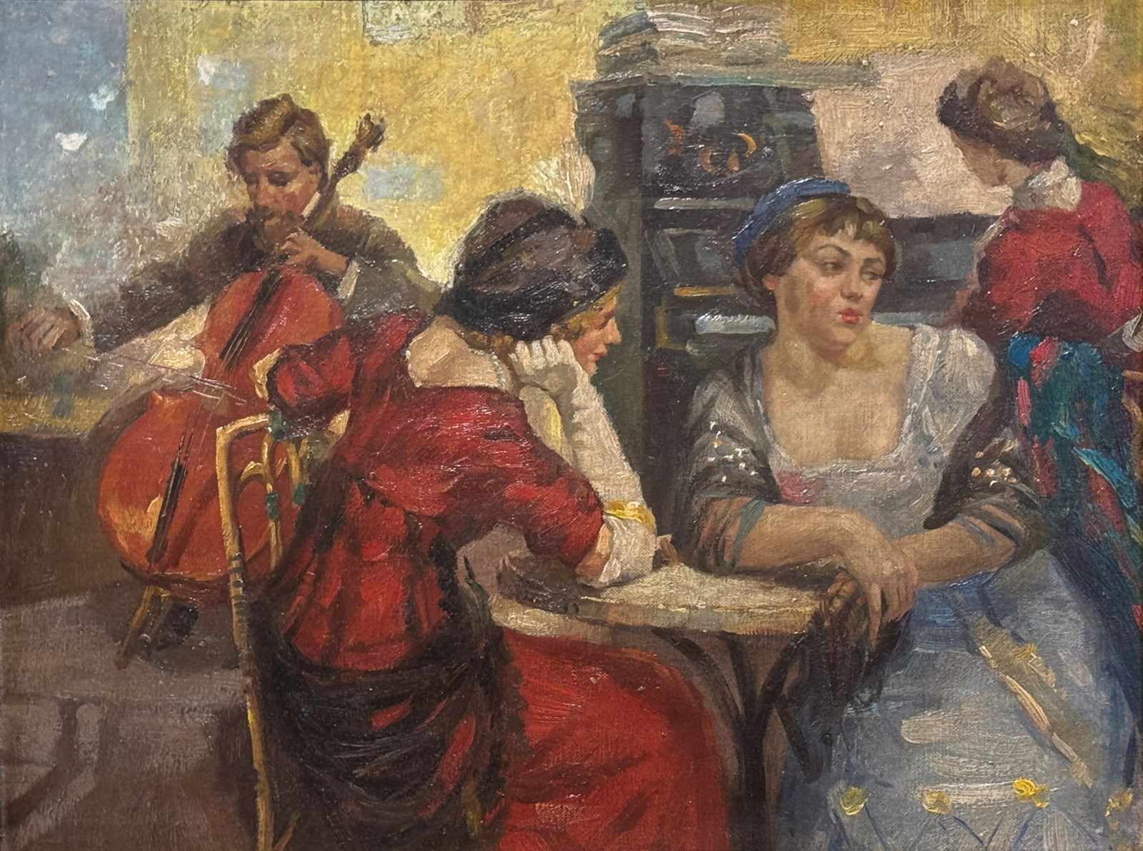 Manner of Ulisse Caputo, early 20th Century, a Belle Epoque cafe scene of two elegant ladies at a table with cello Player and pianist, oil on canvas, within a gilt-gesso frame.