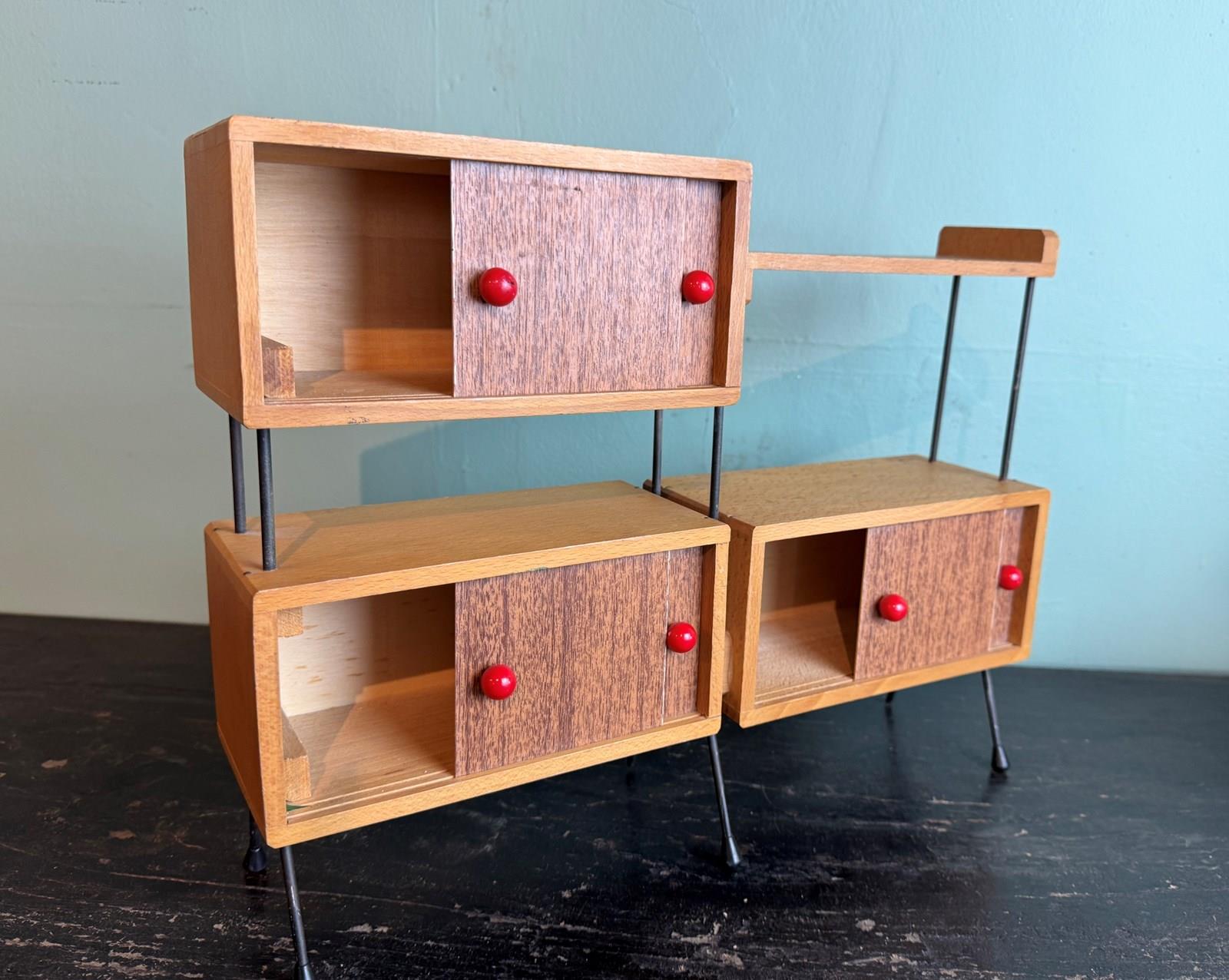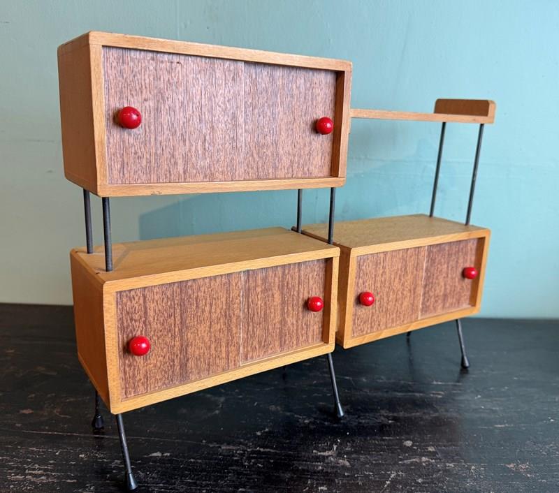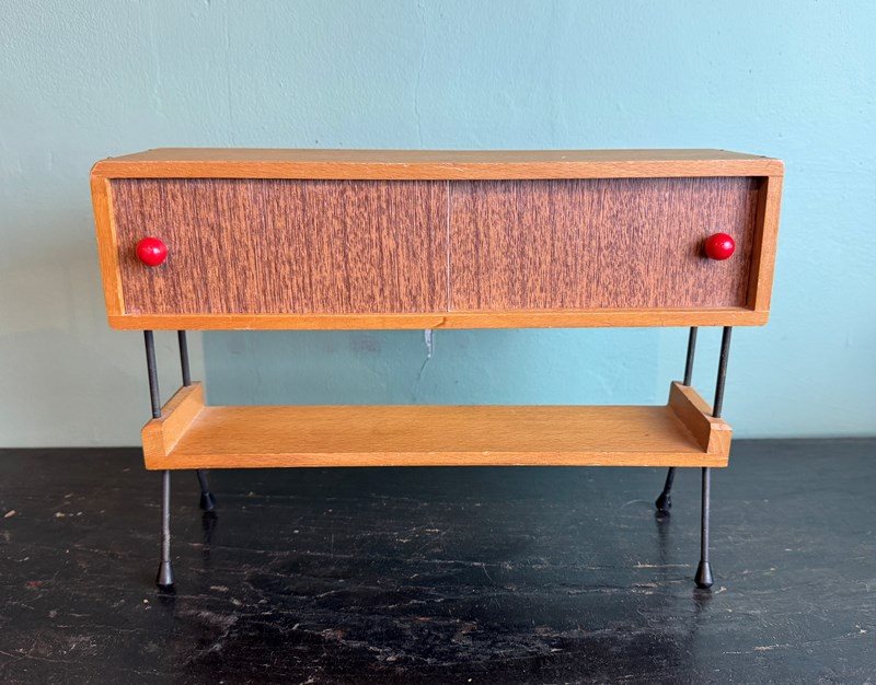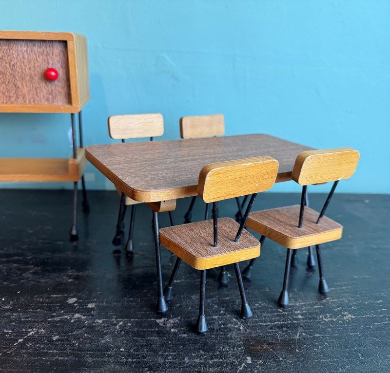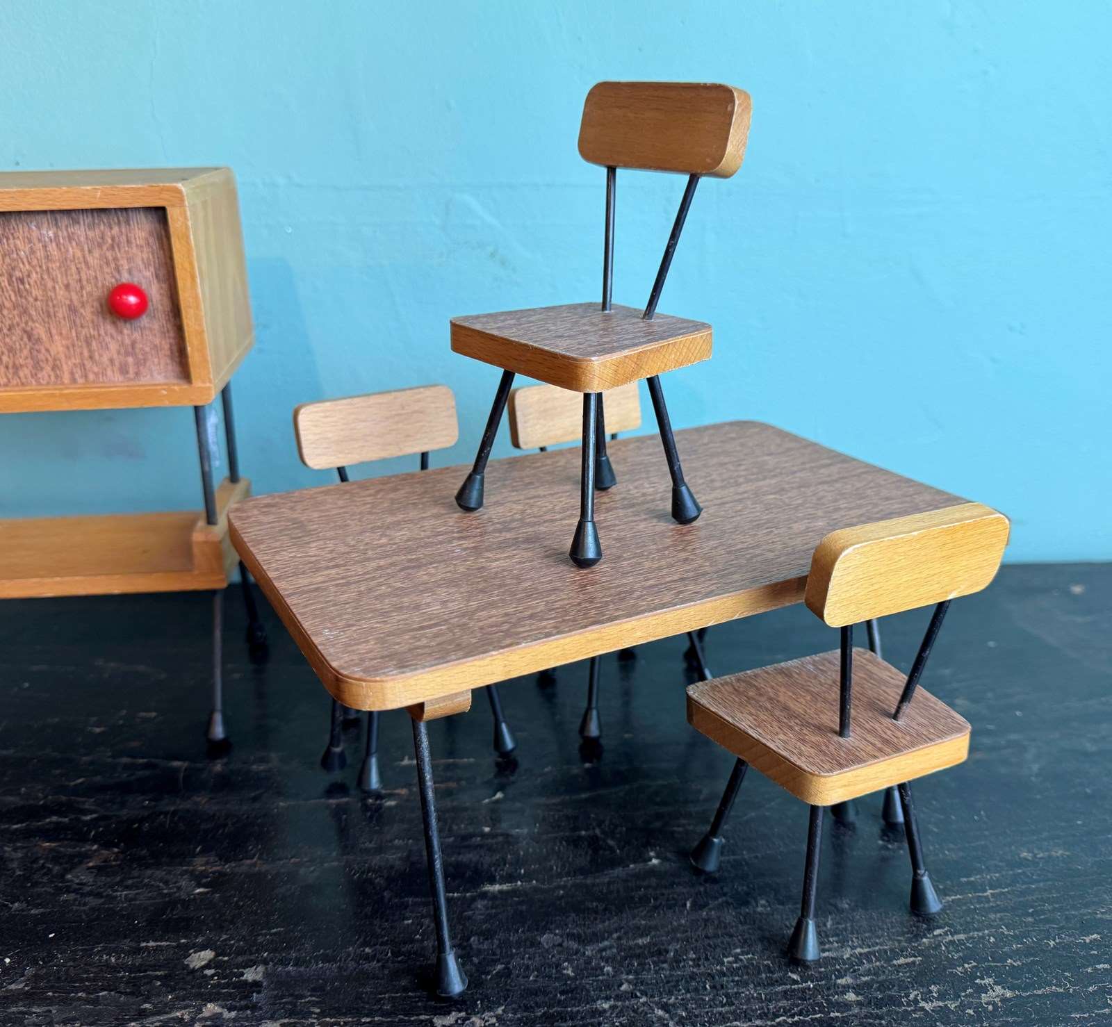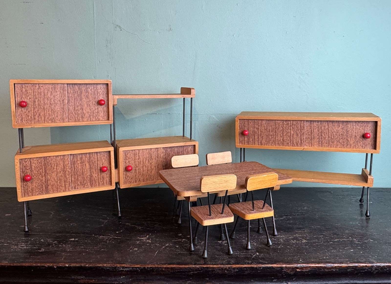 A charming set of 1960's Italian miniature dining room furniture, comprising a dresser, sideboard and table with four chiars. Recenty purchased in Italy.