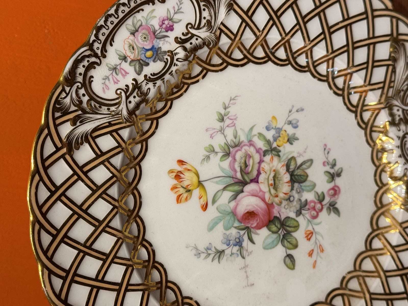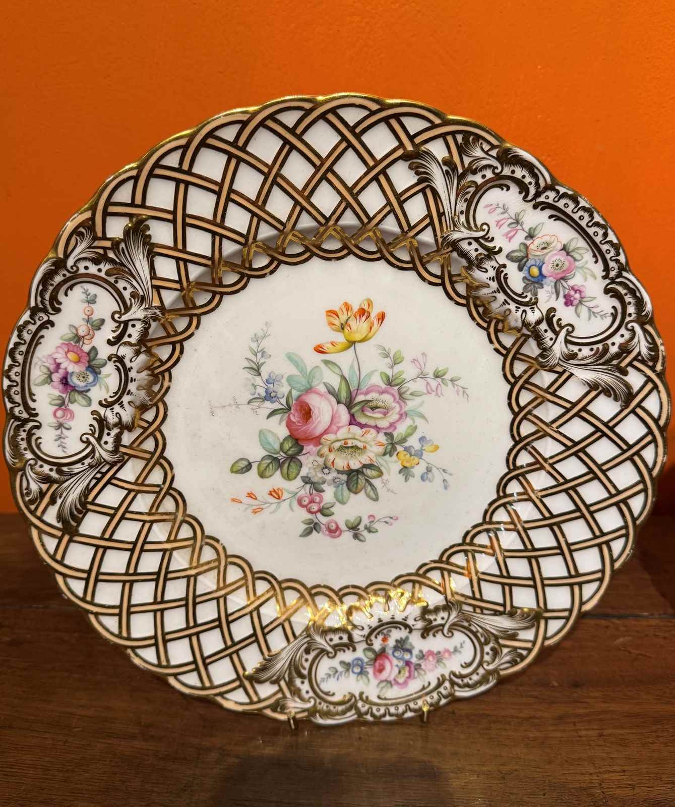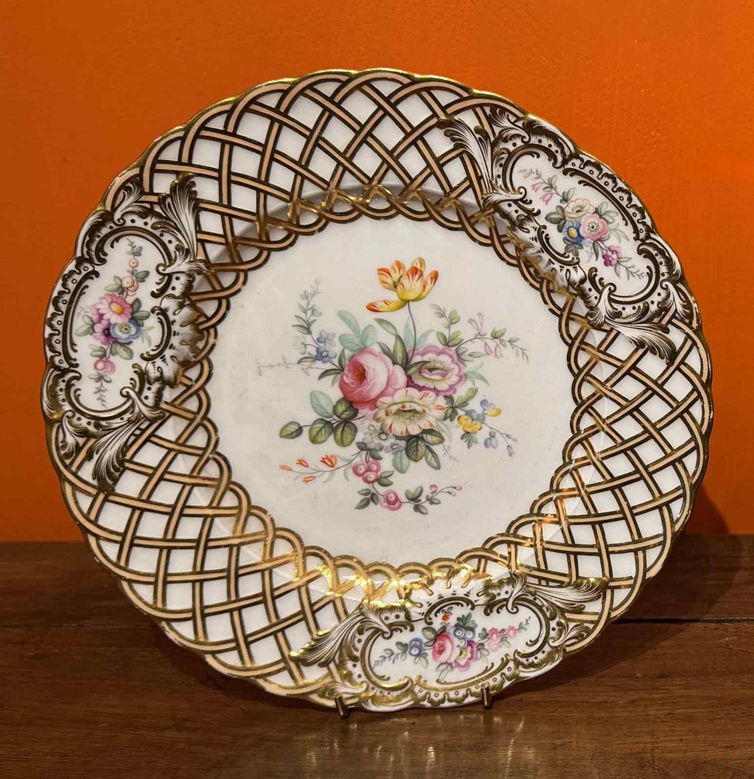 A Minton Newcastle shape basketweave moulded porcelain plate, circa 1850, possibly by Joseph Bancroft, centrally painted in coloured enamels with a floral spray within a moulded basketweave border with reserves of floral posies and enriched in gilt.