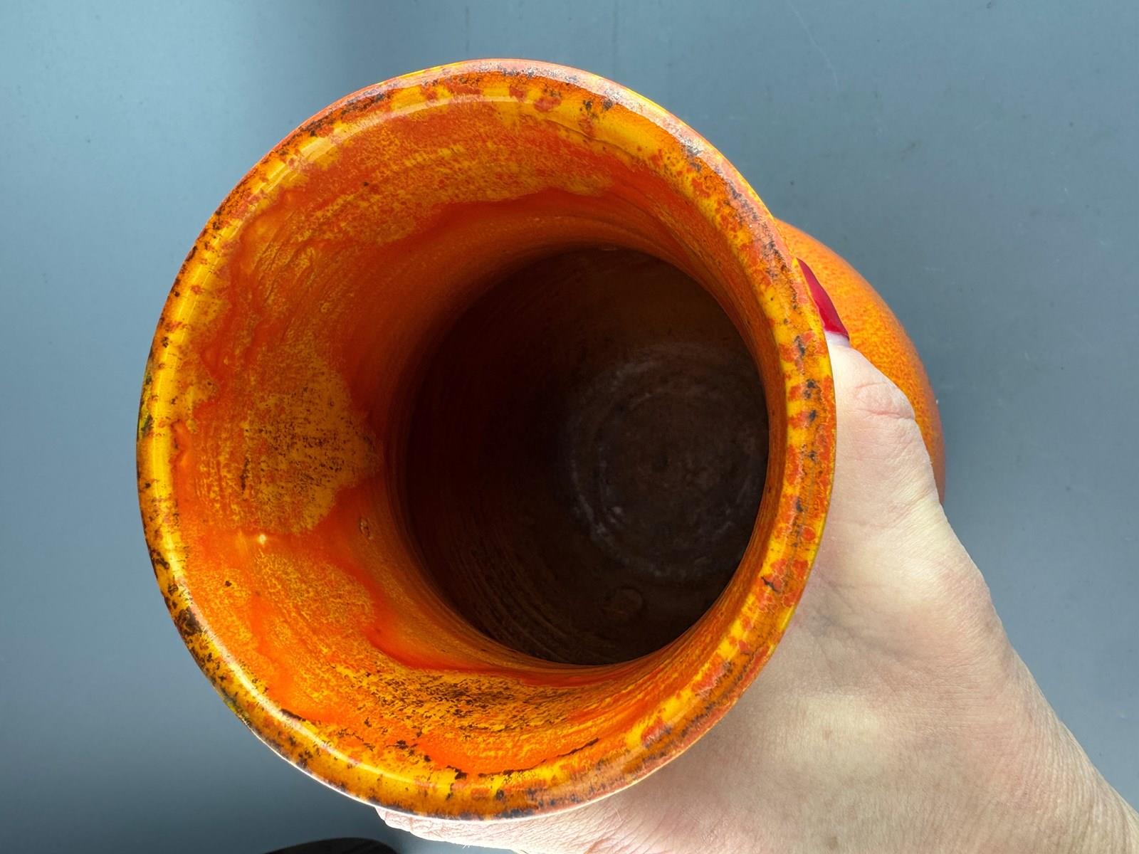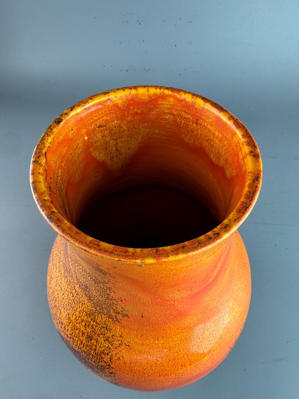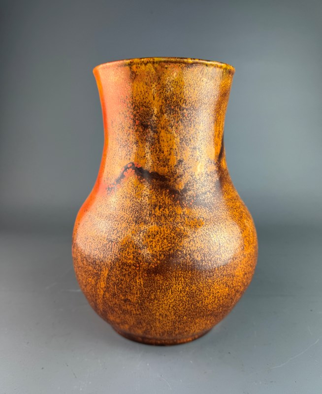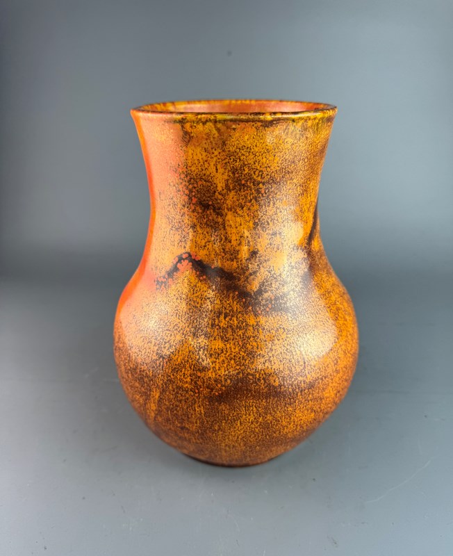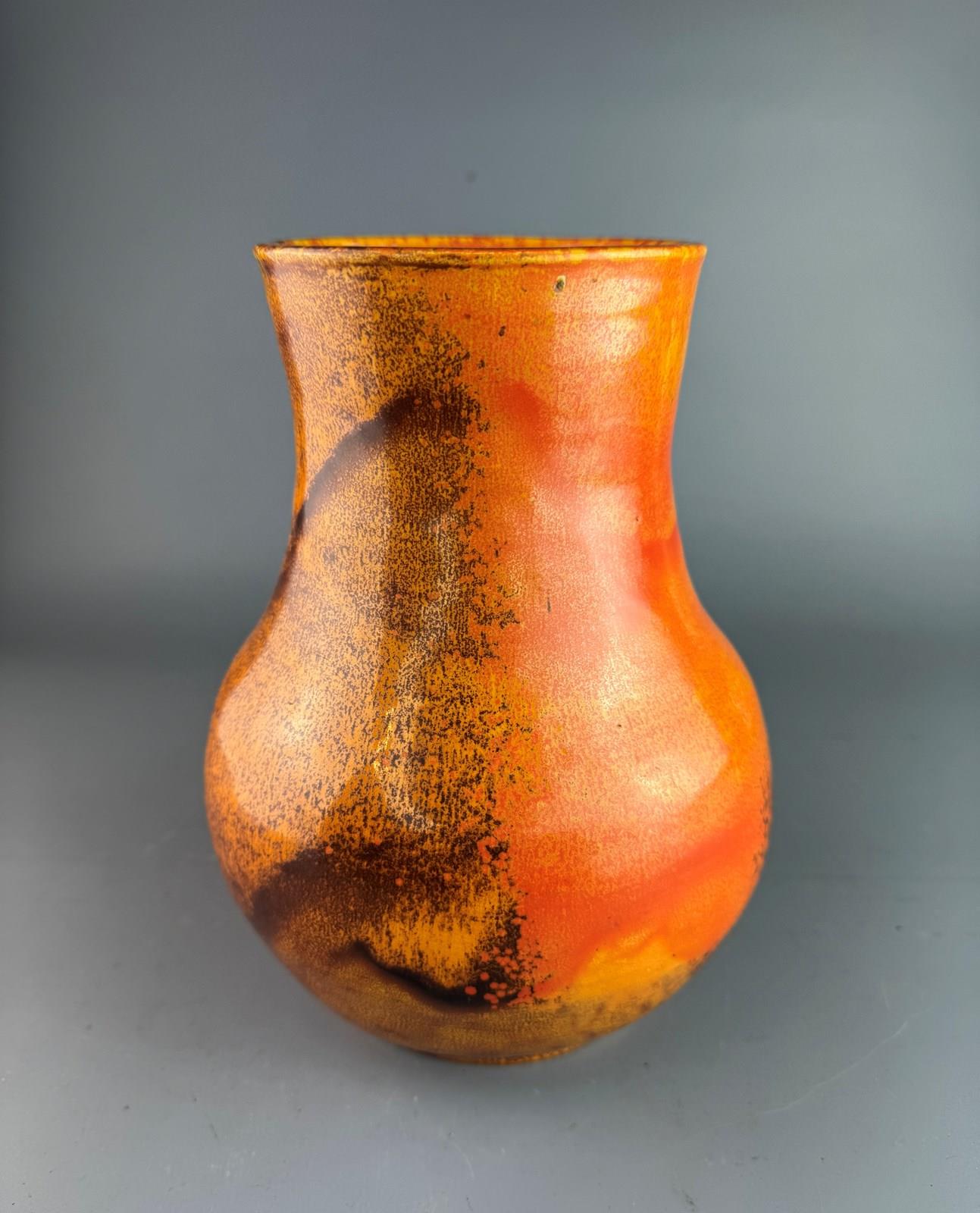 A studio pottery vase, mid 20th Century, of baluster form with mottled orange glaze, the underside impressed with the letter A.