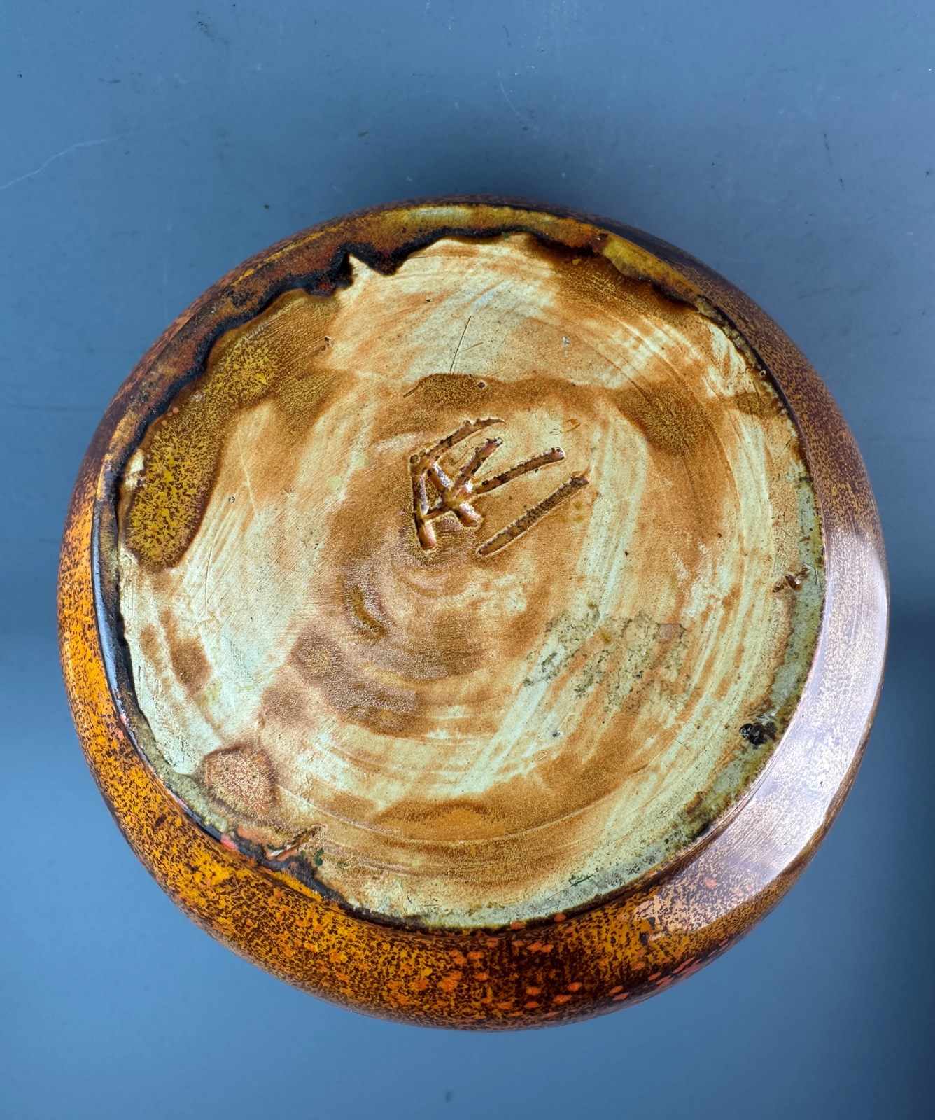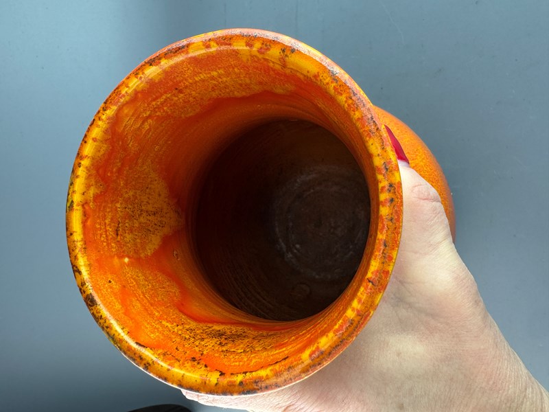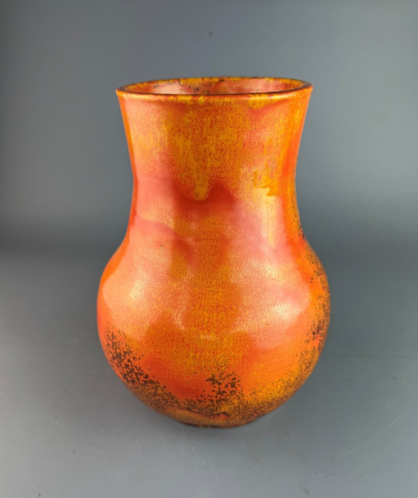 A studio pottery vase, mid 20th Century, of baluster form with mottled orange glaze, the underside impressed with the letter A.