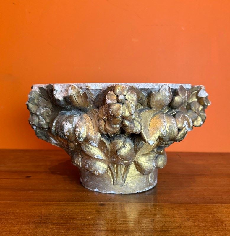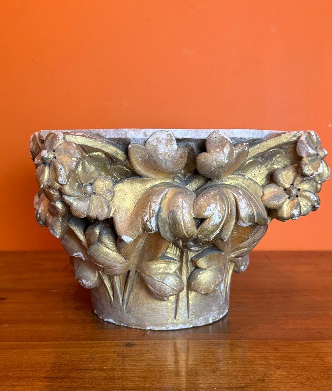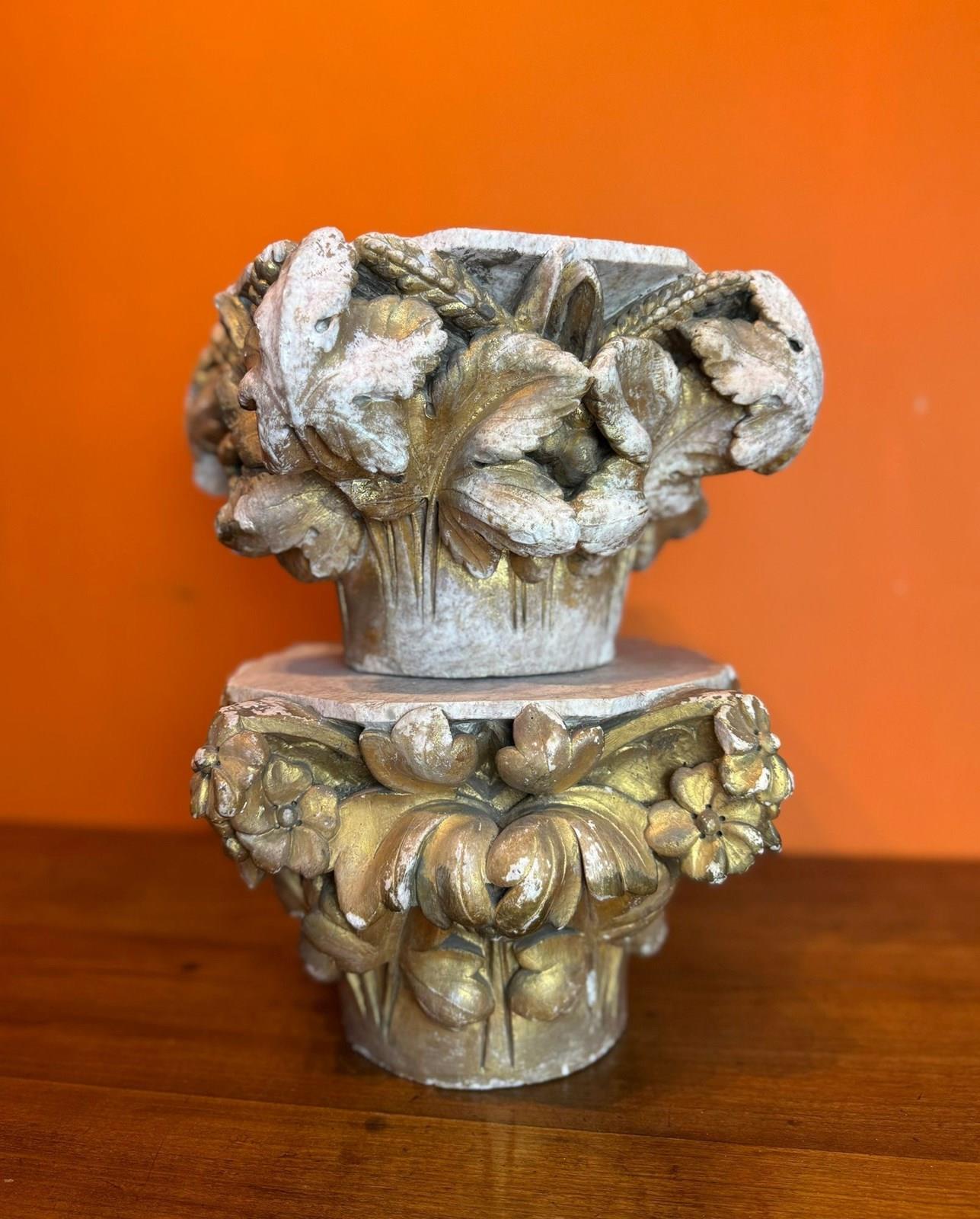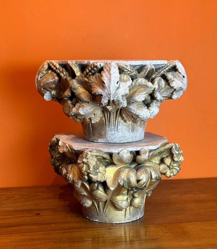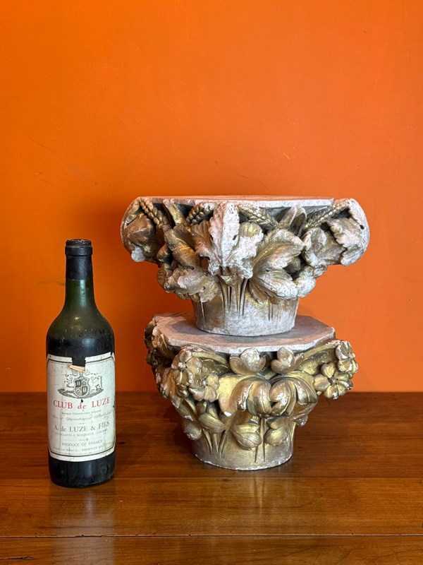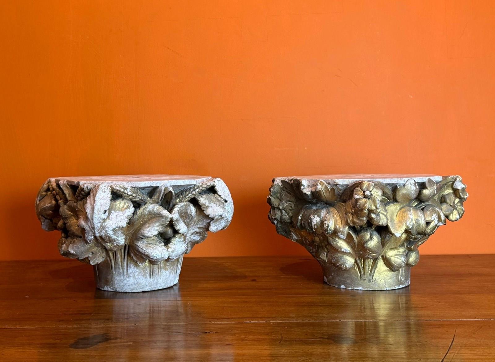 A pair of 19th century carved stone architectural capitals, carved on three sides, one capital with flowers and leaves, the other with sheaves of wheat and leaves, both with races of original gilding.