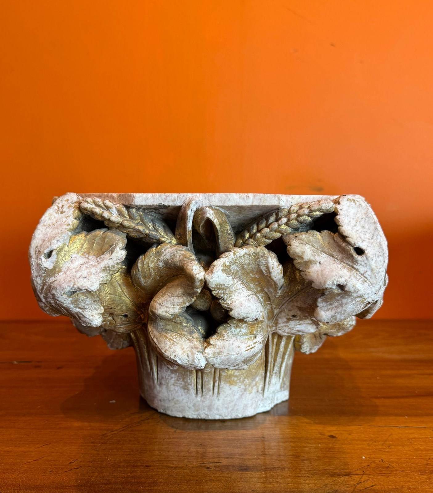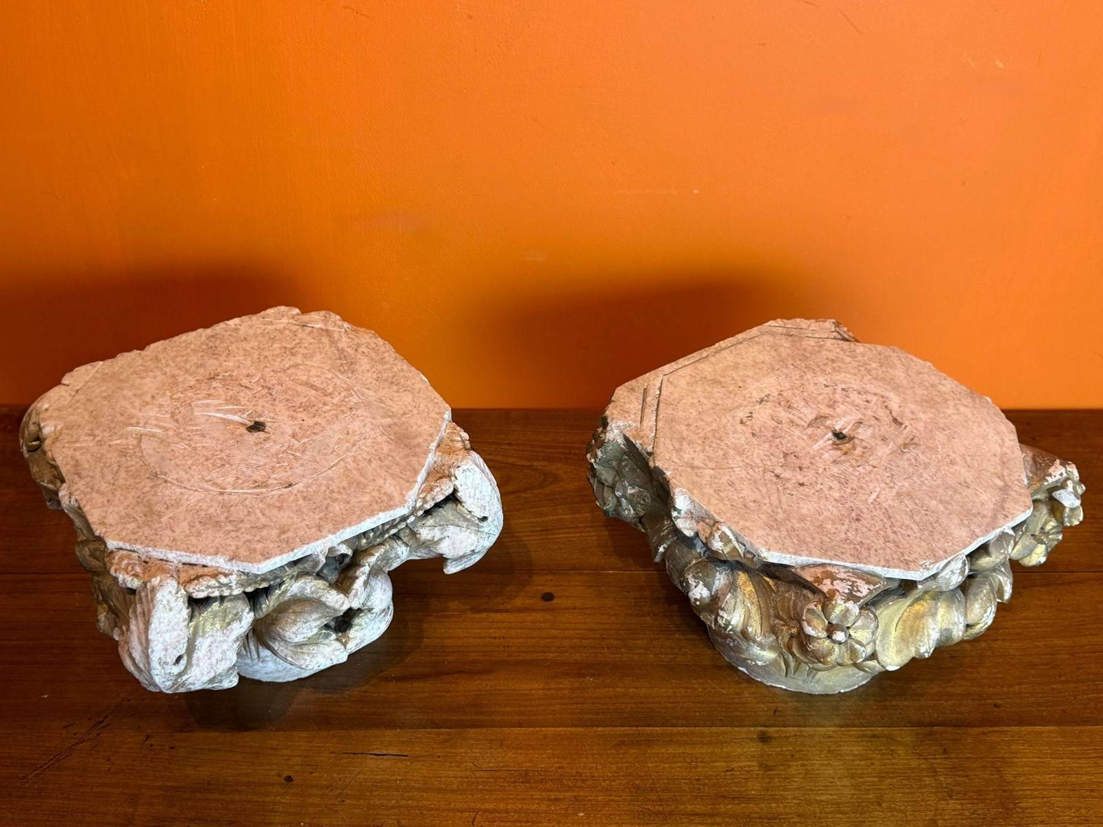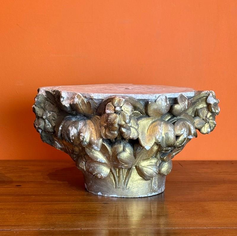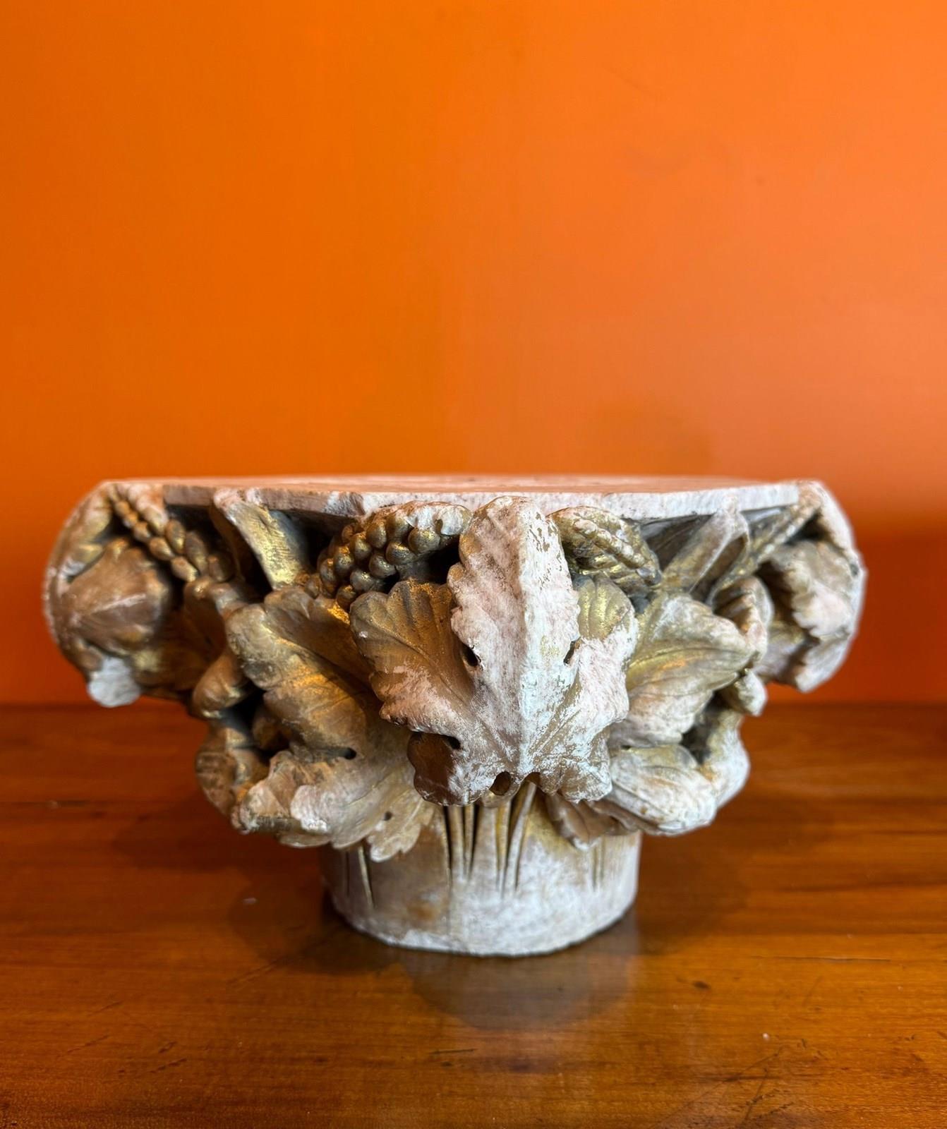 A pair of 19th century carved stone architectural capitals, carved on three sides, one capital with flowers and leaves, the other with sheaves of wheat and leaves, both with races of original gilding.