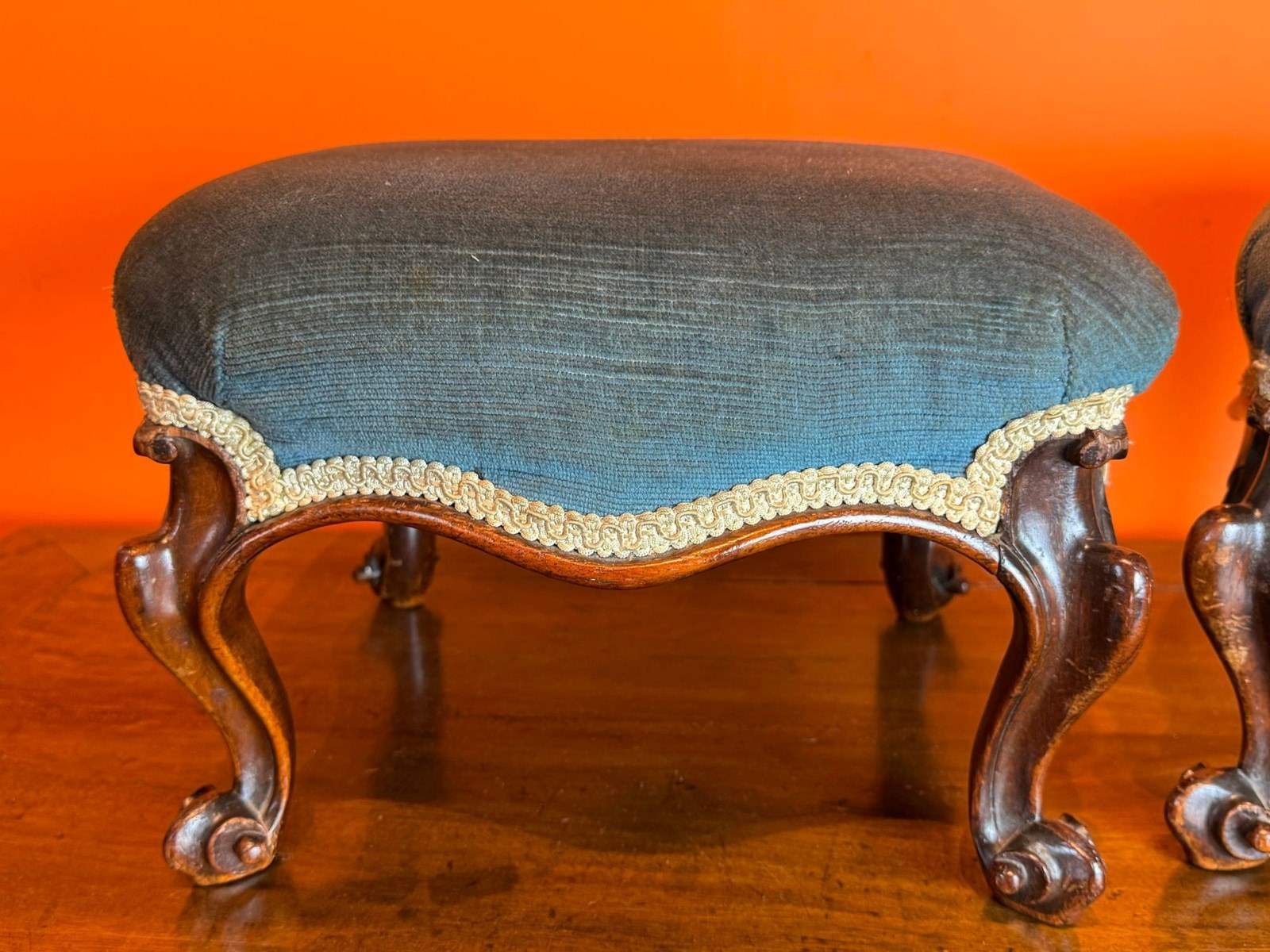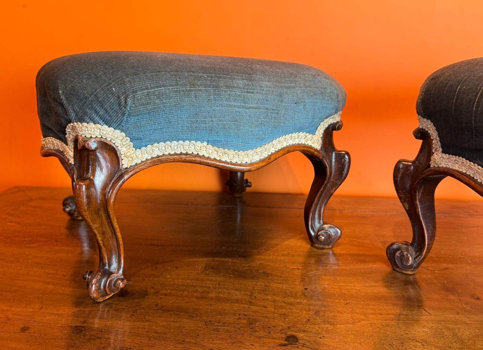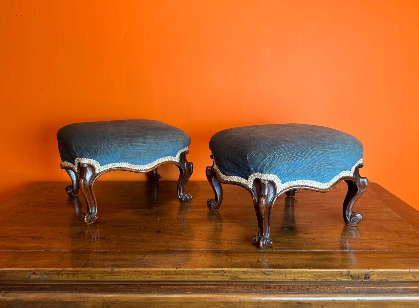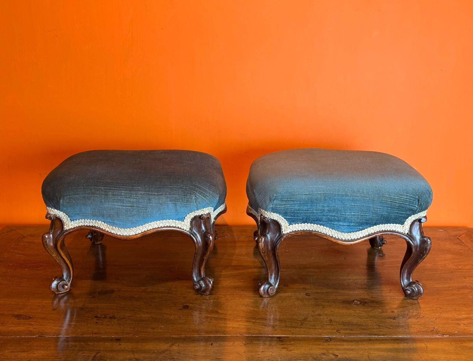 A pair of Victorian rosewood footstools, the upholstered tops upon scroll supports. In excellent condition.