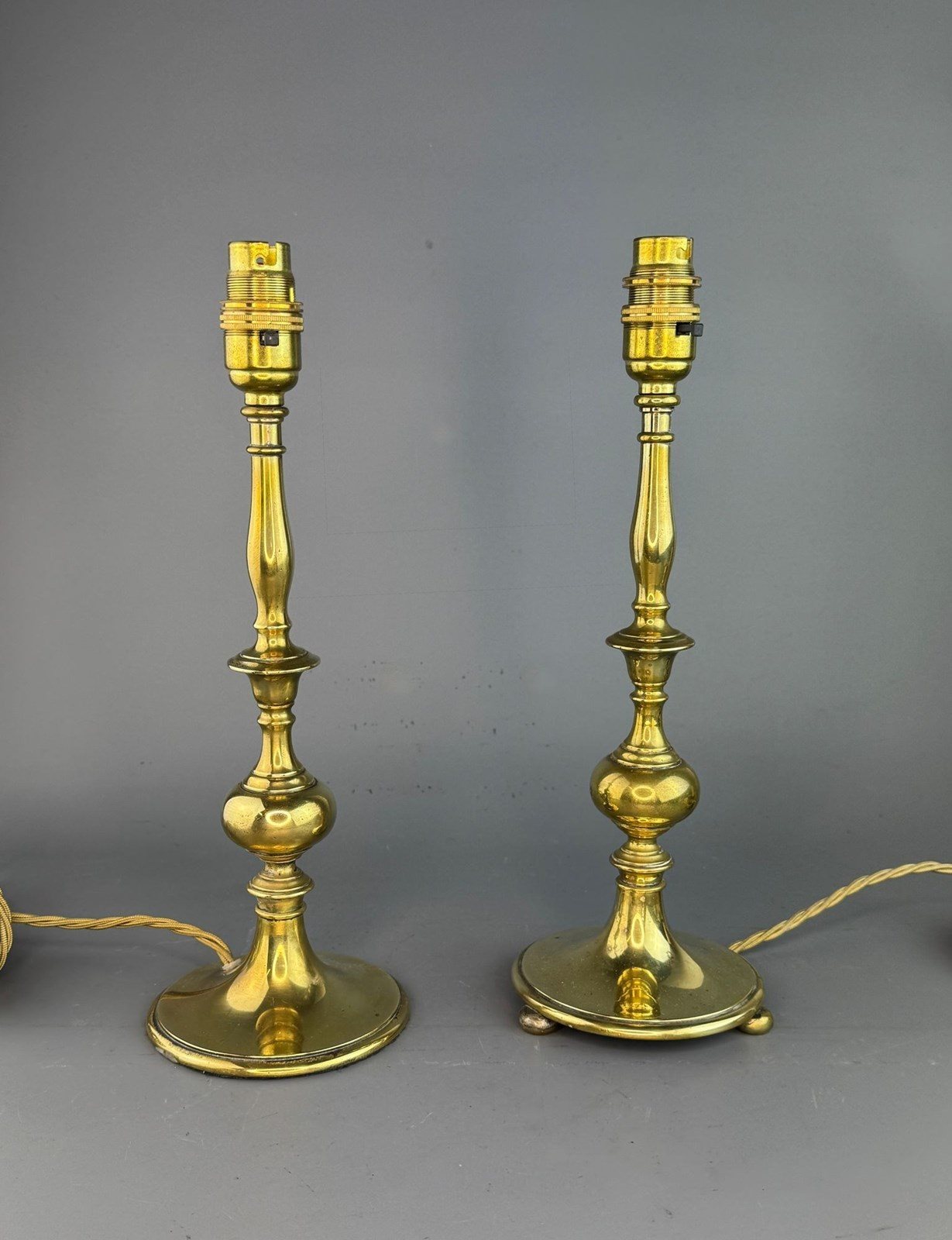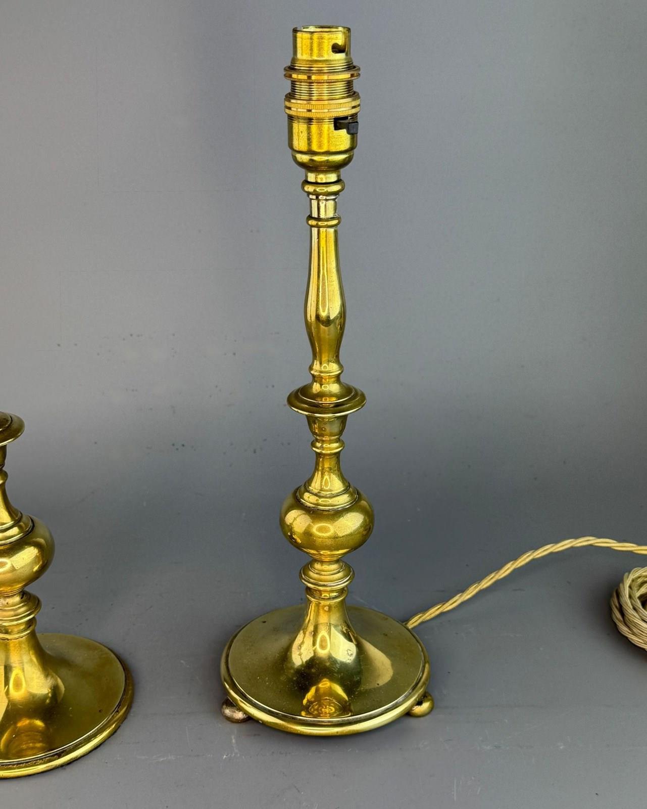 A near matching pair of antique brass table lamps, of baluster form upon a spreading circular base, one upon three ball feet, the second lamp lacking the ball feet.