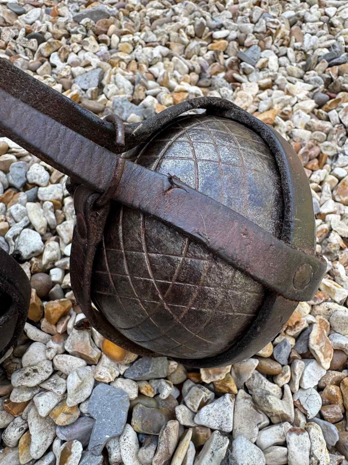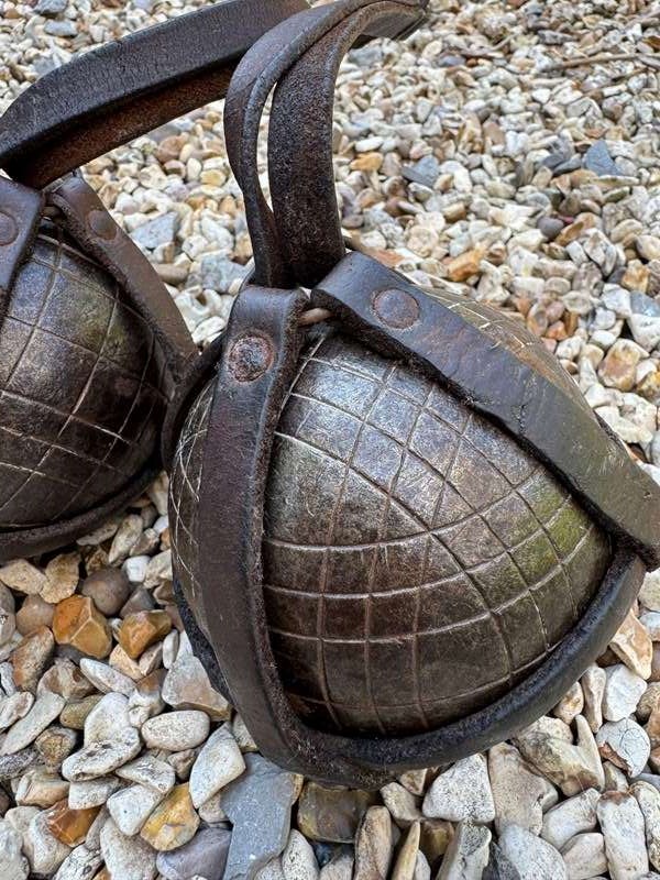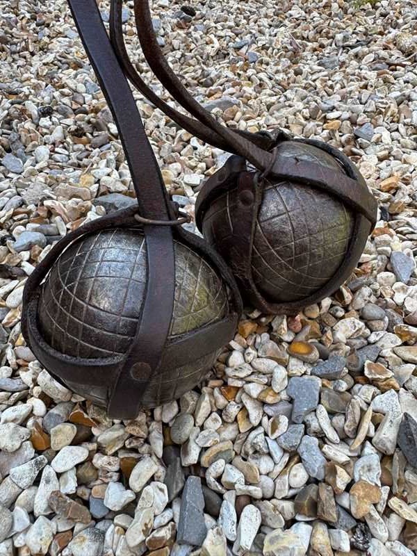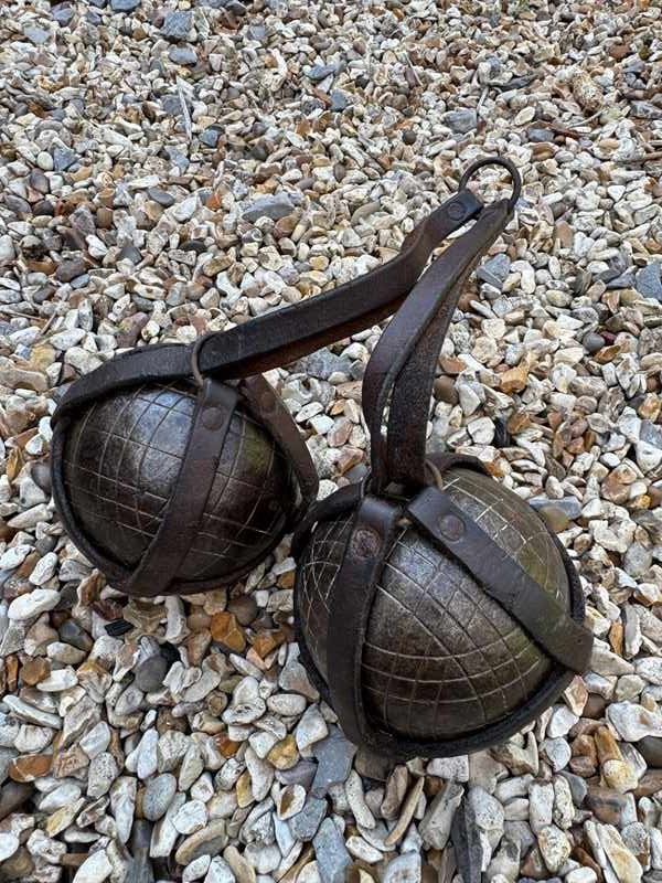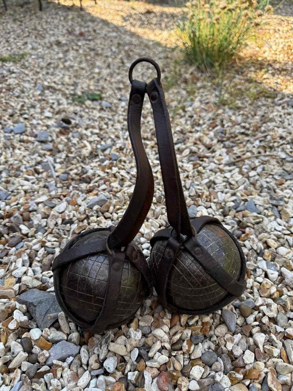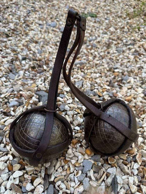 A pair of Antique French petanque boules, the iron balls in their original leather carrying holder.