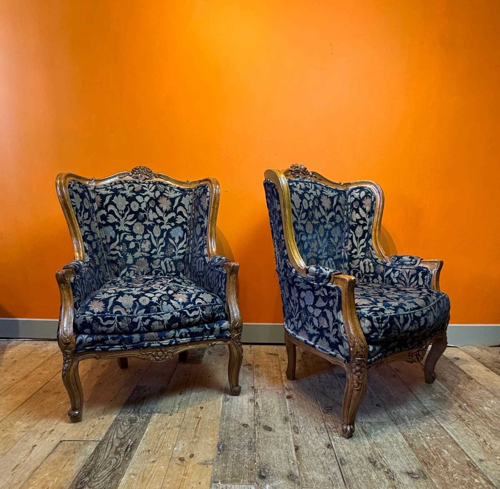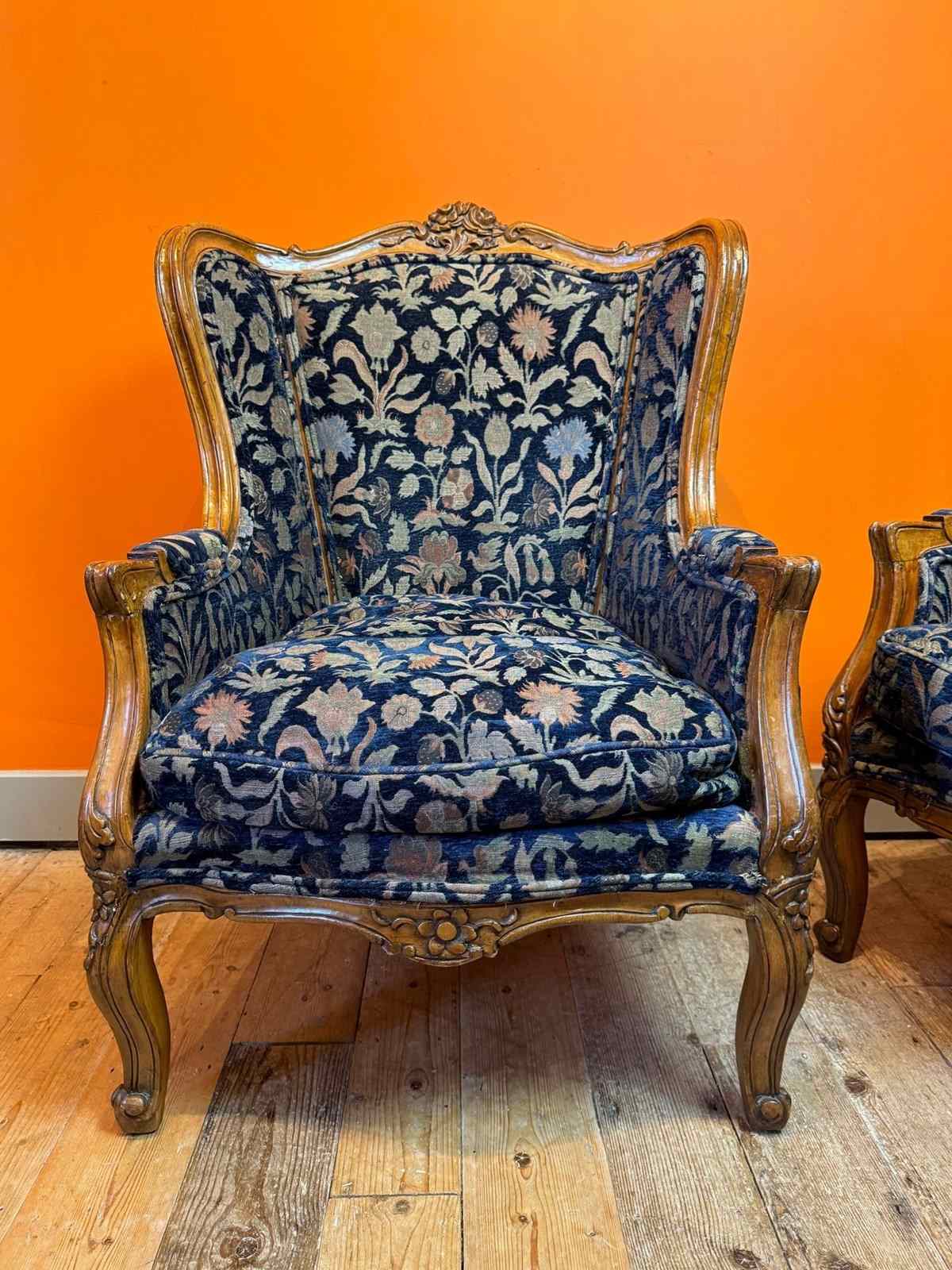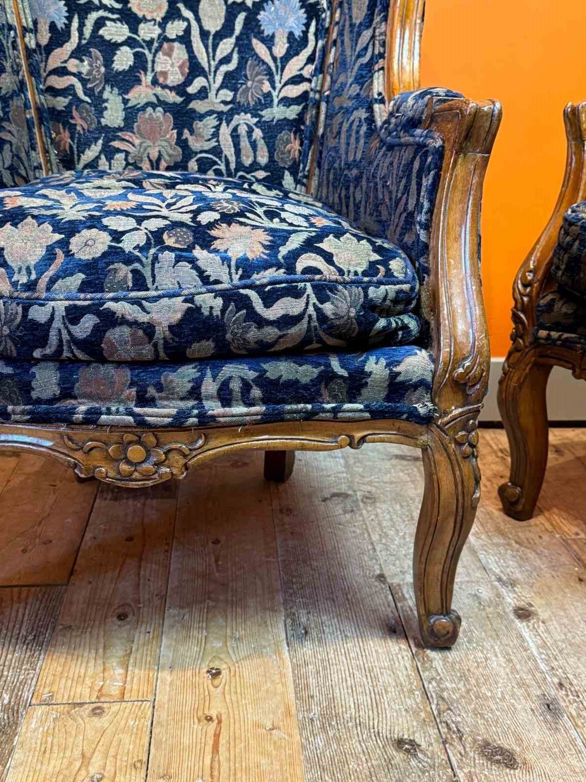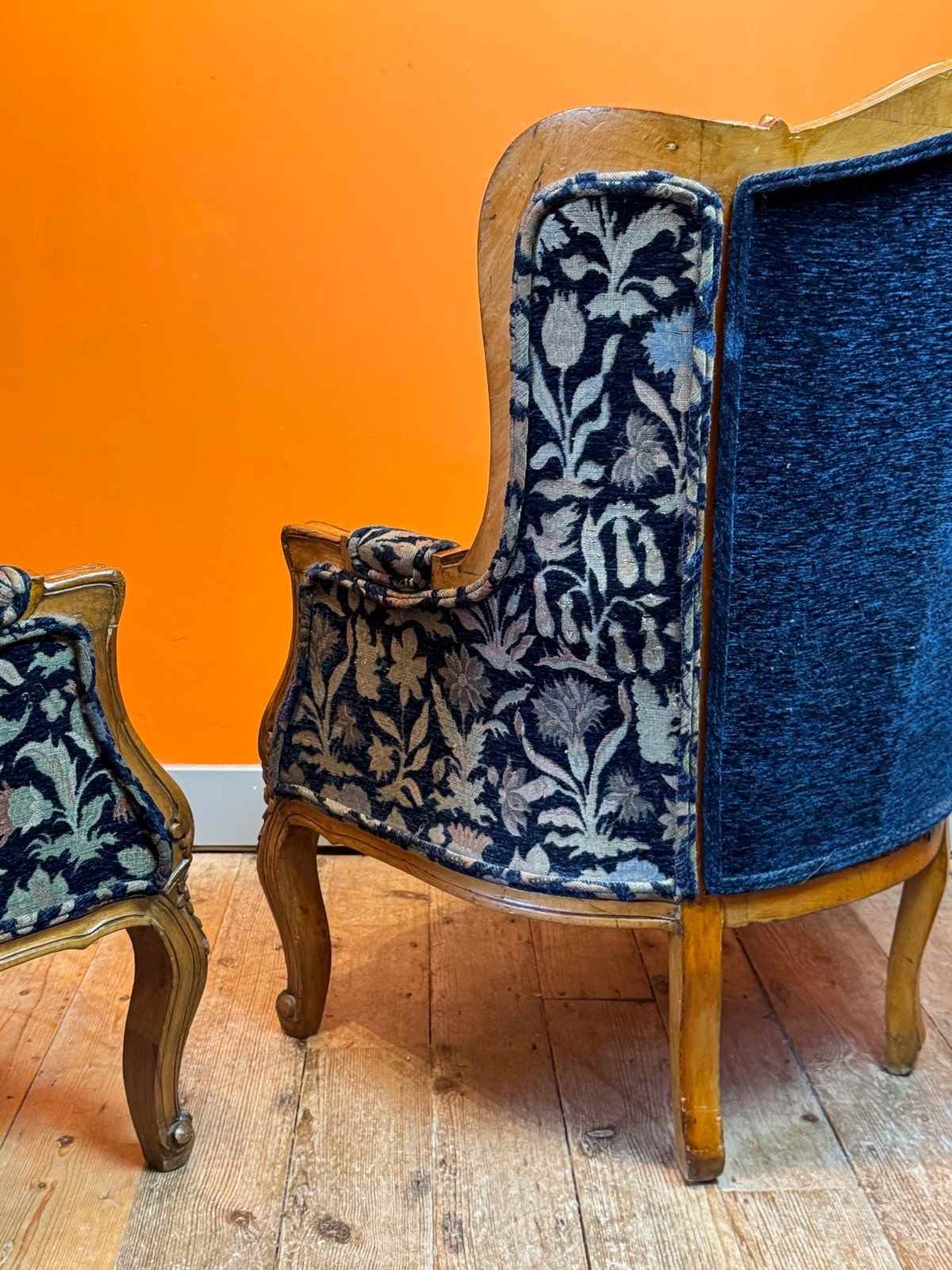A pair of French 19th century carved walnut armchairs in Louis XV style, upholstered in a navy blue cut chenille foliate tapestry fabric, with feather-filled loose seat cushions.