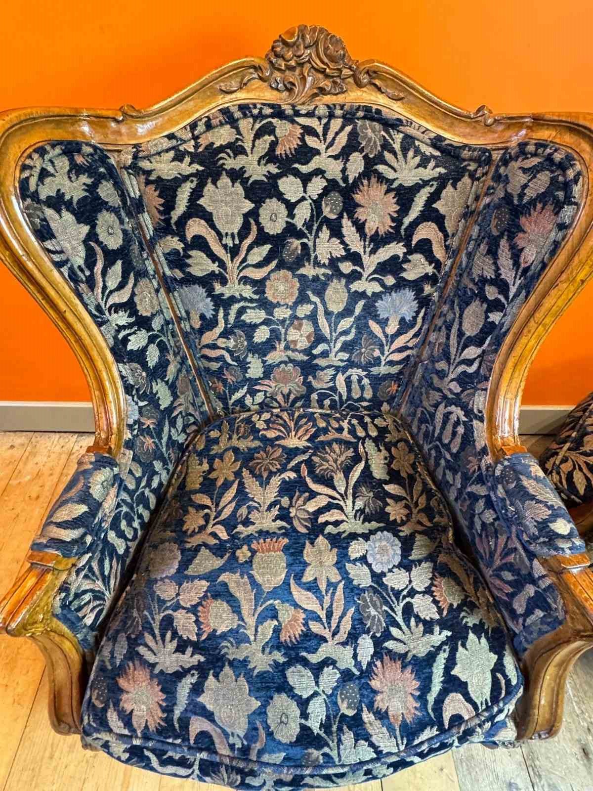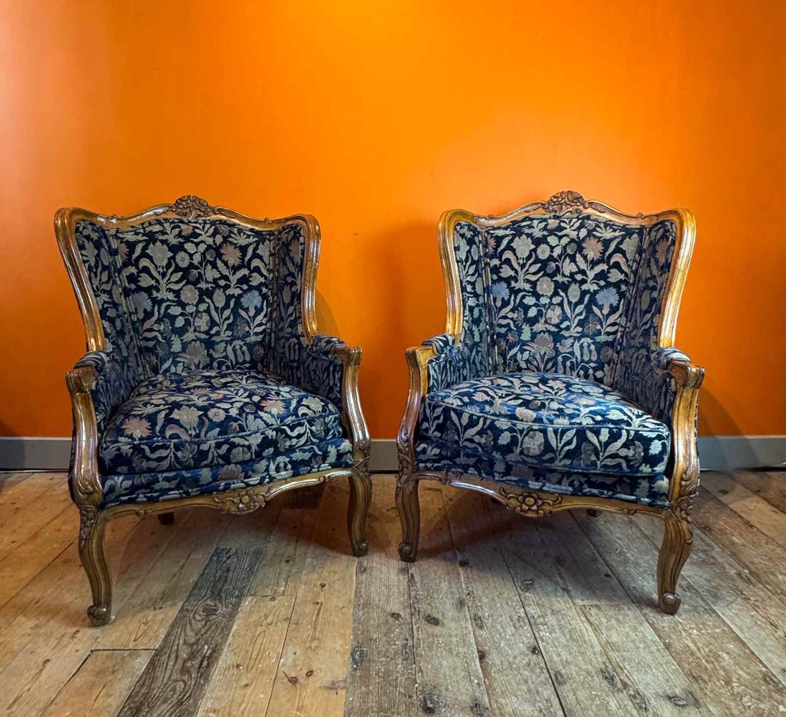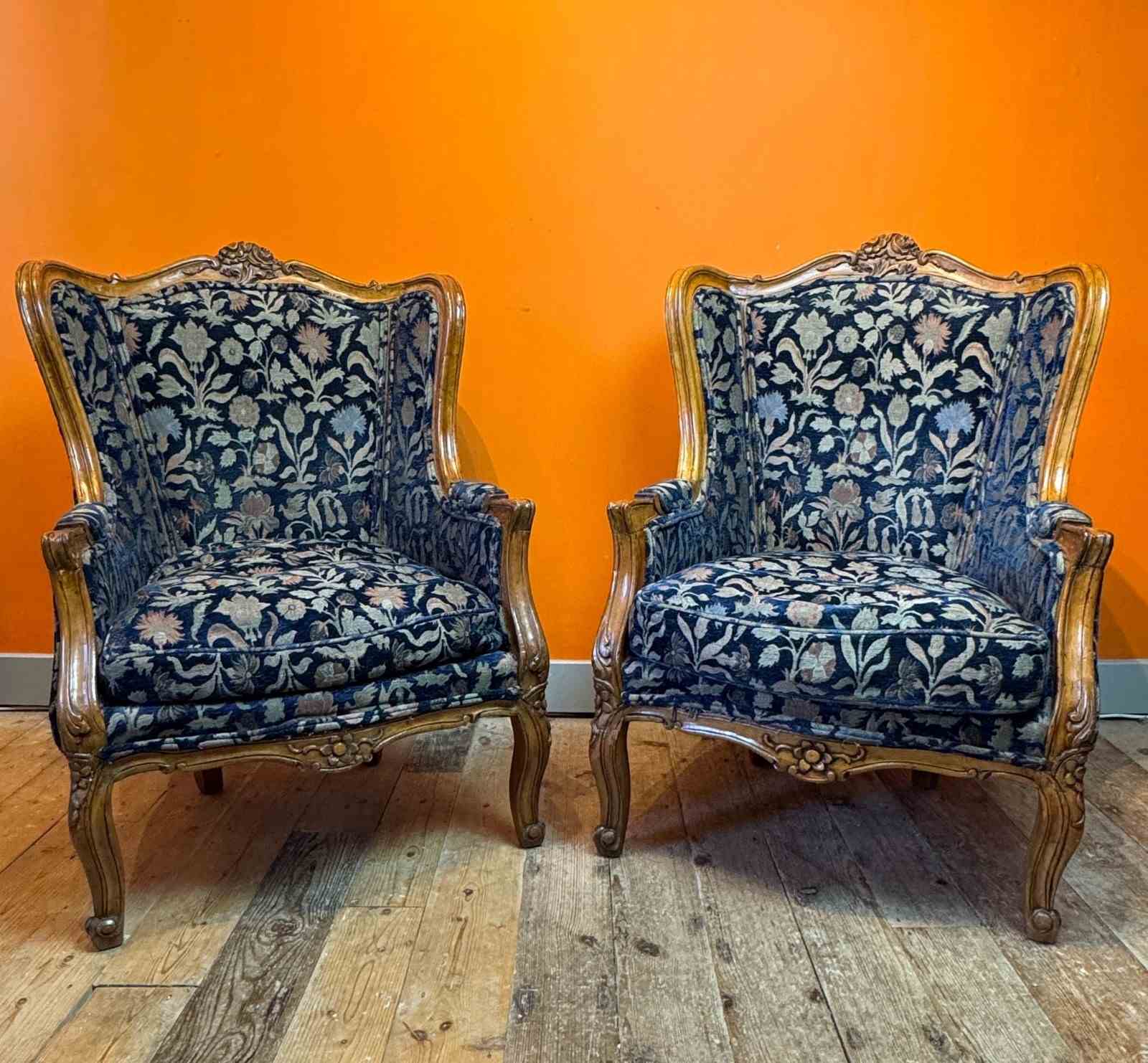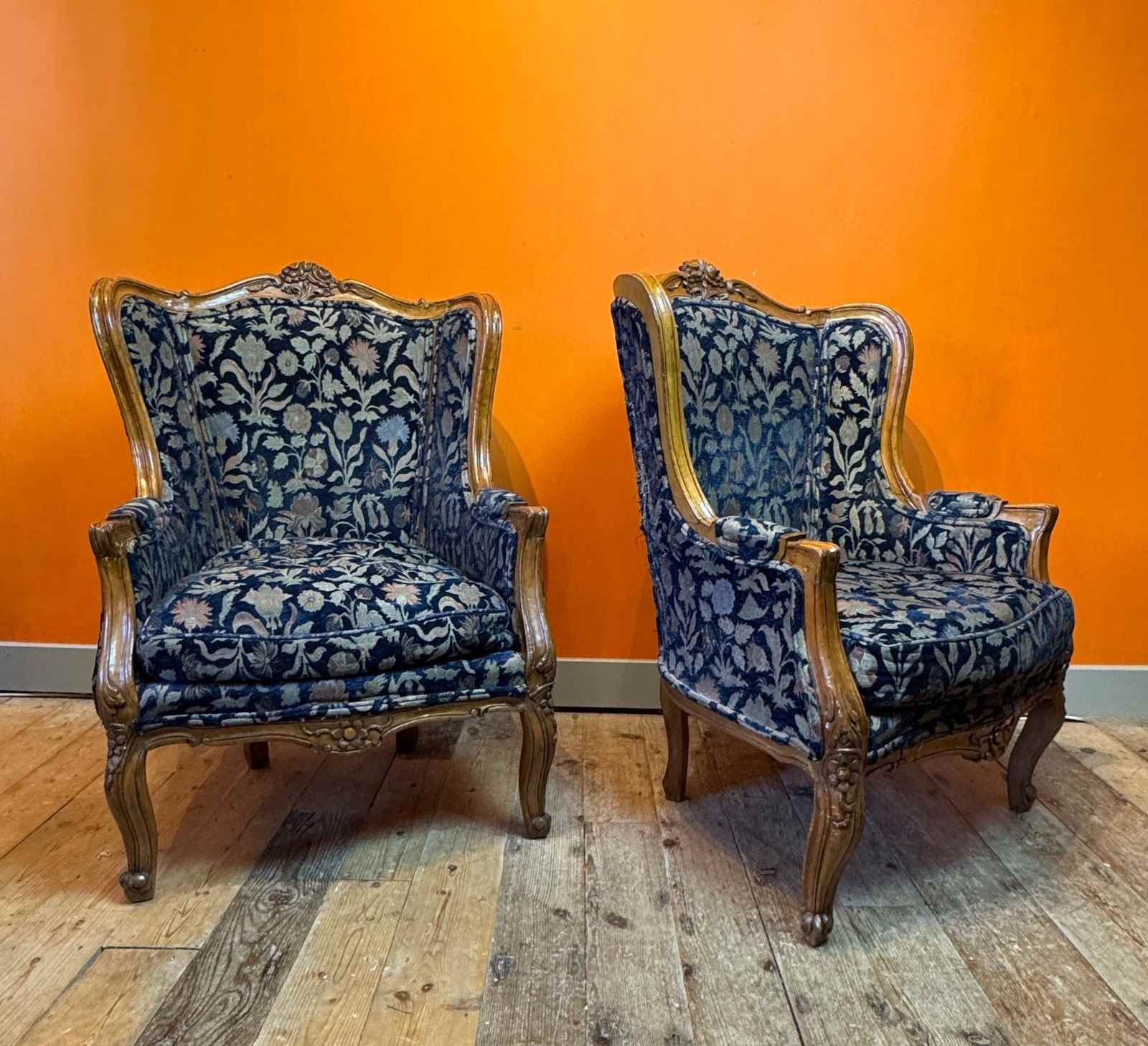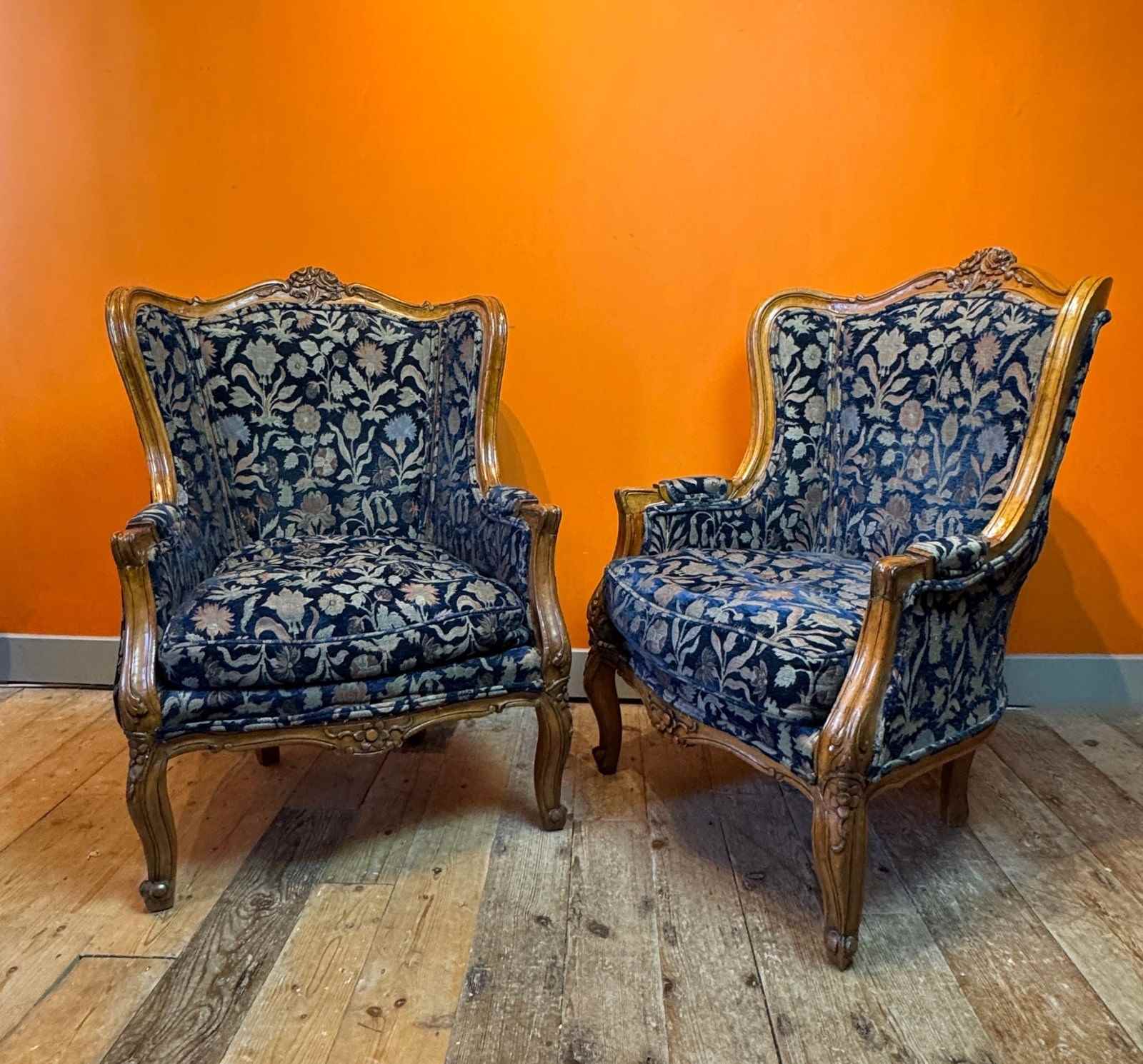 A pair of French 19th century carved walnut armchairs in Louis XV style, upholstered in a navy blue cut chenille foliate tapestry fabric, with feather-filled loose seat cushions.