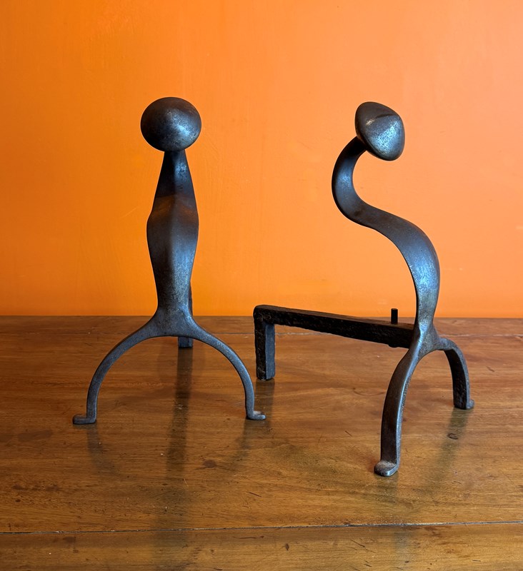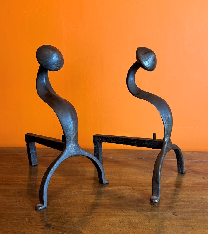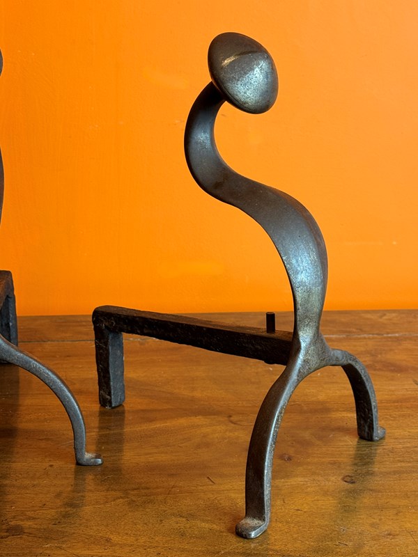 A pair of Arts & Crafts wrought iron andirons of sinuous form, early 20th Century.
