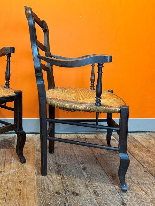 A pair of antique French Provencal ladderback oak armchairs, circa 1900, with rush seats and shaped front stretcher.