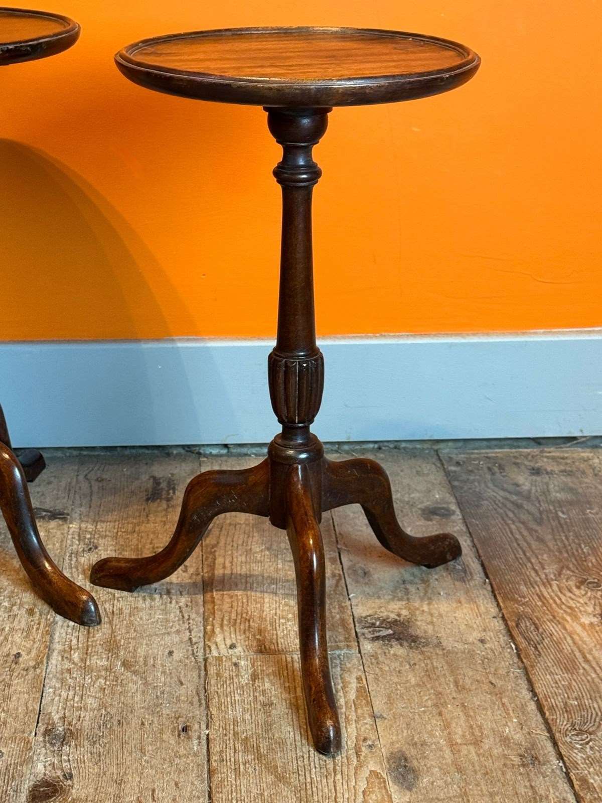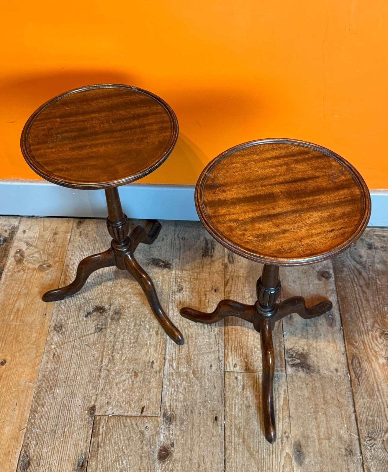 A pair of Georgian style mahogany wine tables, mid 20th Century, the circular tops with a moulded edge upon a turned column and tripod base.